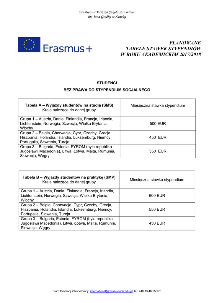 Państwowa Wyższa Szkoła Zawodowa im. Jana Grodka w Sanoku PLANOWANE TABELE STAWEK STYPENDIÓW W ROKU AKADEMICKIM 2017/2018 STUDENCI BEZ PRAWA DO STYPENDIUM SOCJALNEGO Tabela A – Wyjazdy studentów na studia (SMS) Kraje należące do danej grupy Grupa 1 – Austria, Dania, Finlandia, Francja, Irlandia, Lichtenstein, Norwegia, Szwecja, Wielka Brytania, Włochy Grupa 2 – Belgia, Chorwacja, Cypr, Czechy, Grecja, Hiszpania, Holandia, Islandia, Luksemburg, Niemcy, Portugalia, Słowenia, Turcja Grupa 3 – Bułgaria, Estonia, FYROM (była republika Jugosławii Macedonia), Litwa, Łotwa, Malta, Rumunia, Słowacja, Węgry Tabela B – Wyjazdy studentów na praktykę (SMP) Kraje należące do danej grupy Grupa 1 – Austria, Dania, Finlandia, Francja, Irlandia, Lichtenstein, Norwegia, Szwecja, Wielka Brytania, Włochy Grupa 2 – Belgia, Chorwacja, Cypr, Czechy, Grecja, Hiszpania, Holandia, Islandia, Luksemburg, Niemcy, Portugalia, Słowenia, Turcja Grupa 3 – Bułgaria, Estonia, FYROM (była republika Jugosławii Macedonia), Litwa, Łotwa, Malta, Rumunia, Słowacja, Węgry Miesięczna stawka stypendium 500 EUR 450 EUR 350 EUR Miesięczna stawka stypendium 600 EUR 550 EUR 450 EUR Biuro Promocji i Współpracy: [email protected], tel: +48 13 46 55 975 Państwowa Wyższa Szkoła Zawodowa im. Jana Grodka w Sanoku STUDENCI Z PRAWEM DO STYPENDIUM SOCJALNEGO Tabela A – Wyjazdy studentów na studia (SMS) Kraje należące do danej grupy Grupa 1 – Austria, Dania, Finlandia, Francja, Irlandia, Lichtenstein, Norwegia, Szwecja, Wielka Brytania, Włochy Grupa 2 – Belgia, Chorwacja, Cypr, Czechy, Grecja, Hiszpania, Holandia, Islandia, Luksemburg, Niemcy, Portugalia, Słowenia, Turcja Grupa 3 – Bułgaria, Estonia, Litwa, Łotwa, Malta, Rumunia, Słowacja, Węgry, była Republika Jugosławii Macedonia (FYROM) Miesięczna stawka stypendium … PLN (=700 EUR) … PLN (=650 EUR) … PLN (=550 EUR) Powyższe kwoty uwzględniają to, że studenci posiadający prawo do stypendium socjalnego otrzymują specjalny dodatek 200 EUR na wyjazdy na studia (rozliczany w złotych). Tabela B – Wyjazdy studentów na praktykę (SMP) Kraje należące do danej grupy Grupa 1 – Austria, Dania, Finlandia, Francja, Irlandia, Lichtenstein, Norwegia, Szwecja, Wielka Brytania, Włochy Grupa 2 – Belgia, Chorwacja, Cypr, Czechy, Grecja, Hiszpania, Holandia, Islandia, Luksemburg, Niemcy, Portugalia, Słowenia, Turcja Grupa 3 – Bułgaria, Estonia, FYROM (była republika Jugosławii Macedonia), Litwa, Łotwa, Malta, Rumunia, Słowacja, Węgry Miesięczna stawka stypendium … PLN (=750 EUR) … PLN (=650 EUR) … PLN (=550 EUR) Biuro Promocji i Współpracy: [email protected], tel: +48 13 46 55 975 Państwowa Wyższa Szkoła Zawodowa im. Jana Grodka w Sanoku STUDENCI Z ORZECZENIEM O NIEPEŁNOSPRAWNOŚCI Tabela A – Wyjazdy studentów na studia (SMS) Kraje należące do danej grupy Grupa 1 – Austria, Dania, Finlandia, Francja, Irlandia, Lichtenstein, Norwegia, Szwecja, Wielka Brytania, Włochy Grupa 2 – Belgia, Chorwacja, Cypr, Czechy, Grecja, Hiszpania, Holandia, Islandia, Luksemburg, Niemcy, Portugalia, Słowenia, Turcja Grupa 3 – Bułgaria, Estonia, Litwa, Łotwa, Malta, Rumunia, Słowacja, Węgry, była Republika Jugosławii Macedonia (FYROM) Tabela B – Wyjazdy studentów na praktykę (SMP) Kraje należące do danej grupy Grupa 1 – Austria, Dania, Finlandia, Francja, Irlandia, Lichtenstein, Norwegia, Szwecja, Wielka Brytania, Włochy Grupa 2 – Belgia, Chorwacja, Cypr, Czechy, Grecja, Hiszpania, Holandia, Islandia, Luksemburg, Niemcy, Portugalia, Słowenia, Turcja Grupa 3 – Bułgaria, Estonia, FYROM (była republika Jugosławii Macedonia), Litwa, Łotwa, Malta, Rumunia, Słowacja, Węgry Miesięczna stawka stypendium … PLN (=500 EUR) … PLN (=450 EUR) … PLN (=350 EUR) Miesięczna stawka stypendium … PLN (=600 EUR) … PLN (=550 EUR) … PLN (=450 EUR) Osoby z orzeczonym stopniem niepełnosprawności mogą ubiegać się o dodatkowe środki (poza powyższymi). Wnioski o dodatkowe fundusze będą składane przez uczestników mobilności do uczelnianego koordynatora programu Erasmus+. Dodatkowo przyznana kwota dofinansowania (przewyższająca stawki określone w tabelach powyżej) będzie rozliczana jako koszty rzeczywiste, czyli wymagające udokumentowania w postaci dowodów finansowych. Koszty powinny być dostosowane do realnych potrzeb związanych z typem niepełnosprawności i oszczędne. Biuro Promocji i Współpracy: [email protected], tel: +48 13 46 55 975 Państwowa Wyższa Szkoła Zawodowa im. Jana Grodka w Sanoku STUDENCI Z PRAWEM DO STYPENDIUM SOCJALNEGO ORAZ Z ORZECZENIEM O NIEPEŁNOSPRAWNOŚCI Tabela A – Wyjazdy studentów na studia (SMS) Kraje należące do danej grupy Grupa 1 – Austria, Dania, Finlandia, Francja, Irlandia, Lichtenstein, Norwegia, Szwecja, Wielka Brytania, Włochy Grupa 2 – Belgia, Chorwacja, Cypr, Czechy, Grecja, Hiszpania, Holandia, Islandia, Luksemburg, Niemcy, Portugalia, Słowenia, Turcja Grupa 3 – Bułgaria, Estonia, Litwa, Łotwa, Malta, Rumunia, Słowacja, Węgry, była Republika Jugosławii Macedonia (FYROM) Miesięczna stawka stypendium … PLN (=700 EUR) … PLN (=650 EUR) … PLN (=550 EUR) Powyższe kwoty uwzględniają to, że studenci posiadający prawo do stypendium socjalnego otrzymują specjalny dodatek 200 EUR na wyjazdy na studia (rozliczany w złotych). Tabela B – Wyjazdy studentów na praktykę (SMP) Kraje należące do danej grupy Grupa 1 – Austria, Dania, Finlandia, Francja, Irlandia, Lichtenstein, Norwegia, Szwecja, Wielka Brytania, Włochy Grupa 2 – Belgia, Chorwacja, Cypr, Czechy, Grecja, Hiszpania, Holandia, Islandia, Luksemburg, Niemcy, Portugalia, Słowenia, Turcja Grupa 3 – Bułgaria, Estonia, FYROM (była republika Jugosławii Macedonia), Litwa, Łotwa, Malta, Rumunia, Słowacja, Węgry Miesięczna stawka stypendium … PLN (=700 EUR) … PLN (=650 EUR) … PLN (=550 EUR) Osoby z orzeczonym stopniem niepełnosprawności mog