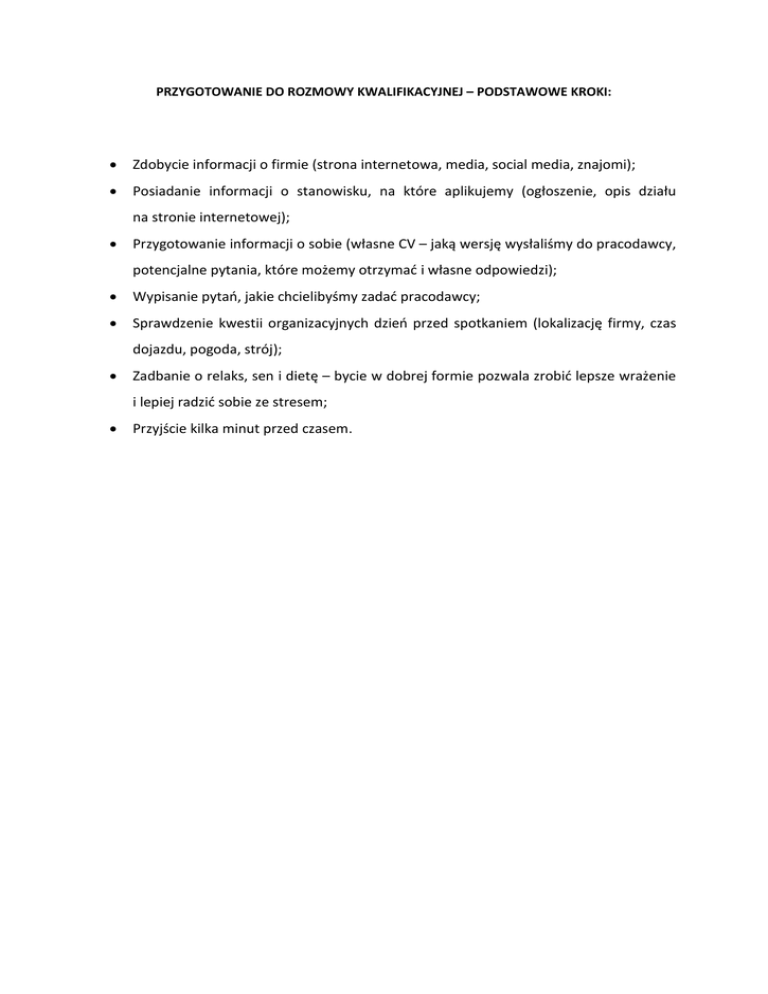 PRZYGOTOWANIE DO ROZMOWY KWALIFIKACYJNEJ – PODSTAWOWE KROKI: Zdobycie informacji o firmie (strona internetowa, media, social media, znajomi); Posiadanie informacji o stanowisku, na które aplikujemy (ogłoszenie, opis działu na stronie internetowej); Przygotowanie informacji o sobie (własne CV – jaką wersję wysłaliśmy do pracodawcy, potencjalne pytania, które możemy otrzymać i własne odpowiedzi); Wypisanie pytań, jakie chcielibyśmy zadać pracodawcy; Sprawdzenie kwestii organizacyjnych dzień przed spotkaniem (lokalizację firmy, czas dojazdu, pogoda, strój); Zadbanie o relaks, sen i dietę – bycie w dobrej formie pozwala zrobić lepsze wrażenie i lepiej radzić sobie ze stresem; Przyjście kilka minut przed czasem.