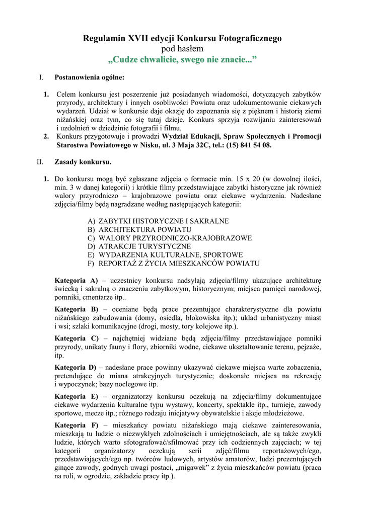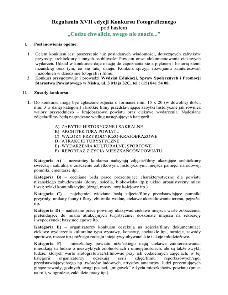 Regulamin XVII edycji Konkursu Fotograficznego pod hasłem „Cudze chwalicie, swego nie znacie...” Postanowienia ogólne: I. 1. 2. II. Celem konkursu jest poszerzenie już posiadanych wiadomości, dotyczących zabytków przyrody, architektury i innych osobliwości Powiatu oraz udokumentowanie ciekawych wydarzeń. Udział w konkursie daje okazję do zapoznania się z pięknem i historią ziemi niżańskiej oraz tym, co się tutaj dzieje. Konkurs sprzyja rozwijaniu zainteresowań i uzdolnień w dziedzinie fotografii i filmu. Konkurs przygotowuje i prowadzi Wydział Edukacji, Spraw Społecznych i Promocji Starostwa Powiatowego w Nisku, ul. 3 Maja 32C, tel.: (15) 841 54 08. Zasady konkursu. 1. Do konkursu mogą być zgłaszane zdjęcia o formacie min. 15 x 20 (w dowolnej ilości, min. 3 w danej kategorii) i krótkie filmy przedstawiające zabytki historyczne jak również walory przyrodniczo – krajobrazowe powiatu oraz ciekawe wydarzenia. Nadesłane zdjęcia/filmy będą nagradzane według następujących kategorii: A) B) C) D) E) F) ZABYTKI HISTORYCZNE I SAKRALNE ARCHITEKTURA POWIATU WALORY PRZYRODNICZO-KRAJOBRAZOWE ATRAKCJE TURYSTYCZNE WYDARZENIA KULTURALNE, SPORTOWE REPORTAŻ Z ŻYCIA MIESZKAŃCÓW POWIATU Kategoria A) – uczestnicy konkursu nadsyłają zdjęcia/filmy ukazujące architekturę świecką i sakralną o znaczeniu zabytkowym, historycznym; miejsca pamięci narodowej, pomniki, cmentarze itp.. Kategoria B) – oceniane będą prace prezentujące charakterystyczne dla powiatu niżańskiego zabudowania (domy, osiedla, blokowiska itp.); układ urbanistyczny miast i wsi; szlaki komunikacyjne (drogi, mosty, tory kolejowe itp.). Kategoria C) – najchętniej widziane będą zdjęcia/filmy przedstawiające pomniki przyrody, unikaty fauny i flory, zbiorniki wodne, ciekawe ukształtowanie terenu, pejzaże, itp. Kategoria D) – nadesłane prace powinny ukazywać ciekawe miejsca warte zobaczenia, pretendujące do miana atrakcyjnych turystycznie; doskonałe miejsca na rekreację i wypoczynek; bazy noclegowe itp. Kategoria E) – organizatorzy konkursu oczekują na zdjęcia/filmy dokumentujące ciekawe wydarzenia kulturalne typu wystawy, koncerty, spektakle itp., turnieje, zawody sportowe, mecze itp.; różnego rodzaju inicjatywy obywatelskie i akcje młodzieżowe. Kategoria F) – mieszkańcy powiatu niżańskiego mają ciekawe zainteresowania, mieszkają tu ludzie o niezwykłych zdolnościach i umiejętnościach, ale są także zwykli ludzie, których warto sfotografować/sfilmować przy ich codziennych zajęciach; w tej kategorii organizatorzy oczekują serii zdjęć/filmu reportażowych/ego, przedstawiających/ego np. twórców ludowych, artystów amatorów, ludzi prezentujących ginące zawody, godnych uwagi postaci, „migawek” z życia mieszkańców powiatu (praca na roli, w ogrodzie, zakładzie pracy itp.). Każdy uczestnik sam wybiera kategorię konkursową, w ramach której chce ubiegać się o nagrodę. 1. Każde zdjęcie/film powinno zawierać opis związany z prezentacją na zdjęciu oraz 2. 3. 4. 5. 6. 7. 8. 9. 10. informację dotyczącą wydarzenia, miejsca, osoby, historii danego obiektu itp. Uczestnikiem konkursu może być każdy, kto nadeśle minimum 3 zdjęcia (w danej kategorii) lub film max 10 min (na płycie DVD) dotyczące/cy Powiatu Niżańskiego. W konkursie mogą brać udział jedynie te prace, które nie zdobyły głównej nagrody w żadnym konkursie. Osoby wykonujące zdjęcia aparatem cyfrowym proszone są o dołączenie do zdjęć płyty CD-ROM zawierającej prezentowane zdjęcia, a w przypadku zdjęć robionych aparatem analogowym – kliszę. Zgłoszenie do konkursu jest jednoznaczne z przyjęciem warunków niniejszego regulaminu i oświadczeniem, że fotografie/film złożone na konkurs zostały wykonane osobiście. Udział w konkursie jest jednoznaczny z nieodpłatnym udzieleniem prawa na wykorzystanie zdjęć/filmu (umowa o przeniesienie praw autorskich). Osoby niepełnoletnie dołączają pisemną zgodę rodziców lub opiekunów na udział w konkursie (umowę o przeniesienie praw autorskich podpisują rodzice lub opiekunowie wraz z osobą niepełnoletnią). Prace należy przesłać w terminie do 30 września 2016 roku (data stempla pocztowego) lub doręczyć osobiście do Starostwa Powiatowego w Nisku – Wydział Edukacji, Spraw Społecznych i Promocji, ul. 3 Maja 32C, pok. nr 17, tel. (15) 841 54 08. Do koperty zawierającej zdjęcia/film wraz z opisem, godłem (znakiem) Twórcy oraz wybraną przez siebie kategorią konkursową, należy dołączyć drugą zamkniętą kopertę opatrzoną tym samym godłem, zawierającą dane osobowe (imię, nazwisko, adres, wiek, tel. kontaktowy). Zdjęcia ze znacznikiem czasowym na zdjęciu nie będą oceniane. Rozstrzygnięcie konkursu III. 1. Rozstrzygnięcie konkursu nastąpi w drugiej połowie października 2016 r. 2. Nadesłane przez uczestników konkursu zdjęcia/filmy stają się własnością Starostwa Powiatowego w Nisku i będą prezentowane na wystawie pokonkursowej. 3. Najlepsze prace zostaną nagrodzone. Nagrody przyznawane będą po jednej w każdej kategorii. Jeżeli nadesłane prace nie będą spełniać wymagań konkursowych i oczekiwań Komisji Konkursowej na tyle, by pretendować do nagrody głównej, wówczas Komisja przyzna wyróżnienie lub jedynie uhonoruje uczestnika konkursu dyplomem z podziękowaniem za udział w konkursie. Organizator zastrzega sobie prawo do nie nagradzania nadesłanych prac w ramach wybranej kategorii, jeśli te nie spełnią wymagań zapisanych w regulaminie konkursu. 4. Przy ocenie zdjęć będą brane pod uwagę: 5. artyzm ujęć fotografowanego/filmowanego obiektu odkrywczość (nieznane dotychczas lub nie prezentowane miejsca i obiekty) dobra jakość techniczna ciekawy opis (może być nawet kilka stron) zdjęcia/filmy muszą przedstawiać miejsca, wydarzenia i osoby charakterystyczne dla powiatu Prace konkursowe oceniać będzie powołana w tym celu Komisja K