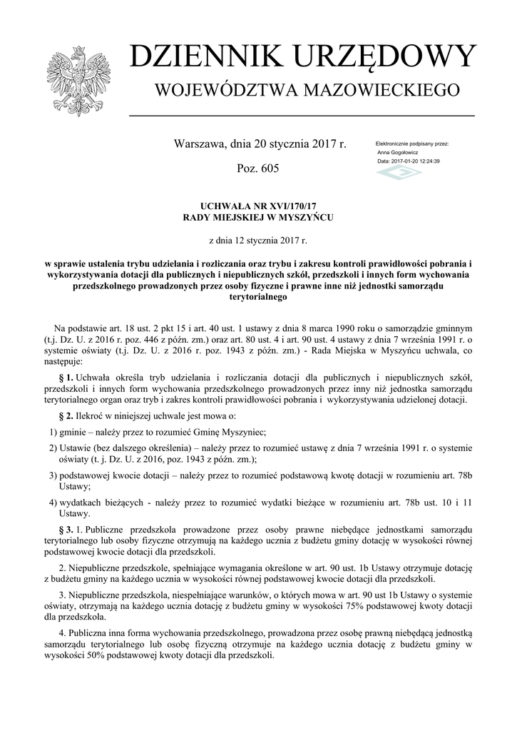 DZIENNIK URZĘDOWY WOJEWÓDZTWA MAZOWIECKIEGO Warszawa, dnia 20 stycznia 2017 r. Elektronicznie podpisany przez: Anna Gogołowicz Poz. 605 Data: 2017-01-20 12:24:39 UCHWAŁA NR XVI/170/17 RADY MIEJSKIEJ W MYSZYŃCU z dnia 12 stycznia 2017 r. w sprawie ustalenia trybu udzielania i rozliczania oraz trybu i zakresu kontroli prawidłowości pobrania i wykorzystywania dotacji dla publicznych i niepublicznych szkół, przedszkoli i innych form wychowania przedszkolnego prowadzonych przez osoby fizyczne i prawne inne niż jednostki samorządu terytorialnego Na podstawie art. 18 ust. 2 pkt 15 i art. 40 ust. 1 ustawy z dnia 8 marca 1990 roku o samorządzie gminnym (t.j. Dz. U. z 2016 r. poz. 446 z późn. zm.) oraz art. 80 ust. 4 i art. 90 ust. 4 ustawy z dnia 7 września 1991 r. o systemie oświaty (t.j. Dz. U. z 2016 r. poz. 1943 z późn. zm.) - Rada Miejska w Myszyńcu uchwala, co następuje: § 1. Uchwała określa tryb udzielania i rozliczania dotacji dla publicznych i niepublicznych szkół, przedszkoli i innych form wychowania przedszkolnego prowadzonych przez inny niż jednostka samorządu terytorialnego organ oraz tryb i zakres kontroli prawidłowości pobrania i wykorzystywania udzielonej dotacji. § 2. Ilekroć w niniejszej uchwale jest mowa o: 1) gminie – należy przez to rozumieć Gminę Myszyniec; 2) Ustawie (bez dalszego określenia) – należy przez to rozumieć ustawę z dnia 7 września 1991 r. o systemie oświaty (t. j. Dz. U. z 2016, poz. 1943 z późn. zm.); 3) podstawowej kwocie dotacji – należy przez to rozumieć podstawową kwotę dotacji w rozumieniu art. 78b Ustawy; 4) wydatkach bieżących - należy przez to rozumieć wydatki bieżące w rozumieniu art. 78b ust. 10 i 11 Ustawy. § 3. 1. Publiczne przedszkola prowadzone przez osoby prawne niebędące jednostkami samorządu terytorialnego lub osoby fizyczne otrzymują na każdego ucznia z budżetu gminy dotację w wysokości równej podstawowej kwocie dotacji dla przedszkoli. 2. Niepubliczne przedszkole, spełniające wymagania określone w art. 90 ust. 1b Ustawy otrzymuje dotację z budżetu gminy na każdego ucznia w wysokości równej podstawowej kwocie dotacji dla przedszkoli. 3. Niepubliczne przedszkola, niespełniające warunków, o których mowa w art. 90 ust 1b Ustawy o systemie oświaty, otrzymają na każdego ucznia dotację z budżetu gminy w wysokości 75% podstawowej kwoty dotacji dla przedszkola. 4. Publiczna inna forma wychowania przedszkolnego, prowadzona przez osobę prawną niebędącą jednostką samorządu terytorialnego lub osobę fizyczną otrzymuje na każdego ucznia dotację z budżetu gminy w wysokości 50% podstawowej kwoty dotacji dla przedszkoli. Dziennik Urzędowy Województwa Mazowieckiego –2– Poz. 605 5. Niepubliczna inna forma wychowania przedszkolnego, spełniająca warunki o których mowa w art. 90 ust. 1c Ustawy otrzymuje na każdego ucznia z budżetu gminy dotację w wysokości 50% podstawowej kwoty dotacji dla przedszkoli. 6. Niepubliczna inna forma wychowania przedszkolnego niespełniająca warunków, o których mowa w art. 90 ust. 1c Ustawy otrzymuje na każdego ucznia dotację z budżetu gminy w wysokości 40% podstawowej kwoty dotacji dla przedszkoli. 7. Prowadzone przez osoby prawne niebędące jednostkami samorządu terytorialnego lub osoby fizyczne publiczne szkoły, w których jest realizowany obowiązek szkolny, otrzymują na każdego ucznia dotację z budżetu gminy w wysokości równej podstawowej kwocie dotacji dla szkół danego typu i rodzaju, nie niższej niż kwota przewidziana na takiego ucznia w części oświatowej subwencji ogólnej dla gminy. 8. Szkoły niepubliczne o uprawnieniach szkół publicznych, w których jest realizowany obowiązek szkolny, otrzymują na każdego ucznia dotację z budżetu Gminy Myszyniec w wysokości nie niższej niż kwota przewidziana na takiego ucznia w części oświatowej subwencji ogólnej dla jednostki samorządu terytorialnego. 9. Prowadzone przez osoby prawne niebędące jednostkami samorządu terytorialnego lub osoby fizyczne publiczne szkoły podstawowe, w których zorganizowano oddział przedszkolny otrzymują na każdego ucznia tego oddziału przedszkolnego z budżetu gminy dotację w wysokości równej podstawowej kwocie dotacji dla szkół podstawowych, w których zorganizowano oddział przedszkolny. 10. Niepubliczna szkoła podstawowa, w której zorganizowano oddział przedszkolny, spełniająca wymagania określone w art. 90 ust. 1ba Ustawy otrzymuje na każdego ucznia tego oddziału przedszkolnego z budżetu gminy dotację w wysokości równej podstawowej kwocie dotacji dla szkół podstawowych, w których zorganizowano oddział przedszkolny. 11. Niepubliczne szkoły podstawowe, w których zorganizowano oddział przedszkolny, niespełniające warunków, o których mowa w art. 90 ust. 1ba Ustawy otrzymują na każdego ucznia tego oddziału przedszkolnego z budżetu gminy dotację w wysokości nie niższej niż 75% podstawowej kwoty dotacji dla szkół podstawowych, w których zorganizowano oddział przedszkolny. 12. Publiczne i niepubliczne: przedszkola, inne formy wychowania przedszkolnego oraz szkoły podstawowe, które prowadzą wczesne wspomaganie rozwoju dziecka, otrzymują na każde dziecko objęte wczesnym wspomaganiem rozwoju, niezależnie od dotacji o której mowa w § 3 ust. 1-11 niniejszej uchwały dotację z budżetu gminy w wysokości nie niższej niż kwota przewidziana na takie dziecko objęte wczesnym wspomaganiem rozwoju w części oświatowej subwencji ogólnej dla gminy. 13. Dotacja z budżetu gminy na każdego ucznia niepełnosprawnego jest równa kwocie przewidzianej odpowiednio na niepełnosprawnego ucznia w części oświatowej subwencji ogólnej dla gminy. § 4. W przypadku zmiany wysokości wydatków bieżących, ustalonych w budżecie na utrzymanie ucznia w gminnych szkołach, oddziałach przedszkolnych przy szkołach podstawowych lub przedszkolach publicznych ulegają również zmiani