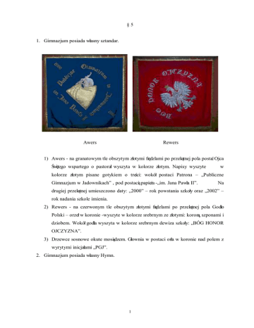 §5 1. Gimnazjum posiada własny sztandar. Awers Rewers 1) Awers - na granatowym tle obszytym złotymi frędzlami po przekątnej pola postać Ojca Świętego wspartego o pastorał wyszyta w kolorze złotym. Napisy wyszyte w kolorze złotym pisane gotykiem o treści: wokół postaci Patrona – „Publiczne Gimnazjum w Jadownikach” , pod postacią papieża -„im. Jana Pawła II”. Na drugiej przekątnej umieszczono daty: „2000” – rok powstania szkoły oraz „2002” – rok nadania szkole imienia. 2) Rewers - na czerwonym tle obszytym złotymi frędzlami po przekątnej pola Godło Polski – orzeł w koronie -wyszyte w kolorze srebrnym ze złotymi: koroną, szponami i dziobem. Wokół godła wyszyta w kolorze srebrnym dewiza szkoły: „BÓG HONOR OJCZYZNA”. 3) Drzewce sosnowe okute mosiądzem. Głownia w postaci orła w koronie nad polem z wyrytymi inicjałami „PGJ”. 2. Gimnazjum posiada własny Hymn. 1 HYMN PUBLICZNEGO GIMNAZJUM im. JANA PAWŁA II w JADOWNIKACH 1. Wielki Patron naszej szkoły Wielki człowiek, jeden z nas, Świeci blaskiem swego życia Dziś i w każdy czas (bis) 2. Uczyń życie swoje pięknym Dbaj o cały wokół świat, Nie zapomnij prawdy wszelkiej Która szczęście Ci da (bis) muz. i sł.: Piotr Szyc 1. Gimnazjum posiada swoje barwy, którymi są kolory: żółty, biały, czerwony, niebieski. 2