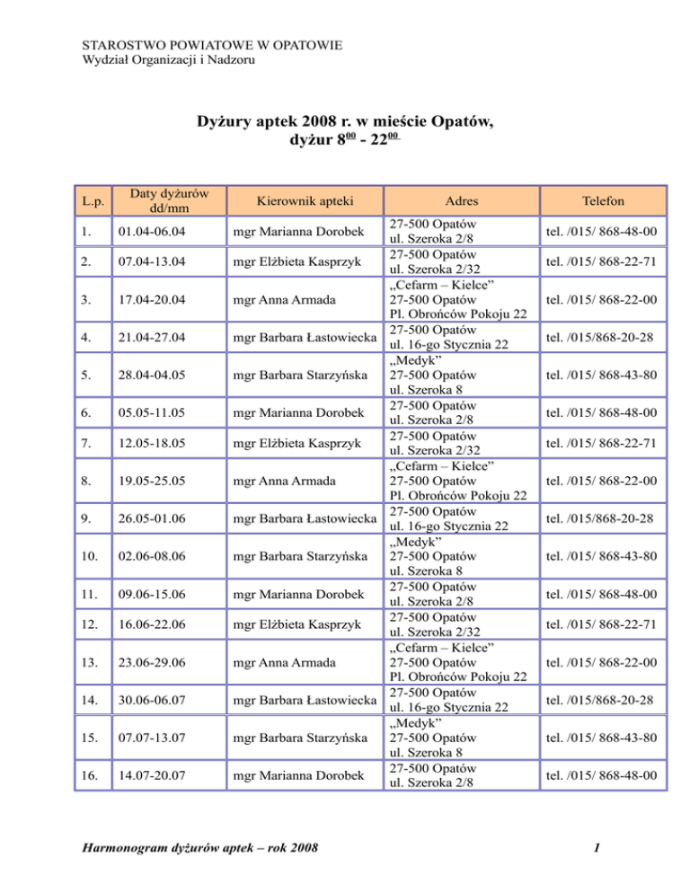 STAROSTWO POWIATOWE W OPATOWIE Wydział Organizacji i Nadzoru Dyżury aptek 2008 r. w mieście Opatów, dyżur 800 - 2200 L.p. Daty dyżurów dd/mm 1. 01.04-06.04 2. 07.04-13.04 3. 17.04-20.04 4. 21.04-27.04 5. 28.04-04.05 6. 05.05-11.05 7. 12.05-18.05 8. 19.05-25.05 9. 26.05-01.06 10. 02.06-08.06 11. 09.06-15.06 12. 16.06-22.06 13. 23.06-29.06 14. 30.06-06.07 15. 07.07-13.07 16. 14.07-20.07 Kierownik apteki Adres 27-500 Opatów ul. Szeroka 2/8 27-500 Opatów mgr Elżbieta Kasprzyk ul. Szeroka 2/32 „Cefarm – Kielce” mgr Anna Armada 27-500 Opatów Pl. Obrońców Pokoju 22 27-500 Opatów mgr Barbara Łastowiecka ul. 16-go Stycznia 22 „Medyk” mgr Barbara Starzyńska 27-500 Opatów ul. Szeroka 8 27-500 Opatów mgr Marianna Dorobek ul. Szeroka 2/8 27-500 Opatów mgr Elżbieta Kasprzyk ul. Szeroka 2/32 „Cefarm – Kielce” mgr Anna Armada 27-500 Opatów Pl. Obrońców Pokoju 22 27-500 Opatów mgr Barbara Łastowiecka ul. 16-go Stycznia 22 „Medyk” mgr Barbara Starzyńska 27-500 Opatów ul. Szeroka 8 27-500 Opatów mgr Marianna Dorobek ul. Szeroka 2/8 27-500 Opatów mgr Elżbieta Kasprzyk ul. Szeroka 2/32 „Cefarm – Kielce” mgr Anna Armada 27-500 Opatów Pl. Obrońców Pokoju 22 27-500 Opatów mgr Barbara Łastowiecka ul. 16-go Stycznia 22 „Medyk” mgr Barbara Starzyńska 27-500 Opatów ul. Szeroka 8 27-500 Opatów mgr Marianna Dorobek ul. Szeroka 2/8 mgr Marianna Dorobek Harmonogram dyżurów aptek – rok 2008 Telefon tel. /015/ 868-48-00 tel. /015/ 868-22-71 tel. /015/ 868-22-00 tel. /015/868-20-28 tel. /015/ 868-43-80 tel. /015/ 868-48-00 tel. /015/ 868-22-71 tel. /015/ 868-22-00 tel. /015/868-20-28 tel. /015/ 868-43-80 tel. /015/ 868-48-00 tel. /015/ 868-22-71 tel. /015/ 868-22-00 tel. /015/868-20-28 tel. /015/ 868-43-80 tel. /015/ 868-48-00 1 STAROSTWO POWIATOWE W OPATOWIE Wydział Organizacji i Nadzoru 17. 21.07-27.07 mgr Elżbieta Kasprzyk 18. 28.07-03.08 mgr Anna Armada 19. 04.08-10.08 mgr Barbara Łastowiecka 20. 11.08-17.08 mgr Barbara Starzyńska 21. 18.08-24.08 mgr Marianna Dorobek 22. 25.08-30.08 mgr Elżbieta Kasprzyk 23. 31.08-07.09 mgr Anna Armada 24. 08.09-14.09 mgr Barbara Łastowiecka 25. 15.09-21.09 mgr Barbara Starzyńska 26. 22.09-28.09 mgr Marianna Dorobek 27. 29.09-05.10 mgr Elżbieta Kasprzyk 28. 06.10-12.10 mgr Anna Armada 29. 13.10-19.10 mgr Barbara Łastowiecka 30. 20.10-26.10 mgr Barbara Starzyńska 31. 27.10-02.11 mgr Marianna Dorobek 32. 03.11-09.11 mgr Elżbieta Kasprzyk 33. 10.11-16.11 mgr Anna Armada 34. 17.11-23.11 mgr Barbara Łastowiecka 35. 24.11-30.11 mgr Barbara Starzyńska 36. 01.12-07.12 mgr Marianna Dorobek Harmonogram dyżurów aptek – rok 2008 27-500 Opatów ul. Szeroka 2/32 „Cefarm – Kielce” 27-500 Opatów Pl. Obrońców Pokoju 22 27-500 Opatów ul. 16-go Stycznia 22 „Medyk” 27-500 Opatów ul. Szeroka 8 27-500 Opatów ul. Szeroka 2/8 27-500 Opatów ul. Szeroka 2/32 „Cefarm – Kielce” 27-500 Opatów Pl. Obrońców Pokoju 22 27-500 Opatów ul. 16-go Stycznia 22 „Medyk” 27-500 Opatów ul. Szeroka 8 27-500 Opatów ul. Szeroka 2/8 27-500 Opatów ul. Szeroka 2/32 „Cefarm – Kielce” 27-500 Opatów Pl. Obrońców Pokoju 22 27-500 Opatów ul. 16-go Stycznia 22 „Medyk” 27-500 Opatów ul. Szeroka 8 27-500 Opatów ul. Szeroka 2/8 27-500 Opatów ul. Szeroka 2/32 „Cefarm – Kielce” 27-500 Opatów Pl. Obrońców Pokoju 22 27-500 Opatów ul. 16-go Stycznia 22 „Medyk” 27-500 Opatów ul. Szeroka 8 27-500 Opatów ul. Szeroka 2/8 tel. /015/ 868-22-71 tel. /015/ 868-22-00 tel. /015/868-20-28 tel. /015/ 868-43-80 tel. /015/ 868-48-00 tel. /015/ 868-22-71 tel. /015/ 868-22-00 tel. /015/868-20-28 tel. /015/ 868-43-80 tel. /015/ 868-48-00 tel. /015/ 868-22-71 tel. /015/ 868-22-00 tel. /015/868-20-28 tel. /015/ 868-43-80 tel. /015/ 868-48-00 tel. /015/ 868-22-71 tel. /015/ 868-22-00 tel. /015/868-20-28 tel. /015/ 868-43-80 tel. /015/ 868-48-00 2 STAROSTWO POWIATOWE W OPATOWIE Wydział Organizacji i Nadzoru 37. 08.12-14.12 38. 15.12-21.12 39. 22.12-28.12 40. 29.12-04.01.2009 27-500 Opatów ul. Szeroka 2/32 „Cefarm – Kielce” mgr Anna Armada 27-500 Opatów Pl. Obrońców Pokoju 22 27-500 Opatów mgr Barbara Łastowiecka ul. 16-go Stycznia 22 „Medyk” mgr Barbara Starzyńska 27-500 Opatów ul. Szeroka 8 mgr Elżbieta Kasprzyk tel. /015/ 868-22-71 tel. /015/ 868-22-00 tel. /015/868-20-28 tel. /015/ 868-43-80 Opracował: Wydział Organizacji i Nadzoru Harmonogram dyżurów aptek – rok 2008 3