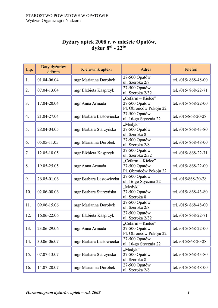 Dyżury aptek 2008 r. w mieście Opatów, dyżur 800