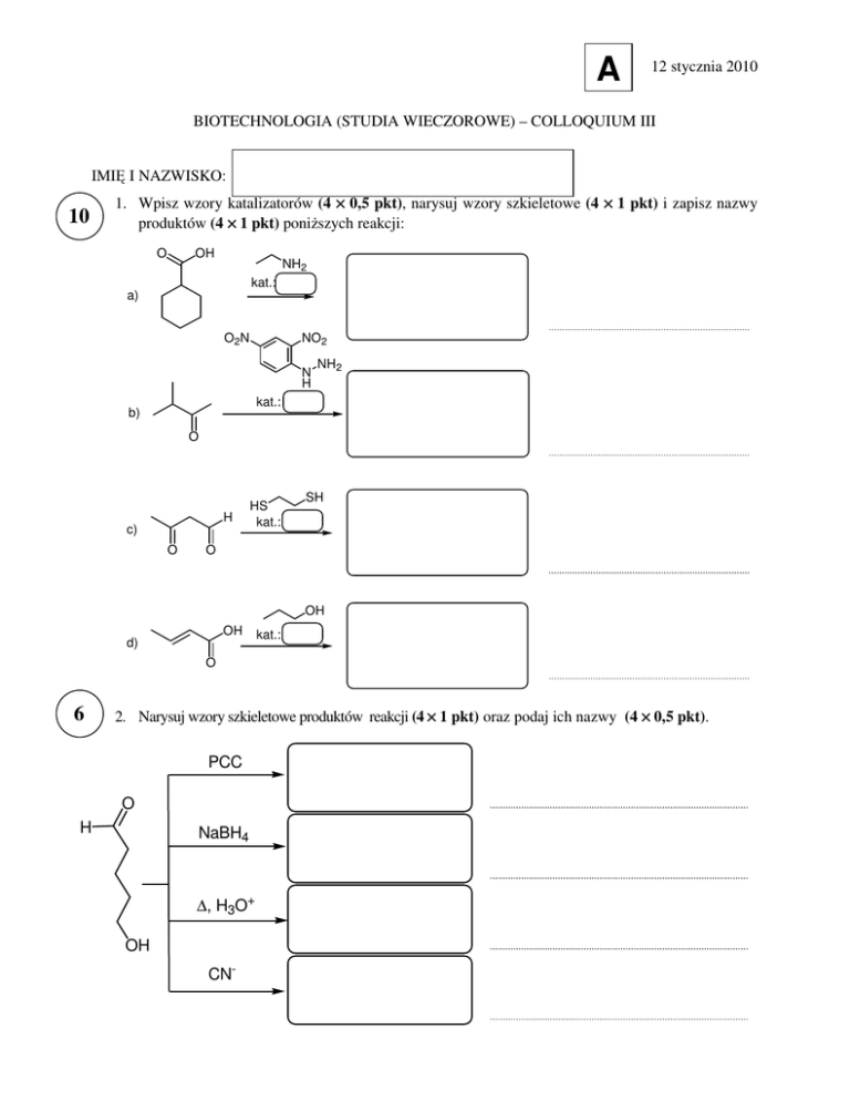 A 12 stycznia 2010 BIOTECHNOLOGIA (STUDIA WIECZOROWE) – COLLOQUIUM III IMIĘ I NAZWISKO: 10 1. Wpisz wzory katalizatorów (4 × 0,5 pkt), narysuj wzory szkieletowe (4 × 1 pkt) i zapisz nazwy produktów (4 × 1 pkt) poniższych reakcji: O OH NH2 kat.: a) O2N NO2 N H NH2 kat.: b) O H c) O HS kat.: SH O OH OH d) kat.: O 6 2. Narysuj wzory szkieletowe produktów reakcji (4 × 1 pkt) oraz podaj ich nazwy (4 × 0,5 pkt). PCC O H NaBH4 ∆, H3O+ OH CN- 6 3. Jaki związek karbonylowy i jaki halogenek alkilowy użyto, aby otrzymać alkohol o podanym wzorze (poprzez związek Grignarda). (4 × 1 pkt) Podaj nazwy tego związku karbonylowego i halogenku. (4 × 0,5 pkt) nazwa halogenku: .................................................... OH + nazwa związku karbonylowego: .................................................... nazwa halogenku: .................................................... + nazwa związku karbonylowego: OH .................................................... 6 4. Zapisz wzory szkieletowe substratów lub produktów (czasami może być ich wiele!) reakcji: (3 × 2 pkt): CHO CHO OH- + O OH- HCHO 15 ∆ 50% KOH 5. Uzupełnij wzory szkieletowe związków i reagentów (15 × 1 pkt). 1. Mg/eter 2. 3. H2O/H+ OH + PCC NH2 H N HO O CN CH3NH2 Cl I2 / OHO H2N H2N O 4 6. Uszereguj kwasy pod względem wzrastającej mocy (4 × 0,5 pkt): α-bromomasłowy, octowy, trifluorooctowy, izomasłowy. (Narysuj w odpowiedniej kolejności ich wzory – 4 × 0,5 pkt). 5,5 7. Uporządkuj aminy pod względem wzrastającej zasadowości (4 × 0,5 pkt) (narysuj w kratkach wzory (4 × 1 pkt) w odpowiedniej kolejności): N-etylo-N’-metylopropyloamina; N, pdimetyloanilina; o-toluidyna; izobutyloamina. 7,5 8. Podaj trzy sposoby otrzymania benzyloaminy. Zapisz wzory szkieletowe substratów , podaj wzory reagentów i warunki reakcji (3 × 2,5 pkt). NH2 Σ = 60 pkt; 60% = 36 pkt.