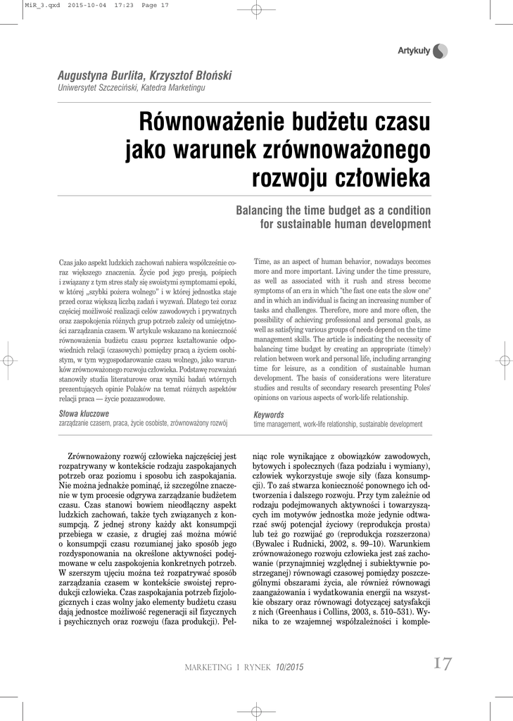 MiR_3.qxd 2015-10-04 17:23 Page 17 Artykuły Augustyna Burlita, Krzysztof Błoński Uniwersytet Szczeciński, Katedra Marketingu Równoważenie budżetu czasu jako warunek zrównoważonego rozwoju człowieka Balancing the time budget as a condition for sustainable human development Czas jako aspekt ludzkich zachowań nabiera współcześnie coraz większego znaczenia. Życie pod jego presją, pośpiech i związany z tym stres stały się swoistymi symptomami epoki, w której „szybki pożera wolnego” i w której jednostka staje przed coraz większą liczbą zadań i wyzwań. Dlatego też coraz częściej możliwość realizacji celów zawodowych i prywatnych oraz zaspokojenia różnych grup potrzeb zależy od umiejętności zarządzania czasem. W artykule wskazano na konieczność równoważenia budżetu czasu poprzez kształtowanie odpowiednich relacji (czasowych) pomiędzy pracą a życiem osobistym, w tym wygospodarowanie czasu wolnego, jako warunków zrównoważonego rozwoju człowieka. Podstawę rozważań stanowiły studia literaturowe oraz wyniki badań wtórnych prezentujących opinie Polaków na temat różnych aspektów relacji praca — życie pozazawodowe. Time, as an aspect of human behavior, nowadays becomes more and more important. Living under the time pressure, as well as associated with it rush and stress become symptoms of an era in which "the fast one eats the slow one" and in which an individual is facing an increasing number of tasks and challenges. Therefore, more and more often, the possibility of achieving professional and personal goals, as well as satisfying various groups of needs depend on the time management skills. The article is indicating the necessity of balancing time budget by creating an appropriate (timely) relation between work and personal life, including arranging time for leisure, as a condition of sustainable human development. The basis of considerations were literature studies and results of secondary research presenting Poles' opinions on various aspects of work-life relationship. Słowa kluczowe Keywords zarządzanie czasem, praca, życie osobiste, zrównoważony rozwój time management, work-life relationship, sustainable development Zrównoważony rozwój człowieka najczęściej jest rozpatrywany w kontekście rodzaju zaspokajanych potrzeb oraz poziomu i sposobu ich zaspokajania. Nie można jednakże pominąć, iż szczególne znaczenie w tym procesie odgrywa zarządzanie budżetem czasu. Czas stanowi bowiem nieodłączny aspekt ludzkich zachowań, także tych związanych z konsumpcją. Z jednej strony każdy akt konsumpcji przebiega w czasie, z drugiej zaś można mówić o konsumpcji czasu rozumianej jako sposób jego rozdysponowania na określone aktywności podejmowane w celu zaspokojenia konkretnych potrzeb. W szerszym ujęciu można też rozpatrywać sposób zarządzania czasem w kontekście swoistej reprodukcji człowieka. Czas zaspokajania potrzeb fizjologicznych i czas wolny jako elementy budżetu czasu dają jednostce możliwość regeneracji sił fizycznych i psychicznych oraz rozwoju (faza produkcji). Peł- niąc role wynikające z obowiązków zawodowych, bytowych i społecznych (faza podziału i wymiany), człowiek wykorzystuje swoje siły (faza konsumpcji). To zaś stwarza konieczność ponownego ich odtworzenia i dalszego rozwoju. Przy tym zależnie od rodzaju podejmowanych aktywności i towarzyszących im motywów jednostka może jedynie odtwarzać swój potencjał życiowy (reprodukcja prosta) lub też go rozwijać go (reprodukcja rozszerzona) (Bywalec i Rudnicki, 2002, s. 99–10). Warunkiem zrównoważonego rozwoju człowieka jest zaś zachowanie (przynajmniej względnej i subiektywnie postrzeganej) równowagi czasowej pomiędzy poszczególnymi obszarami życia, ale również równowagi zaangażowania i wydatkowania energii na wszystkie obszary oraz równowagi dotyczącej satysfakcji z nich (Greenhaus i Collins, 2003, s. 510–531). Wynika to ze wzajemnej współzależności i komple- MARKETING I RYNEK 10/2015 17 MiR_3.qxd 2015-10-04 17:23 Page 18 Artykuły mentarności poszczególnych sfer ludzkiego życia i kształtuje jego jakość. Celem publikacji jest zwrócenie uwagi na problemy zarządzania budżetem czasu, w tym szczególnie kształtowania relacji: praca zawodowa — życie osobiste oraz posiadania i wykorzystania czasu wolnego w kontekście wpływu na możliwości zrównoważonego rozwoju człowieka. Rozważania teoretyczne w artykule oparte na studiach literaturowych uzupełniono wynikami badań wtórnych, w tym publikacji statystycznych, diagnozy społecznej oraz badań Europejskiego Sondażu Socjologicznego (ESS) i Europejskiego Badania Jakości Życia (EQLS), charakteryzujących opinie Polaków na temat wybranych aspektów relacji pomiędzy pracą zawodowa a życiem pozazawodowym, w tym czasem wolnym, jako warunkami zrównoważonego rozwoju i determinantami jakości życia. Relacja pomiędzy pracą a życiem pozazawodowym jako bariera zrównoważonego rozwoju człowieka Struktura budżetu czasu człowieka jest rezultatem wielu najczęściej powiązanych ze sobą uwarunkowań, zarówno subiektywnych i obiektywnych, jak też wewnętrznych i zewnętrznych, a wynikających m.in. z potrzeb, przyjętego systemu wartości, cech demograficznych oraz sytuacji zawodowej i ekonomicznej. Ale wpływ na nią ma również zróżnicowany stopień swobody wyboru poszczególnych zajęć. Generalnie na podstawie relacji „stopień przymusu — stopień swobody wyboru” można wyróżnić w budżecie czasu zajęcia (Cieloch, Kuczyński i Rogoziński, 1992, s. 21–24): z charakteryzujące się wysokim stopniem przymusu ich wykonywania (segment A); z wysokim stopniu obowiązkowości niezwiązanej z pracą zawodową lub też podejmowane wskutek presji ekonomicznej (segment B); z związane z czasem swobodnej decyzji, niemające za główny cel wytwarzania korzyści, tylko motywowane np. potrzebami poznawczymi czy zapobiegl