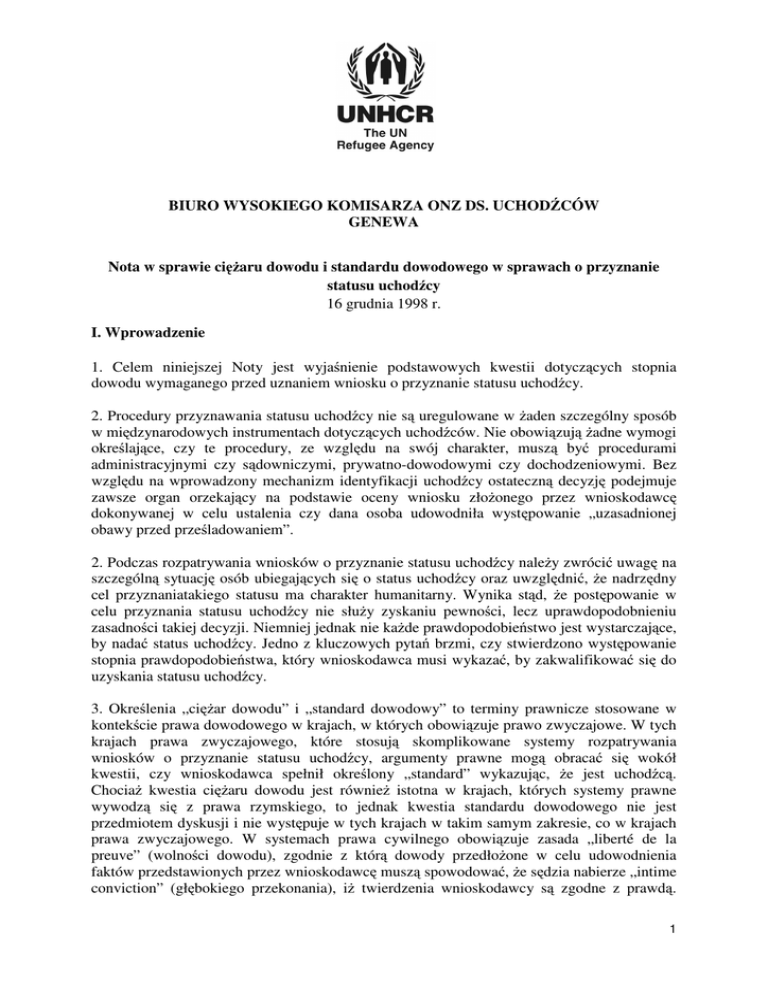 BIURO WYSOKIEGO KOMISARZA ONZ DS. UCHODŹCÓW GENEWA Nota w sprawie ciężaru dowodu i standardu dowodowego w sprawach o przyznanie statusu uchodźcy 16 grudnia 1998 r. I. Wprowadzenie 1. Celem niniejszej Noty jest wyjaśnienie podstawowych kwestii dotyczących stopnia dowodu wymaganego przed uznaniem wniosku o przyznanie statusu uchodźcy. 2. Procedury przyznawania statusu uchodźcy nie są uregulowane w żaden szczególny sposób w międzynarodowych instrumentach dotyczących uchodźców. Nie obowiązują żadne wymogi określające, czy te procedury, ze względu na swój charakter, muszą być procedurami administracyjnymi czy sądowniczymi, prywatno-dowodowymi czy dochodzeniowymi. Bez względu na wprowadzony mechanizm identyfikacji uchodźcy ostateczną decyzję podejmuje zawsze organ orzekający na podstawie oceny wniosku złożonego przez wnioskodawcę dokonywanej w celu ustalenia czy dana osoba udowodniła występowanie „uzasadnionej obawy przed prześladowaniem”. 2. Podczas rozpatrywania wniosków o przyznanie statusu uchodźcy należy zwrócić uwagę na szczególną sytuację osób ubiegających się o status uchodźcy oraz uwzględnić, że nadrzędny cel przyznaniatakiego statusu ma charakter humanitarny. Wynika stąd, że postępowanie w celu przyznania statusu uchodźcy nie służy zyskaniu pewności, lecz uprawdopodobnieniu zasadności takiej decyzji. Niemniej jednak nie każde prawdopodobieństwo jest wystarczające, by nadać status uchodźcy. Jedno z kluczowych pytań brzmi, czy stwierdzono występowanie stopnia prawdopodobieństwa, który wnioskodawca musi wykazać, by zakwalifikować się do uzyskania statusu uchodźcy. 3. Określenia „ciężar dowodu” i „standard dowodowy” to terminy prawnicze stosowane w kontekście prawa dowodowego w krajach, w których obowiązuje prawo zwyczajowe. W tych krajach prawa zwyczajowego, które stosują skomplikowane systemy rozpatrywania wniosków o przyznanie statusu uchodźcy, argumenty prawne mogą obracać się wokół kwestii, czy wnioskodawca spełnił określony „standard” wykazując, że jest uchodźcą. Chociaż kwestia ciężaru dowodu jest również istotna w krajach, których systemy prawne wywodzą się z prawa rzymskiego, to jednak kwestia standardu dowodowego nie jest przedmiotem dyskusji i nie występuje w tych krajach w takim samym zakresie, co w krajach prawa zwyczajowego. W systemach prawa cywilnego obowiązuje zasada „liberté de la preuve” (wolności dowodu), zgodnie z którą dowody przedłożone w celu udowodnienia faktów przedstawionych przez wnioskodawcę muszą spowodować, że sędzia nabierze „intime conviction” (głębokiego przekonania), iż twierdzenia wnioskodawcy są zgodne z prawdą. 1 Mimo tych różnic, i mimo, że te terminy prawa zwyczajowego mają charakter techniczny i szczególne znaczenie w niektórych krajach, te standardy dowodowe są stosowane powszechnie w uzasadnianiu wniosków uchodźców bez względu na miejsce postępowania, także przed UNHCR. Dlatego wytyczne przedstawione w niniejszym dokumencie należy traktować jako obowiązujące w stosunku do wszystkich wniosków o przyznanie statusu uchodźcy. 4. W niniejszej Nocie zbadano kwestie dotyczące ciężaru dowodu i standardu dowodowego mające zastosowanie w normalnych procedurach służących przyznawaniu statusu uchodźcy, w toku których bada się zasadność wniosków o przyznanie takiego statusu. Kwestie dotyczące ciężaru dowodu i standardu dowodowego w postępowaniach przyspieszonych lub uproszczonych omówionow odrębnym memorandum międzybiurowym/biura terenowego (IOM-FOM). II. Ciężar dowodu 5. Fakty uzasadniające wniosek o przyznanie statusu uchodźcyustala się na podstawie dowodów przytoczonych na poparcie deklarowanych okoliczności sprawy. Dowody mogą być przedstawiane ustnie lub w formie dokumentów. Obowiązek przedstawienia dowodów w celu pozytywnego potwierdzenia domniemanych faktów określa się jako „ciężar dowodu”. 6. Zgodnie z ogólnymi zasadami prawnymi prawa dowodowego ciężar dowodu spoczywa na osobie składającej oświadczenie. Dlatego w sprawach dotyczących wniosków o przyznanie statusu uchodźcy to na wnioskodawcy spoczywa ciężar wykazania prawdziwości jego stwierdzeń i rzetelności faktów, na których opiera się wniosek uchodźcy. Wymóg ciężaru dowodu zostaje spełniony przez wnioskodawcę poprzez podanie prawdziwego stanu faktycznego dotyczącego wniosku tak, aby umożliwić wydanie prawidłowej decyzji na podstawie faktów. W świetle szczególnej sytuacji uchodźcy obowiązek ustalenia i oceny wszystkich istotnych faktów spoczywa częściowona orzekającym. Osiąga się to, w dużej mierze, poprzez poznanie przez orzekającego obiektywnej sytuacji w przedmiotowym kraju pochodzenia, zapoznanie się przez niego z istotnymi powszechnie znanymi informacjami, pomoc udzielaną wnioskodawcy w celu uzyskania właściwych informacji oraz odpowiednią weryfikację domniemanych faktów, które można potwierdzić. III. Standard dowodowy –zasady ogólne i problemy z definicją 7. W kontekście obowiązku wnioskodawcy udowodnienia faktów przedstawionych na potwierdzenie jego wniosku, określenie „standard dowodowy” oznacza próg, jaki musi osiągnąć wnioskodawca przekonując orzekającego co do prawdziwości przekazanych przez wnioskodawcę faktów. Fakty, które trzeba „udowodnić”, to te, które dotyczą historii i osobistych doświadczeń wnioskodawcy, które rzekomo doprowadziły do powstania obawy przed prześladowaniem i wynikającej stąd niechęci do skorzystania z opieki państwa pochodzenia. 8. W krajach prawa zwyczajowego prawo dowodowe dotyczące oskarżeń w postępowaniach karnych wymaga przedstawienia dowodów potwierdzających twierdzenia „poza uzasadnioną wątpliwość”. W sprawach cywilnych prawo nie wymaga stosowania aż tak wysokiego standardu – orzekający musi raczej podjąć decyzję w sprawie na podstawie „większ