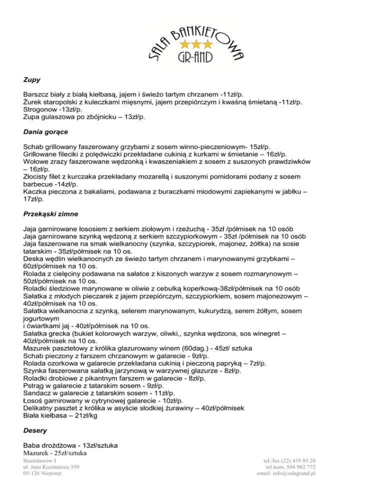 Zupy Barszcz biały z białą kiełbasą, jajem i świeżo tartym chrzanem -11zł/p. Żurek staropolski z kuleczkami mięsnymi, jajem przepiórczym i kwaśną śmietaną -11zł/p. Strogonow -13zł/p. Zupa gulaszowa po zbójnicku – 13zł/p. Dania gorące Schab grillowany faszerowany grzybami z sosem winno-pieczeniowym- 15zł/p. Grillowane fileciki z polędwiczki przekładane cukinią z kurkami w śmietanie – 16zł/p. Wołowe zrazy faszerowane wędzonką i kwaszeniakiem z sosem z suszonych prawdziwków – 16zł/p. Złocisty filet z kurczaka przekładany mozarellą i suszonymi pomidorami podany z sosem barbecue -14zł/p. Kaczka pieczona z bakaliami, podawana z buraczkami miodowymi zapiekanymi w jabłku – 17zł/p. Przekąski zimne Jaja garnirowane łososiem z serkiem ziołowym i rzeżuchą - 35zł /półmisek na 10 osób Jaja garnirowane szynką wędzoną z serkiem szczypiorkowym - 35zł /półmisek na 10 osób Jaja faszerowane na smak wielkanocny (szynka, szczypiorek, majonez, żółtka) na sosie tatarskim - 35zł/półmisek na 10 os. Deska wędlin wielkanocnych ze świeżo tartym chrzanem i marynowanymi grzybkami – 60zł/półmisek na 10 os. Rolada z cielęciny podawana na sałatce z kiszonych warzyw z sosem rozmarynowym – 50zł/półmisek na 10 os. Roladki śledziowe marynowane w oliwie z cebulką koperkową-38zł/półmisek na 10 osób Sałatka z młodych pieczarek z jajem przepiórczym, szczypiorkiem, sosem majonezowym – 40zł/półmisek na 10 os. Sałatka wielkanocna z szynką, selerem marynowanym, kukurydzą, serem żółtym, sosem jogurtowym i ćwiartkami jaj - 40zł/półmisek na 10 os. Sałatka grecka (bukiet kolorowych warzyw, oliwki,, szynka wędzona, sos winegret – 40zł/półmisek na 10 os. Mazurek pasztetowy z królika glazurowany winem (60dag.) - 45zł/ sztuka Schab pieczony z farszem chrzanowym w galarecie - 9zł/p. Rolada ozorkowa w galarecie przekładana cukinią i pieczoną papryką – 7zł/p. Szynka faszerowana sałatką jarzynową w warzywnej glazurze - 8zł/p. Roladki drobiowe z pikantnym farszem w galarecie - 8zł/p. Pstrąg w galarecie z tatarskim sosem - 9zł/p. Sandacz w galarecie z tatarskim sosem - 11zł/p. Łosoś garnirowany w cytrynowej galarecie - 10zł/p. Delikatny pasztet z królika w asyście słodkiej żurawiny – 40zł/półmisek Biała kiełbasa – 21zł/kg Desery Baba drożdżowa - 13zł/sztuka Mazurek - 25zł/sztuka Stanisławów I ul. Jana Kazimierza 350 05-126 Nieporęt tel./fax (22) 435 85 20 tel.kom. 504 982 772 email: [email protected]