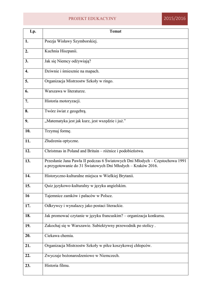 PROJEKT EDUKACYJNY Lp. 2015/2016 Temat 1. Poezja Wisławy Szymborskiej. 2. Kuchnia Hiszpanii. 3. Jak się Niemcy odżywiają? 4. Dziwnie i śmiesznie na mapach. 5. Organizacja Mistrzostw Szkoły w ringo. 6. Warszawa w literaturze. 7. Historia motoryzacji. 8. Twórz świat z geogebrą. 9. „Matematyka jest jak kurz, jest wszędzie i już.” 10. Trzymaj formę. 11. Złudzenia optyczne. 12. Christmas in Poland and Britain – różnice i podobieństwa. 13. Przesłanie Jana Pawła II podczas 6 Światowych Dni Młodych – Częstochowa 1991 a przygotowanie do 31 Światowych Dni Młodych – Kraków 2016. 14. Historyczno-kulturalne miejsca w Wielkiej Brytanii. 15. Quiz językowo-kulturalny w języku angielskim. 16 Tajemnice zamków i pałaców w Polsce. 17. Odkrywcy i wynalazcy jako postaci literackie. 18. Jak promować czytanie w języku francuskim? – organizacja konkursu. 19. Zakochaj się w Warszawie. Subiektywny przewodnik po stolicy . 20. Ciekawa chemia. 21. Organizacja Mistrzostw Szkoły w piłce koszykowej chłopców. 22. Zwyczaje bożonarodzeniowe w Niemczech. 23. Historia filmu. PROJEKT EDUKACYJNY 2015/2016 24. Polscy laureaci Nagrody Nobla. 25. Nasze lektury w grach dydaktycznych. 26. Organizacja szkolnych zawodów w tenisie stołowym. 27. Organizacja Mistrzostw Szkoły w piłce nożnej. 28. Tolerancja- dlaczego warto o nią walczyć? 29. Czy Polska jest krajem atrakcyjnym turystycznie? 30. „My Footprint counts” – ochrona środowiska w wymiarze lokalnym. 31. Antonio Gaudi – czarodziej architektury. 32. Kontuzje sportowe. 33. Skąd się wzięła liczba π? 34. Kuchnia francuska. 35. Szukając ścieżki zawodowej. 36. Maria Skłodowska – Curie – warsztaty historyczne. 37. Życie w Wielkiej Brytanii – wybrane zagadnienia. 38. Polubić poezję. 39. 40. „Nie masz cwaniaka nad warszawiaka…” – folklor stolicy w piosence, filmie i literaturze. Chemia w przemyśle odzieżowym. 41. Sławni fizycy. 42. Matematyka na co dzień. 43. Wielokulturowość Warszawy. 44. 45. Systemy operacyjne stosowane w komputerach stacjonarnych i telefonach komórkowych. Rowerem po Warszawie. 46. Warszawskie pomniki dawniej i dziś.