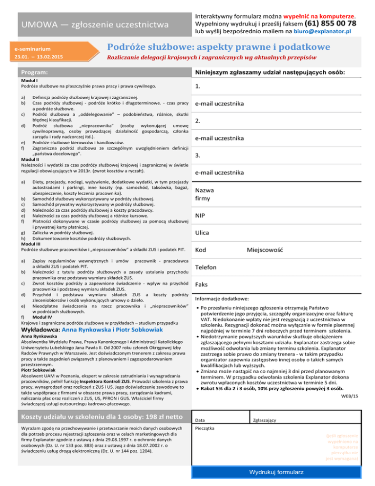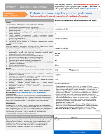 UMOWA — zgłoszenie uczestnictwa Interaktywny formularz można wypełnić na komputerze. Wypełniony wydrukuj i prześlij faksem (61) 855 00 78 lub wyślij bezpośrednio mailem na [email protected] e-seminarium Podróże służbowe: aspekty prawne i podatkowe 23.01. – 13.02.2015 Rozliczanie delegacji krajowych i zagranicznych wg aktualnych przepisów Program: Niniejszym zgłaszamy udział następujących osób: Moduł I Podróże służbowe na płaszczyźnie prawa pracy i prawa cywilnego. 1. a) b) e-mail uczestnika Definicja podróży służbowej krajowej i zagranicznej. Czas podróży służbowej - podróże krótko i długoterminowe. - czas pracy a podróże służbowe. c) Podróż służbowa a „oddelegowanie” – podobieństwa, różnice, skutki błędnej klasyfikacji. d) Podróż służbowa „niepracownika” (osoby wykonującej umowę cywilnoprawną, osoby prowadzącej działalność gospodarczą, członka zarządu i rady nadzorczej itd.). e) Podróże służbowe kierowców i handlowców. f) Zagraniczna podróż służbowa ze szczególnym uwzględnieniem definicji „państwa docelowego”. Moduł II Należności i wydatki za czas podróży służbowej krajowej i zagranicznej w świetle regulacji obowiązujących w 2013r. (zwrot kosztów a ryczałt). Diety, przejazdy, noclegi, wyżywienie, dodatkowe wydatki, w tym przejazdy autostradami i parkingi, inne koszty (np. samochód, taksówka, bagaż, ubezpieczenie, koszty leczenia pracownika). b) Samochód służbowy wykorzystywany w podróży służbowej. c) Samochód prywatny wykorzystywany w podróży służbowej. d) Należności za czas podróży służbowej a koszty pracodawcy. e) Należności za czas podróży służbowej a różnice kursowe. f) Płatności dokonywane w czasie podróży służbowej za pomocą służbowej i prywatnej karty płatniczej. g) Zaliczka w podróży służbowej. h) Dokumentowanie kosztów podróży służbowych. Moduł III Podróże służbowe pracowników i „niepracowników” a składki ZUS i podatek PIT. 2. e-mail uczestnika 3. e-mail uczestnika a) Zapisy regulaminów wewnętrznych i umów pracownik - pracodawca a składki ZUS i podatek PIT. b) Należności z tytułu podróży służbowych a zasady ustalania przychodu pracownika oraz podstawy wymiaru składek ZUS. c) Zwrot kosztów podróży a zapewnione świadczenie - wpływ na przychód pracownika i podstawę wymiaru składek ZUS. d) Przychód i podstawa wymiaru składek ZUS a koszty podróży zleceniobiorców i osób wykonujących umowy o dzieło. e) Nieodpłatne świadczenia na rzecz pracownika i „niepracowników” w podróżach służbowych. f) Moduł IV Krajowe i zagraniczne podróże służbowe w przykładach – studium przypadku Nazwa firmy NIP Ulica Kod Miejscowość a) Wykładowca: Anna Rynkowska i Piotr Sobkowiak Anna Rynkowska Absolwentka Wydziału Prawa, Prawa Kanonicznego i Administracji Katolickiego Uniwersytetu Lubelskiego Jana Pawła II. Od 2007 roku członek Okręgowej Izby Radców Prawnych w Warszawie. Jest doświadczonym trenerem z zakresu prawa pracy a także zagadnień związanych z planowaniem i zagospodarowaniem przestrzennym. Piotr Sobkowiak Absolwent UAM w Poznaniu, ekspert w zakresie zatrudniania i wynagradzania pracowników, pełnił funkcję Inspektora Kontroli ZUS. Prowadzi szkolenia z prawa pracy, wynagrodzeń oraz rozliczeń z ZUS i US. Jego doświadczenie zawodowe to także współpraca z firmami w obszarze prawa pracy, zarządzania kadrami, naliczania płac oraz rozliczeń z ZUS, US, PFRON i GUS. Właściciel firmy świadczącej usługi outsourcingu kadrowo-płacowego. Koszty udziału w szkoleniu dla 1 osoby: 198 zł netto Wyrażam zgodę na przechowywanie i przetwarzanie moich danych osobowych dla potrzeb procesu rejestracji zgłoszenia oraz w celach marketingowych dla firmy Explanator zgodnie z ustawą z dnia 29.08.1997 r. o ochronie danych osobowych (Dz. U. nr 133 poz. 883) oraz z ustawą z dnia 18.07.2002 r. o świadczeniu usług drogą elektroniczną (Dz. U. nr 144 poz. 1204). Telefon Faks Informacje dodatkowe: • Po przesłaniu niniejszego zgłoszenia otrzymają Państwo potwierdzenie jego przyjęcia, szczegóły organizacyjne oraz fakturę VAT. Niedokonanie wpłaty nie jest rezygnacją z uczestnictwa w szkoleniu. Rezygnacji dokonać można wyłącznie w formie pisemnej najpóźniej w terminie 7 dni roboczych przed terminem szkolenia. • Niedotrzymanie powyższych warunków skutkuje obciążeniem zgłaszającego pełnymi kosztami udziału. Explanator zastrzega sobie możliwość odwołania lub zmiany terminu szkolenia. Explanator zastrzega sobie prawo do zmiany trenera - w takim przypadku organizator zapewnia zastępstwo innej osoby o takich samych kwalifikacjach lub wyższych. Zmiana może nastąpić na co najmniej 3 dni przed planowanym terminem. W przypadku odwołania szkolenia Explanator dokona zwrotu wpłaconych kosztów uczestnictwa w terminie 5 dni. Rabat 5% dla 2 i 3 osób, 10% przy zgłoszeniu powyżej 3 osób. WEB/15 Data Zgłaszający Pieczątka (jeśli zgłoszenie wypełniono na komputerze pieczątka nie jest wymagana) Wydrukuj formularz