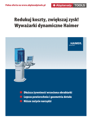Pełna oferta na www.abplanalptools.pl Redukuj koszty, zwiększaj zysk! Wyważarki dynamiczne Haimer Dłuższa żywotność wrzeciona obrabiarki Lepsza powierzchnia i geometria detalu Niższe zużycie narzędzi Pełna oferta na www.abplanalptools.pl REDUKUJ KOSZTY, ZWIĘKSZAJ ZYSK NIEWYWAŻONE NARZĘDZIA SKRACJĄ ŻYWOTNOŚĆ WRZECIONA • Testy przeprowadzone przez firmę HAIMER wskazują, że 1 godzina pracy niewyważonym narzędziem skraca żywotność wrzeciona o 4 godziny. Innymi słowy jeśli używamy niewyważonych narzędzi przez 3 miesiące, będziemy zmuszeni regenerować lub wymienić wrzeciono, 1 rok wcześniej! Jego wymiana jest operacją kosztowną która generuje dodatkowe koszty, ponieważ czeka nas co najmniej kilka dni przestoju maszyny. Oczywiście, takie sytuacje zdarzają się z reguły w momencie największego obłożenia produkcji i napiętych terminach. PRZYKŁAD REDUKCJI KOSZTÓW I ZWIĘKSZENIA ZYSKU DZIĘKI ZASTOSOWANIU WYWAŻANIA (MAT. HAIMER). 45 000 40 000 8 640 € Oszczędność EUR / rok 35 000 5 760 € 30 000 25 000 20 000 2 880 € 25 600 € 28 800 € 3 200 € 2 4 800 € 15 000 10 000 16 000 € 5 000 1 600 € Liczba zmian 1 3 Oszczędność dzięki wydłużeniu żywotności wrzeciona o 100% Zysk dzięki zwiększeniu wydajności skrawania o 10% Oszczędność dzięki wydłużeniu życia narzędzi o 10% Wyważarki dynamiczne oferowane przez firmę HAIMER pozwalają nam pracować bez ryzyka zniszczenia wrzeciona obrabiarki. Co więcej, dzięki zminimalizowaniu bicia promieniowego uzyskujemy dłuższą żywotność narzędzia, a także lepszą powierzchnię i geometrię detalu! WYWAŻARKI HAIMER TD 2009 Testy przeprowadzone przez firmę HAIMER wskazują, że 1 godzina pracy niewyważonym narzędziem skraca żywotność wrzeciona o 4 godziny. ZOBACZ JAK DZIAŁA WYWAŻARKA HAIMER Filtercube 2N 3,0 kW pow. robocza filtrów 2 x 7,8 m2 przeznaczony do odciągu i filtracji pyłu grafitowego Dłuższa żywotność wrzeciona obrabiarki Lepsza powierzchnia i geometria detalu Niższe zużycie narzędzi Kliknij, żeby zobaczyć film Pełna oferta na www.abplanalptools.pl SKONTAKTUJ SIĘ Z NAMI ZOBACZ HAIMER TD 2009 NA WŁASNE OCZY Zapraszamy do obejrzenia praktycznego zastosowania wyważarki HAIMER TD 2009 w naszym Centrum Sprzedażowo – Wystawienniczym w Rzeszowie ADRES Politechnika Rzeszowska Wydział Budowy Maszyn, budynek L ul. Powstańców Warszawy 8 35-959 Rzeszów JESTEŚMY DO DYSPOZYCJI Zachęcamy do kontaktu z naszymi Inżynierami z Działu Narzędzi http://www.abplanalptools.pl/kontakt, zajmującymi się kompleksowym wsparciem w zakresie optymalnego doboru i wykorzystania obrabiarek w produkcji. Abplanalp Sp. z o.o. ul. Kostrzyńska 36 02-979 Warszawa KONTAKT: Tel.: 22 379 44 00 Fax: 22 379 44 90 [email protected] www.abplanalptools.pl
