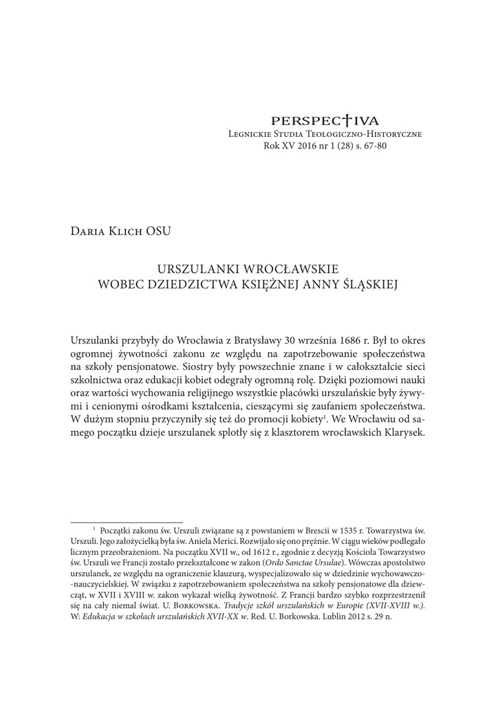 Urszulanki wrocławskie wobec dziedzictwa księżnej Anny Śląskiej 67 PERSPEC†IVA Legnickie Studia Teologiczno-Historyczne Rok XV 2016 nr 1 (28) s. 67-80 Daria Klich OSU URSZULANKI WROCŁAWSKIE WOBEC DZIEDZICTWA KSIĘŻNEJ ANNY ŚLĄSKIEJ Urszulanki przybyły do Wrocławia z Bratysławy 30 września 1686 r. Był to okres ogromnej żywotności zakonu ze względu na zapotrzebowanie społeczeństwa na szkoły pensjonatowe. Siostry były powszechnie znane i w całokształcie sieci szkolnictwa oraz edukacji kobiet odegrały ogromną rolę. Dzięki poziomowi nauki oraz wartości wychowania religijnego wszystkie placówki urszulańskie były żywymi i cenionymi ośrodkami kształcenia, cieszącymi się zaufaniem społeczeństwa. W dużym stopniu przyczyniły się też do promocji kobiety1. We Wrocławiu od samego początku dzieje urszulanek splotły się z klasztorem wrocławskich Klarysek. Początki zakonu św. Urszuli związane są z powstaniem w Brescii w 1535 r. Towarzystwa św. Urszuli. Jego założycielką była św. Aniela Merici. Rozwijało się ono prężnie. W ciągu wieków podlegało licznym przeobrażeniom. Na początku XVII w., od 1612 r., zgodnie z decyzją Kościoła Towarzystwo św. Urszuli we Francji zostało przekształcone w zakon (Ordo Sanctae Ursulae). Wówczas apostolstwo urszulanek, ze względu na ograniczenie klauzurą, wyspecjalizowało się w dziedzinie wychowawczo-nauczycielskiej. W związku z zapotrzebowaniem społeczeństwa na szkoły pensjonatowe dla dziewcząt, w XVII i XVIII w. zakon wykazał wielką żywotność. Z Francji bardzo szybko rozprzestrzenił się na cały niemal świat. U. Borkowska. Tradycje szkół urszulańskich w Europie (XVII-XVIII w.). W: Edukacja w szkołach urszulańskich XVII-XX w. Red. U. Borkowska. Lublin 2012 s. 29 n. 1 Daria Klich OSU 68 1. FUNDACJA URSZULANEK WE WROCŁAWIU Urszulanki z Bratysławy planowały najpierw w 1683 r. założyć klasztor w Kłodzku i tam przez trzy lata rozwijały pracę dydaktyczno-wychowawczą. Grupie przewodziła pochodząca z węgierskiej arystokracji matka Józefa Nadasdy, najpierw wychowanka urszulanek, potem zakonnica. Z powodu trudności finansowych fundacja ta nie miała szans przetrwania, dlatego biskup wrocławski Franciszek Ludwik Neuburg (1683-1732)2 polecił urszulankom osiedlić się we Wrocławiu, mając nadzieję, że przez wychowanie i nauczanie dziewcząt przyczynią się do rekatolicyzacji sprotestantyzowanego miasta3. Wbrew nieprzychylnemu stanowisku protestanckich władz miasta w sprawie ich osiedlenia, urszulanki znalazły wiele życzliwych osób. Od samego początku ich losy splotły się z klasztorem wrocławskich Klarysek. Ksieni klasztoru Klarysek przy Placu Rycerskim4, Wiktoria Rostocka, odstąpiła urszulankom czasowo kilka pomieszczeń. Mieszkały w nich do czerwca 1687 r., prowadząc małą szkołę pensjonatową. We wszystkich najwcześniejszych opisach historii urszulanek we Wrocławiu znajduje się wyrażenie pamięci o wiecznej wdzięczności dla klarysek za ich serdeczną pomoc urszulankom w tym trudnym okresie instalacji we Wrocławiu. Matka Józefa odbyła podróż do Trzebnicy, udała się do grobu św. Jadwigi, by oddać dzieło fundacji patronce Śląska. Napisała prośbę o pozwolenie na osiedlenie się we Wrocławiu do cesarza Leopolda I Habsburga. Pozwolenie nadeszło z datą 14 lutego 1687 r. Po kolejnych staraniach u radnych miasta siostry otrzymały zgodę, którą cesarz zatwierdził pismem z 12 kwietnia 1687 r.5 W tym czasie siostry zakupiły dwa pierwsze budynki na klasztor przez ul. Pokutniczej (dziś Łaciarskiej). Mogły w nich zamieszkać od czerwca 1687 r. Od razu też założyły szkołę pensjonatową dla dziewcząt z wyższych sfer oraz bezpłatną szkołę elementarną dla ubogich dzieci z miasta. Wspólnota rozwijała się prężnie – szybko wzrastała liczba sióstr oraz uczennic. Placówka zdobywała zaufanie społeczeństwa, o czym świadczy duża liczba wstępujących w szeregi urszulanek młodych kobiet, które chciały poświęcić się pracy pedagogicznej. Matka Józefa w latach 1687-1699 (12 lat) przyjęła do klasztoru 33 nowicjuszki6. Od 1693 r. urszulanki rozszerzyły swój klasztor i szkołę, dokupując kolejne, sąsiednie kamienice. W ten sposób klasztor obejmował osiem budynków i tworzył J. Pater. Poczet biskupów wrocławskich. Wrocław 2000. Circulaire nr 1 i 2. Monastère des ursulines de Marseille (exilées de Breslau, Silésie). 12.09.1880. Archiwum Domu Wrocławskiego (dalej: ADW) sygn. C 104 s. 2. 4 Obecnie pl. Nankiera. 5 Circulaire nr 1 i 2 s. 2 n. 6 A. Meer. Zakon urszulanek na Śląsku. Cz. 1: Historia urszulanek wrocławskich. Tł. R. Mazur (mps). ADW sygn. C 112 s. 6. 2 3 Urszulanki wrocławskie wobec dziedzictwa księżnej Anny Śląskiej 69 ciągłą fasadę na ul. Pokutniczej i Nożowniczej aż do narożnika Nowego Targu7. Z powodu dobrej sytuacji personalnej wspólnoty wrocławskiej, w 1700 r. możliwa okazała się fundacja nowego klasztoru urszulańskiego w Świdnicy8. Notatki w kronice z tego czasu świadczą o miłych relacjach urszulanek z konwentem klarysek i o więzach przyjaźni. W 1708 r. powstało w klasztorze Urszulanek bractwo św. Urszuli, któremu papież Klemens XI nadał odpusty. Celem tego pobożnego stowarzyszenia była modlitwa o dobrą śmierć za wstawiennictwem św. Urszuli. W księdze bractwa na samym początku zapisane zostały wszystkie klaryski wrocławskiego klasztoru9. W zajmowanych przez urszulanki budynkach zaczęło brakować miejsca. Po śmierci księżnej Karoliny z dynastii Piastów brzesko-legnickich nadarzyła się okazja zakupienia w 1709 r. pałacu Holsteinów przy ul. Szewskiej10. Tam urszulanki przeniosły siedzibę klasztoru oraz swoje szkoły w dzień św. Jadwigi. W dzień przeprowadzki urszulanki zostały zaproszone na obiad do gościnnego klasztoru św. Klary11. Urszulanki przy ul. Szewskiej ponad 100 lat prowadziły swe szkoły, przeżywając z całym społeczeńs