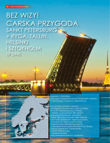 48 www.SeaTours.pl BEZ WIZY! CARSKA PRZYGODA SANKT PETERSBURG + RYGA, TALLIN, HELSINKI i SZTOKHOLM (9 DNI) wyjazd z Gdańska (dla grup zorganizowanych możliwość wyjazdu z dowolnego miasta w całej Polsce) SANKT PETERSBURG TURKU HELSINKI SZTOKHOLM TALLIN RYGA KARLSKRONA GDYNIA GDAŃSK wycieczka z polskim pilotem noclegami na promach oraz w hotelu 3* w St. Petersburg oraz w Rydze i Tallinie; wyżywieniem HB; rejsem luksusowym promem armatora Tallink Silja Line na trasie Tallin-Helsinki oraz Turku-Sztokholm, rejsem promem armatora St. Peter Line na trasie Helsinki-Sankt Petersburg-Helsinki; polskojęzycznym przewodnikiem po Rydze, Tallinie,Helsinkach, Sztokholmie i Sankt Petersburgu; ubezpieczeniem oraz niezapomnianymi widokami CARSKA PRZYGODA - St. Petersburg BEZ WIZY, Ryga, Tallin, Helsinki, Sztokholm (9 dni) TERMINY WYCIECZEK CENA WYCIECZKI 01.07-09.07.2016 25.07-02.08.2016 12.08-20.08.2016 3990 PLN RAMOWY PROGRAM WYCIECZKI 1 DZIEŃ wyjazd z Gdańska - wczesne godziny poranne (Dworzec PKP w Gdańsku Głównym), przejazd przez malownicze Mazury do Rygi zakwaterowanie w hotelu, kolacja w restauracji w hotelu, wieczorny spacer po mieście, nocleg wszystko w cenie Cena za 1 osobę wg załączonego programu 2 DZIEŃ Dla grup zorganizowanych dopasujemy termin wedle życzenia Realizujemy również programy dla małych grup Najmniejsze nawet 4-osobowe O ofertę dla małej grupy zapytaj w naszym biurze 15:00 śniadanie w restauracji w hotelu wykwaterowanie z hotelu, autokarowe i piesze zwiedzanie stolicy Łotwy z przewodnikiem m.in. Stare Miasto, Parlament, Plac Ratuszowy, Plac Katedralny, Szwedzkie Wrota, Statua Wolności przejazd do Tallina, zakwaterowanie w hotelu, kolacja w hotelu, wieczorny spacer po mieście, nocleg 3 DZIEŃ 12:30 13:30-15:30 16:00 18:00 śniadanie w restauracji w hotelu autokarowe i piesze zwiedzanie miasta z przewodnikiem m.in. Stare Miasto, Toompea – punk widokowy, Raekoja Plats - Plac Ratuszowy przejazd na terminal promowy, odprawa biletowa przepłynięcie promem armatora Tallink z Tallina do Helsinek odprawa biletowo-paszportowa na prom do St. Petersburga zaokrętowanie na prom, zakwaterowanie w kabinach wypłynięcie promu armatora St. Peter Line z Helsinek kolacja w restauracji na promie, wieczór atrakcji na promie, nocleg 4 DZIEŃ 07:30-09:00 09:30 śniadanie w restauracji na promie przypłynięcie promu do SANKT PETERSBURGA przejazd z portu do centrum miasta zwiedzanie miasta z przewodnikiem: autokarowy objazd miasta, Sobór Isaakijewskij, Twierdza Pietropawłowska, rejs po Newie, kolacja, nocleg w hotelu 5 DZIEŃ 08:30-10:00 śniadanie w hotelu zwiedzanie Carskiego Sioła z Komnatą Bursztynową wyjazd do PETERHOF – zespół pałacowy z kaskadami fontann z panoramą na Zatokę Fińską, czas wolny, powrót do hotelu, kolacja, nocleg w hotelu 6 DZIEŃ 08:30-10:00 CENA ZAWIERA •4 nocne przepłynięcia promami na trasach Helsinki-St. Petersburg-Helsinki, Turku-Sztokholm, Karlskrona-Gdynia •miejsce w kabinie 2-os. wewnętrznej z łazienką •przepłynięcie promem na trasie Tallin-Helsinki (2 godziny - bez kabiny) •wyżywienie HB na promach i w hotelach: 8 śniadań i 8 obiadokolacji z napojem (w tym 2 kolacje all-inclusive) •1 nocleg w hotelu 3/4* w Rydze w pokoju 2-os. z łazienką •1 nocleg w hotelu 3* w Tallinie w pokoju 2-os. z łazienką •2 noclegi w hotelu 3* w Sankt Petersburgu w pokoju 2-os. z łazienką •opiekę polskiego pilota podczas trwania wycieczki i przewodnika w Rydze, Tallinie, Helsinkach i Sztokholmie •zwiedzanie z polskojęzycznym przewodnikiem w St. Petersburgu, wraz ze zwiedzaniem wnętrz m.in.: Isakievskij Sobór, Carskie Sioło, Twierdza Pietropawłowska, Peterhof, Ermitaż (bilety wstępu dodatkowo płatne patrz poniżej) •wszystkie przeprawy promowe, opłaty portowe, mostowe i tunelowe •autokar podczas trwania wycieczki •ubezpieczenie KL i NNW w Signal Iduna oraz niezapomniane widoki i zabawę na morzu EWENTUALNE DOPŁATY (należy zgłosić podczas rezerwacji wycieczki) •do miejsca w kabinie 2-os. z oknem 300 PLN/os. •do kabiny 1-os. bez okna i pokoju 1-os. 1600 PLN •do kabiny 1-os. z oknem i pokoju 1-os. 2000 PLN (ceny za wszystkie noce na promach i w hotelach) DODATKOWE ŚWIADCZENIA (nieobowiązkowe) (dodatkowe świadczenia należy zarezerwować podczas rezerwacji wycieczki, rezerwacja w późniejszym terminie będzie możliwa w miarę wolnych miejsc) •bilety wstępu: Isakievskij Sobór, Carskie Sioło, Twierdza Pietropawłowska, Peterhof, Ermitaż, rejs po Newie: 450 PLN/os. •wstęp do Muzeum Vasa w Sztokholmie: 65 PLN/os. 16:00 19.00 śniadanie w hotelu wejście do Ermitażu – największego muzeum na świecie przejazd z centrum do portu na prom do Helsinek odprawa paszportowo-biletowa, zaokrętowanie na prom, zakwaterowanie w kabinach wypłynięcie promu armatora St. Peter Line z Sankt Petersburga kolacja w restauracji na promie, wieczór rozrywki, dyskoteka, nocleg 7 DZIEŃ 07:00-08:30 09:00 15:30-18:00 19:00 20:15 śniadanie w restauracji na promie przypłynięcie do HELSINEK zwiedzanie stolicy Finlandii: Plan Senacki, Katedra św. Mikołaja, Sobór Uspieński, Kościół w Skale, Stadion Olimpijski, czas wolny przejazd do TURKU przejazd na terminal promowy odprawa biletowa, zaokrętowanie na prom do Sztokholmu, zakwaterowanie w kabinach wypłynięcie promu armatora Tallink Silja Line z Turku kolacja w restauracji na promie, atrakcje na promie 8 DZIEŃ 05:00-06:00 06:10 07:00-10:00 11.30-19.00 19:00 20:00 śniadanie w restauracji na promie przypłynięcie do SZTOKHOLMU zwiedzanie miasta: Wyspa Rycerska, Muzeum Vasa, Ratusz Sztokholmski, czas wolny przejazd do Karlskrony odprawa biletowa, zaokrętowanie na prom, zakwaterowanie w kabinach, kolacja all-inclusive w restauracji na promie, atrakcje na promie wypłynięcie promu Stena Line z Karlskrony, nocleg 9 DZIEŃ 07:00-08:00 08:30 śniadanie w restauracji na promie przypłynięcie do GDYNI zakończenie wycieczki