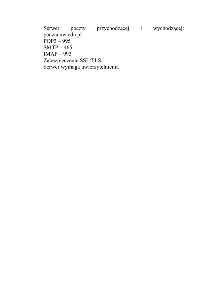 Serwer poczty przychodzącej poczta.uw.edu.pl POP3 – 995 SMTP – 465 IMAP – 993 Zabezpieczenie SSL/TLS Serwer wymaga uwierzytelnienia i wychodzącej: