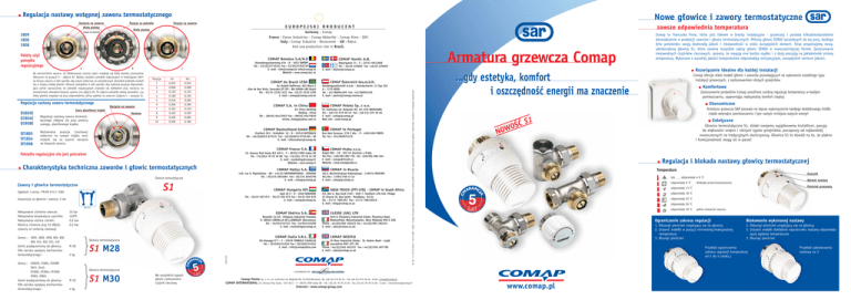 Regulacja nastawy wst´pnej zaworu termostatycznego Pozycja na pokr´tle Nale˝y u˝yç pokr´t∏a regulacyjnego Germany : Comap France : Clesse Industries - Comap Abbeville - Comap Rime - SDH Italy : Comap Industria - Novacomet - UK : Rabco And one production site in Brazil. COMAP Benelux S.A/N.V A B Na mechaniêmie zaworu, na ˝∏obkowanej czarnej cz´Êci znajduje si´ bia∏a plamka (ustawienie fabryczne na pozycji 9 – zdj´cie A). Nale˝y nasadziç pokr´t∏o regulacyjne nr katalogowy 5837 na korpus zaworu w taki sposób, aby wpust widoczny na wewn´trznym obwodzie pokr´t∏a znalaz∏ si´ w miejscu bia∏ej plamki. Obracaç pokr´t∏em w taki sposób, aby wybrana pozycja odpowiadajàca cyfrze zaznaczonej na pokr´tle regulacyjnym znalaz∏a si´ dok∏adnie przy naci´ciu na zewn´trznym obwodzie korpusu zaworu (na zdj´ciu B). Po zdj´ciu pokr´t∏a nale˝y sprawdziç, czy bia∏a plamka znajduje si´ przy odpowiedniej cyfrze wybitej na zaworze (zdj´cie C – pozycja 3). Regulacja nastawy zaworu termostatycznego Naci´cie na zaworze D3805E D3804E D3908E Szary plastikowy krà˝ek Nastawa Regulacja nastawy zaworu termostatycznego odbywa si´ przy pomocy szarego, plastikowego krà˝ka. Alsembergsesteenweg 454 - B - 1653 DWORP Tel. : 32/(0)23710161 Fax : 32/(0)23782339 E. mail : [email protected] [email protected] Website : www.comap.be/.nl C Pozycja 1 2 3 4 5 6 7 8 9 10 Kv 0,025 0,068 0,120 0,180 0,240 0,300 0,365 0,405 0,450 0,500 Kvs 0,025 0,068 0,124 0,195 0,285 0,390 0,510 0,595 0,685 0,780 COMAP do Brasil LTDA Av. Rudolf Dafferner, 601 Bloco F Alto de Boa Vista, Sorocaba SP CEP - BR-18086-380 Brazil Tel. : 55/15 3218 1222 Fax : 55/15 3218 1299 E. mail : [email protected] COMAP S.A. in China Air China Building Beijing - China Tel. : (8610) 84475823 Fax : (8610) 84475820 [email protected] COMAP Deutschland GmbH Nastawiana pozycja (nastawa) widoczna na szarym krà˝ku musi znaleêç si´ na wprost naci´cia na korpusie zaworu. Postfach 301 - Schloßstr. 10 - D - 35510 BUTZBACH Tel. : 49/(0)6033-9725-0 Fax : 49/(0)6033-9725-80 / 90 E. mail : [email protected] COMAP France S.A. 16, Avenue Paul Santy B.P. 8211 - F - 69355 LYON Cedex 08 Tel. : 33/(0)4 78 78 16 00 Fax : 33/(0)4 78 78 15 20 E. mail : [email protected] Website : www.comap.fr Pokr´t∏o regulacyjne nie jest potrzebne Charakterystyka techniczna zaworów i g∏owic termostatycznych COMAP Hellas S.A. 138, rue G. Papandreou - GR - 144.52 METAMORPHOSSI - ATHENES Tel. : 30/210 2842684 Fax : 30/210 2840700 E. mail : [email protected] G∏owice termostatyczne S1 Zawory i g∏owice termostatyczne ZgodnoÊç z normà : PN-EN 215-1: 2002 COMAP Hungaria Kft Gyár út 2 - H - 2040 BUDAÖRS Tel. : 36/23 503 871 - 36/23 503 872 Fax : 36/23 503 870 E. mail : [email protected] Gwarancja na g∏owice i zawory: 5 lat Zawory : 3809, 3808, 3908, 809, 808, 908, 933, 920, 921, 445 Gwint przy∏àczeniowy do g∏owicy: Si∏a nacisku spr´˝yny mechanizmu termostatycznego : Zawory : D3805E, D3804, D3908E D921, D445, SF3805, SF3804, SF3908 SF805, SF804 Gwint przy∏àczeniowy do g∏owicy: Si∏a nacisku spr´˝yny mechanizmu termostatycznego : 10 bar 120oC 0,6 bar 0,2 bar COMAP Ibérica S.A. Rosselló 14/18 - Polígono Industrial Famades E- 08940 CORNELLÀ DE LLOBREGAT (Barcelona) Tel. : 34/934742722 Fax : 34/934742290 E. mail : [email protected] COMAP Italia S.R.L. G∏owica termostatyczna M 28 Via Rassega N°1 - I - 25030 TORBOLE CASAGLIA Tel. : 39/0302151024 Fax : 39/0302151023 E. mail : [email protected] S1 M28 2 kg 05/07/05 Maksymalne ciÊnienie robocze: Maksymalna temperatura czynnika: Maksymalna ró˝nica ciÊnieƒ: Ró˝nica ciÊnienia przy 25 dB(A): (zawory ze zmiennà nastawà) zawsze odpowiednia temperatura EUROPEJSKI RRODUCENT Bia∏a plamka (wpust na zaworze) 3809 3808 3908 SF3805 SF3804 SF3908 Pozycja na zaworze Armatura grzewcza Comap COMAP Nordic A.B. Mejerigatan 31 - S - 23531 VELLINGE Tel. : 46/40 429660 Fax : 46/40 429669 E. mail : [email protected] COMAP Österreich Ges.m.b.H. Handelsgesellschaft m.b.H. - Dornbacherstr. 21 Top 202 A - 1170 WIEN Tel. : 43/186994160 Fax : 43/186994165 E. mail : [email protected] COMAP Polska Sp. z o.o. Ul. ¸ubinowa 4A, Budynek M2, 03 - 878 WARSZAWA Tel. : (48 22) 679 00 25 Fax : (48 22) 679 18 48 E. mail : [email protected] Web site : www.comap.pl COMAP in Portugal Rua Vale Formoso, 276 2 dta. - P - 4202-509 PORTO Tel. Fax : 351/965072470 COMAP Praha s.r.o. Krajni 801 - CZ - 252 42 Jesenice u Prahy Tel./Fax : 420/284 862 794 tel : 420/284 860 404 E. mail : [email protected] Website : www.comappraha.cz COMAP in Russia 20/2, Bersinievskaya Naberejnaya - 119072 MOSCOW Tel./fax : 7/095/748-11-12 E. mail : [email protected] AQUA TOUCH (PTY-LTD) - COMAP in South Africa P.O. Box 4, Kya Sand 2163 - Unit 7, Southern Life Ind. Village 22 Elsecar St. Kya Sands - Randburg - R.S.A. Tel. : 27/11 7081392 Fax : 27/11 7081405/6 E. mail : [email protected] CLESSE (UK) LTD Unit 8, Planetary Industrial Estate, Planetary Road, Wednesfield, Wolverhampton, West Midlands WV13 3XQ Phone : 44/(0)1902 383233 Fax : 44/(0)1902 383234 E. mail : [email protected] COMAP WESTCO C6 Moss Industrial Estate - St. Helens Road - Leigh Lancashire WN7 3PT, UK Phone : 44/(0)1942 603351 Fax : 44/(0)1942 607780 E. mail : [email protected] ...gdy estetyka, komfort i oszcz´dnoÊç energii ma znaczenie M 30 4 kg S1 M30 Comap Polska Sp. z o.o. Ul. ¸ubinowa 4A, Budynek M2, 03-878 Warszawa. Tel. (48 22) 679 00 25 - Fax (48 22) 679 18 48 - email: [email protected] COMAP INTERNATIONAL 16, Avenue Paul Santy - B.P. 8211 - F - 69355 LYON Cedex 08 - Tél. (33) 04 78 78 16 00 - Fax (33) 04 78 78 16 06 - E.mail : [email protected] Internet : www.comap-group.com Comap oferuje wiele modeli g∏owic i zaworów pozwalajàcych na wykonanie wszelkiego typu instalacji grzewczych, z zastosowaniem ró˝nych grzejników Komfortowe Zastosowanie produktów Comap umo˝liwia osobnà regulacj´ temperatury w ka˝dym pomieszczeniu, zapewniajàc maksymaln