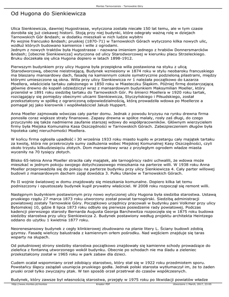 Montes Tarnovicensis - Tarnowskie Góry Od Hugona do Sienkiewicza Ulica Sienkiewicza, dawniej Hugostrasse, wytyczona została niecałe 150 lat temu, ale w tym czasie dorobiła się już ciekawej historii. Stoją przy niej budynki, które odegrały ważną rolę w dziejach Tarnowskich Gór – w dodatku mieszkali w nich ludzie wybitni Po wojnie francusko – pruskiej (1870-71) w Tarnowskich Górach wytyczono kilka nowych ulic, wzdłuż których budowano kamienice i wille z ogrodami. Jednym z nowych traktów była Hugostrasse - nazwana imieniem jednego z hrabiów Donnersmarcków – [obecnie Sienkiewicza] wytyczona od ulicy Starodworcowej w kierunku placu Strzeleckiego. Bruku doczekała się ulica Hugona dopiero w latach 1898-1912. Pierwszym budynkiem przy ulicy Hugona była przepiękna willa postawiona na styku z ulicą Starodworcową, obecnie nieistniejącą. Budynek wzniesiony w 1874 roku w stylu neobaroku francuskiego ma blaszany mansardowy dach, fasadę na kamiennym cokole symetrycznie podzieloną pilastrami, między którymi umieszczone są okna. Willa przy ulicy Sienkiewicza nr 1 należała początkowo do Łazarza Moellera, właściciela tartaku założonego w 1850 roku w Miasteczku Śląskim. Później firmę dostarczającą głównie drewno do kopalń odziedziczył wraz z mansardowym budynkiem Maksymilian Moeller, który przeniósł w 1891 roku siedzibę tartaku do Tarnowskich Gór. Po śmierci Moellera w 1920 roku tartak, rozciągający się pomiędzy obecnymi ulicami Sienkiewicza, Styczyńskiego i Piłsudskiego, został przekształcony w spółkę z ograniczoną odpowiedzialnością, którą prowadziła wdowa po Moellerze a pomagał jej jako kierownik i współwłaściciel Jakub Huppert. Anna Moeller zajmowała wówczas cały parter domu. Jednak z powodu kryzysu na rynku drewna firma ponosiła coraz większe straty finansowe. Zapasy drewna w spółce malały, rosły zaś długi, do czego przyczyniło się także nadmierne zaufanie starszej wdowy do współpracowników. Głównym wierzycielem firmy była Miejska Komunalna Kasa Oszczędności w Tarnowskich Górach. Zabezpieczeniem długów była hipoteka całej nieruchomości Moellera. W końcu firma ogłosiła upadłość i 30 września 1933 roku miasto kupiło w przetargu cały majątek tartaku za kwotę, która nie przekroczyła sumy zadłużenia wobec Miejskiej Komunalnej Kasy Oszczędności, czyli około trzystu kilkudziesięciu złotych. Dom mansardowy wraz z przyległym ogrodem władze miasta wyceniły na 70 tysięcy złotych. Blisko 65-letnia Anna Moeller straciła cały majątek, ale tarnogórscy radni uchwalili, że wdowa może mieszkać w jednym pokoju swojego dotychczasowego mieszkania na parterze willi. W 1938 roku Anna Moeller przeprowadziła się do pokoju na parterze budynku przy ulicy Sienkiewicza 4. Cały parter willowej budowli z mansardowym dachem zajął dowódca 3. Pułku Ułanów w Tarnowskich Górach. Po II wojnie światowej w domu znajdowały się mieszkania komunalne. Dopiero kilka lat temu podniszczony i opustoszały budynek kupił prywatny właściciel. W 2008 roku rozpoczął się remont willi. Następnym budynkiem postawionym przy nowo wytyczonej ulicy Hugona była siedziba starostwa. Ustawą pruskiego rządu 27 marca 1873 roku utworzony został powiat tarnogórski. Siedzibą administracji powiatowej zostały Tarnowskie Góry. Początkowo urzędnicy pracowali w budynku pani Volkmer przy ulicy Bytomskiej 10, gdzie 8 lipca 1873 roku odbyło się pierwsze posiedzenie rady powiatowej. Podczas kadencji pierwszego starosty Bernarda Augusta Georga Barchewitza rozpoczęła się w 1875 roku budowa siedziby starostwa przy ulicy Sienkiewicza 2. Budynek postawiony według projektu architekta Heintzego oddano do użytku 1 kwietnia 1877 roku. Neorenesansowy budynek z cegły klinkierowej zbudowano na planie litery L. Ściany budowli zdobią gzymsy. Fasadę wieńczy balustrada z kamiennym orłem pośrodku. Nad wejściem znajduje się taras wsparty na słupach. Od południowej strony siedziby starostwa początkowo znajdowały się kamienne schody prowadzące do zieleńca z fontanną utworzonego wokół budynku. Obecnie po schodach nie ma śladu a zieleniec przekształcony został w 1965 roku w park zabaw dla dzieci. Cudem ocalał wspomniany orzeł zdobiący starostwo, który stał się w 1922 roku przedmiotem sporu. Powstańcy śląscy zażądali usunięcia pruskiego godła. Jednak polski starosta wytłumaczył im, że to żaden pruski orzeł tylko zwyczajny ptak. W ten sposób orzeł przetrwał do czasów współczesnych. Budynek, który zawsze był własnością starostwa, przejęły w 1975 roku po likwidacji powiatów władze http://www.montes.pl/montes Kreator PDF Utworzono 1 March, 2017, 23:05 Montes Tarnovicensis - Tarnowskie Góry Tarnowskich Gór. Od tej pory, mimo pretensji odtworzonego w 1999 roku starostwa tarnogórskiego, w budynku znajduje się Urząd Miejski. W listopadzie 2006 roku podczas robienia wykopów robotnicy znaleźli na tyłach budynku starostwa kamienny nagrobek, który pochodził z 1912 roku. Upamiętniał Yellowa ukochanego psa starostów von Schwerina i hrabiego Friedricha Wilhelma zu Limburg-Stirum. Nagrobek trafił do tarnogórskiego muzeum. W 1910 roku postawiony został wczesnomodernistyczny budynek z mansardowym dachem krytym dachówką, w którym obecnie mieści się przedszkole. Dom stojący przy ulicy Sienkiewicza 5 należał w okresie międzywojennym do Karla Millera, właściciela stolarni, w której w okresie międzywojennym pracowało 50 osób. Na górze pod spadzistym dachem widoczna jest wypukła rzeźba postaci siedzącego atlety z piłą na tle wici i liści irysa. Rzeźba nawiązuje do fachu dawnego właściciela budynku. Nieco wcześniej obok dawnego starostwa stanęła neobarokowa kamienica. Zbudowana w 1905 roku, zaprojektowana została przez Hugona Streckera, który w niej zamieszkał. W murze budynku pełnego zdobień znajdują się przedstawienia narzędzi murarskich