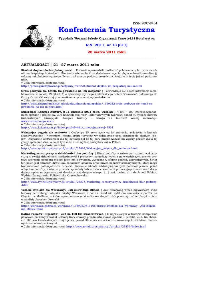 ISSN 2082-8454 Konfraternia Turystyczna Tygodnik Wyższej Szkoły Organizacji Turystyki i Hotelarstwa R.9: 2011, nr 13 (311) 28 marca 2011 roku __________________________________________________________________________ AKTUALNOŚCI | 21– 27 marca 2011 roku Student dopłaci do bezpłatnej nauki | Posłowie wprowadzili możliwość pobierania opłat przez uczelnie na bezpłatnych studiach. Student może zapłacić za dodatkowe zajęcia. Sejm uchwalił nowelizację reformy szkolnictwa wyższego. Teraz trafi ona do podpisu prezydenta. Wejdzie w życie już od października. ● Cała informacja dostępna tutaj: http://praca.gazetaprawna.pl/artykuly/497690,student_doplaci_do_bezplatnej_nauki.html Orbis pozbywa się hoteli. Co powstanie na ich miejscu? | Potwierdzają się nasze informacje (opublikowane w sobotę 19.03.2011) o sprzedaży słynnego krakowskiego hotelu "Cracovia", należącego do Grupy Orbis. Od wczoraj pracownikom wręczane są wypowiedzenia. ● Cała informacja dostępna tutaj: http://www.dziennikpolski24.pl/pl/aktualnosci/malopolska/1129932-orbis-pozbywa-sie-hoteli-copowstanie-na-ich-miejscu.html Europejski Kongres Kultury, 8-11 września 2011 roku, Wrocław | 4 dni − 100 interdyscyplinarnych spotkań i projektów, 300 nazwisk mistrzów i alternatywnych twórców, ponad 90 tysięcy metrów kwadratowych Europejski Kongres Kultury – uwaga na kulturę! Więcej informacji: www.culturecongress.eu ● Cała informacja dostępna tutaj: http://www.ksiazka.net.pl/index.php?id=4&tx_ttnews[tt_news]=7594 Wakacyjna pogoda dla seniorów | Osoby po 55. roku życia od lat stanowią, zwłaszcza w krajach skandynawskich i Niemczech, mocną grupę turystów wyjeżdżających poza sezonem do ciepłych krajów. Oczywiście ułatwieniem dla tej sytuacji był do tej pory przede wszystkim wyższy poziom życia tej grupy społeczeństwa, a co za tym idzie dużo wyższe emerytury niż w Polsce. ● Cała informacja dostępna tutaj: http://www.rynekturystyczny.pl/artykul/23862/Wakacyjna_pogoda_dla_seniorow.html Marketing sensoryczny w działalności biur podróży | Biura podróży w znikomym stopniu wykorzystują w swojej działalności marketingowej i procesach sprzedaży jeden z najważniejszych swoich atutów: tworzenie pomostu między klientem a światem, wyrażone w ofercie podróży zagranicznych. Świat ten pełen jest obrazów, dźwięków, zapachów, smaków oraz innych bodźców sensorycznych, które mogą być nieznane potencjalnemu turyście. Poddanie klienta oddziaływaniu tych bodźców jeszcze przed odbyciem podróży, a więc w procesie sprzedaży lub w trakcie kampanii promocyjnych może mieć decydujący wpływ na jego stosunek do oferty oraz decyzje zakupu. […] prof. nadzw. dr hab. Arnold Pabian, Wydział Zarządzania, Politechnika Częstochowska. ● Cała informacja dostępna tutaj: http://www.rynekturystyczny.pl/artykul/23875/Marketing_sensoryczny_w_dzialalnosci_biur_podrozy .html Trzecie lotnisko dla Warszawy? Jak zlikwidują Okęcie | Jak bumerang wraca mgławicowa wizja budowy centralnego lotniska między Warszawą a Łodzią. Rząd nie wyklucza zamknięcia portów na Okęciu i w Modlinie, w które wpompowano setki milionów złotych. Jak powstrzymać te plany? - pisze w analizie Jarosław Osowski . ● Cała informacja dostępna tutaj: http://warszawa.gazeta.pl/warszawa/1,34905,9311165,Trzecie_lotnisko_dla_Warszawy__Jak_zlikwid uja_Okecie.html Dolina Pałaców i Ogrodów − cud na 100 km kwadratowych | O największym w Europie kompleksie pałacowo-parkowym wokół Jeleniej Góry znawcy przedmiotu mówią zgodnie – perełka, cud. Na obszarze 100 km kwadratowych znajduje się ponad 30 w większości odrestaurowanych obiektów, otoczonych zespołami parkowymi. ● Cała informacja dostępna tutaj: http://www.rynekturystyczny.pl/artykul/23859/index.html Grecja znowu modna | Po kilkunastu trudnych i smutnych miesiącach do Greków znów los się uśmiechnął. Europejscy turyści, zniesmaczeni kreatywną księgowością rządów w Atenach, które zmusiły Unię do kredytowania tego pogrążonego w kryzysie kraju, musieli się w końcu przeprosić z Helladą. Tabele hotelowych rezerwacji na Krecie, Rodos czy Santorini zaczęły gwałtownie się zapełniać. Ale zasługa w tym Greków jest niewielka – to zamieszki w krajach arabskich, zwłaszcza Tunezji i Egipcie, skutecznie wypłoszyły stamtąd spragnionych spokoju Niemców, Francuzów, Brytyjczyków czy Polaków. ● Cała informacja dostępna tutaj: http://www.rynekturystyczny.pl/artykul/23858/index.html Tanio niestety już było... | Tanie podróże to marzenie nie tylko turystów czy biznesmenów, ale i wszelkich firm branży turystycznej. To właśnie koszt podróży w większości przypadków kształtuje cenę imprezy, szczególnie gdy w grę wchodzi transport lotniczy. ● Cała informacja dostępna tutaj: http://www.rynekturystyczny.pl/artykul/23863/index.html Wakacyjna pogoda dla seniorów | Osoby po 55. roku życia od lat stanowią, zwłaszcza w krajach skandynawskich i Niemczech, mocną grupę turystów wyjeżdżających poza sezonem do ciepłych krajów. Oczywiście ułatwieniem dla tej sytuacji był do tej pory przede wszystkim wyższy poziom życia tej grupy społeczeństwa, a co za tym idzie dużo wyższe emerytury niż w Polsce. ● Cała informacja dostępna tutaj: http://www.rynekturystyczny.pl/artykul/23862/index.html Tunezja i Egipt. Zrezygnujemy z ulubionych kierunków? | Czy zawirowania w północnej Afryce będą miały wpływ na wybór kierunków wakacyjnych? Czy Polacy zmienią plany i wybiorą kraje uznawane za bezpieczniejsze, czy skuszeni atrakcyjnymi zniżkami, skierują swój wzrok w stronę krajów arabskich? ● Cała informacja dostępna tutaj: http://turystyka.gazeta.pl/Turystyka/1,81947,9298362,Tunezja_i_Egipt__Zrezygnujemy_z_ulubionyc h_kierunkow_.html W marcu najdroższe noclegi są w Szwajcarii | Ceny noclegów wzrosły u naszych zachodnich sąsiadów średnio o 4 proc. (110 euro