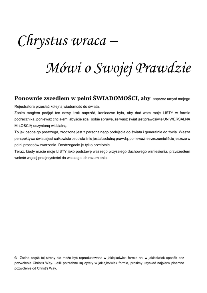 Chrystus wraca – Mówi o Swojej Prawdzie Ponownie zszedłem w pełni ŚWIADOMOŚCI, aby poprzez umysł mojego Rejestratora przesłać kolejną wiadomość do świata. Zanim mogłem podjąć ten nowy krok naprzód, konieczne było, aby dać wam moje LISTY w formie podręcznika, ponieważ chciałem, abyście zdali sobie sprawę, że wasz świat jest prawdziwie UNIWERSALNĄ MIŁOŚCIĄ uczynioną widzialną. To jak osoba go postrzega, zrodzone jest z personalnego podejścia do świata i generalnie do życia. Wasza perspektywa świata jest całkowicie osobista i nie jest absolutną prawdą, ponieważ nie zrozumieliście jeszcze w pełni procesów tworzenia. Dostrzegacie je tylko przelotnie. Teraz, kiedy macie moje LISTY jako podstawę waszego przyszłego duchowego wzniesienia, przyszedłem wnieść więcej przejrzystości do waszego ich rozumienia. © Żadna część tej strony nie może być reprodukowana w jakiejkolwiek formie ani w jakikolwiek sposób bez pozwolenia Christ's Way. Jeśli potrzebne są cytaty w jakiejkolwiek formie, prosimy uzyskać najpierw pisemne pozwolenie od Christ's Way. Chrystus Wraca – Mówi swoj Prawd ‘Wiadomo o Czonkostwie’ 2 CHCĘ POWIEDZIEĆ WAM POKRÓTCE O PRAWDZIWEJ NATURZE CZYSTEJ MIŁOŚCI z najwyższych sfer Świadomości i waszej percepcji miłości w niższych częstotliwościach waszego świata. Chcę abyście zrozumieli, że mimo iż mówię do was całym swoim transcendentnym Istnieniem jako MIŁOŚĆ, ciągle muszę mówić w ramach myślenia waszego świata, żeby was oświecić. Sfera gdzie ja rezyduję w Świadomości JA JESTEM – jest CZYSTĄ MIŁOŚCIĄ. W miarę jak obniżałem się w świadomości, moje współczucie rosło i rosło i zmusiło mnie do obniżenia częstotliwości świadomości tak, aby wejść do świadomości waszego położenia w waszym nowoczesnym świecie. Jak mogę pomóc zrozumieć wam to? Rozważcie jakbyście się czuli, jeśli znaleźlibyście się w miejscu masakry, czy wasza miłosna troska nie byłaby głęboko współczująca? Czyż nie staralibyście się z pasją zapobiegać scenom cierpienia? I tak jest ze mną, mimo iż wiem, że jest to wszystko częścią procesu ewolucji, przekształcającego indywidualność ego. Tylko poprzez lekcje cierpienia wędrująca dusza posiądzie samowiedzę jak utrzymać indywidualność po odrzuceniu ego. Ja jestem MIŁOŚCIĄ – bezwarunkową Miłością, czystą i prostą i w moich słowach nie ma osądu. Dlatego, jeśli moje słowa wyglądają na szorstkie a wy tego nie oczekujecie ode mnie, ponieważ twierdzę, że jestem uosobieniem MIŁOŚCI, zrozumcie proszę, że nie zszedłem tym razem z kochającą wizytą, dać wam słowa otuchy, podnoszące waszego ducha, powiedzieć jak w Rzeczywistości jesteście błogosławieni, ale jeszcze z tego nie zdajecie sobie sprawy. Przychodzę wykonać miłującą posługę. Przychodzę wprost, aby pokazać wam ziemskie fakty, które powodują wasz ból, ich rzeczywistą iluzję, pokazać co wszyscy pomagacie tworzyć dla siebie. Tak samo, jak kochający i popularny nauczyciel nie raduje się słowami, których musi użyć, żeby pomóc agresywnym uczniom ujrzeć i zgodzić się, jaki bałagan robią w klasie, tak i ja muszę mówić o waszych obecnych uwarunkowaniach ziemskimi słowami, które potraficie rozumieć, żeby umożliwić wam pracę nad wzniesieniem się ponad te uwarunkowania. Jednak nie są to słowa potępienia działania czy tego, który je czyni. Jestem MIŁOŚCIĄ, uosobieniem CZYSTEJ MIŁOŚCI, ale mówię, jak wymaga sytuacja, do ludzi, którzy nie zdołali jeszcze pokonać słabości swojego ego. Kocham wszystkich ludzi – bo cały jestem MIŁOŚCIĄ – ale miłość przywdziewa wiele masek w swoich kochających usiłowaniach osiągnięcia i pomocy tym, którzy szukają ulgi w obecnej trudnej sytuacji. Mówię do was słowami logiki, ponieważ stworzyliście wasz świat, dopasowując do tego, co uważacie za logiczne i dlatego do uwierzenia. Jeśli podszedłbym do was ze “znaczeniem” wyrażanym przez Miłość, zagubilibyście się wszyscy, ponieważ “znaczenie” nie byłoby zgodne z waszą logiką i ciągle nie wierzylibyście, że to ja mówię. MIŁOŚĆ przekracza i eliminuje potrzebę Dziesięciu Przykazań, ale kilku tylko ludzi w waszym świecie naprawdę to rozumie. Chrystus Wraca – Mówi swoj Prawd ‘Wiadomo o Czonkostwie’ 3 CHCĘ MÓWIĆ DO WAS O PRAWDZIWEJ NATURZE ŚWIADOMOŚCI – o różnicy pomiędzy UNIWERSALNĄ ŚWIADOMOŚCIĄ, Boską Świadomością i ludzką świadomością. Musicie naprawdę zrozumieć te różnice, żeby możliwym stało się wasze aktywne duchowe życie w waszym świecie F To przyszedłem pomóc wam uczynić. ŚWIADOMOŚĆ Transcendentna i ludzka świadomość! Świadomość jest teraz słowem powszechnie używanym, ale nie w pełni rozumianym przez wielu drogich poszukiwaczy Prawdy. Zaczerpnęliście swoje istnienie od Uniwersalnej Świadomości podzielonej na Boską Świadomość w czasie Wielkiego Wybuchu. (Patrz List 5) To jest perfekcyjna Świadomość Kochającej Inteligencji i Inteligentnej Miłości. TO są IMPULSY. IMPULSY te są bardzo podstawową energią, GŁÓWNĄ SPRĘŻYNĄ całej egzystencji. Ta Świadomość jest rzeczywiście w was, otacza was, przekracza was i potrafi unosić was w coraz wyższe warstwy duchowej ekstazy i efemerycznej percepcji. Ta Świadomość jest tym, co wielu nazywa Bogiem. Jest ona w was i przekracza was. Jednak to z czego rodzaj ludzki musi sobie zdać sprawę jest, że ona ma tak wysoką częstotliwość wibracji, FFtak duchowo oczyszczona w rozumieniu F.. że nie może być czerpana do waszej ludzkiej świadomości, żeby uczynić Siebie znaną wam, dopóki nie zaczniecie przezwyciężać ego i wznosić się w duchowej percepcji Prawdy. Wasze ego jest barierą do Super Świadomości. Tylko najbardziej systematyczne i wytrwałe codzienne próby oczyszczania waszej świadomości z myśli i zachowań ego uczyni moż