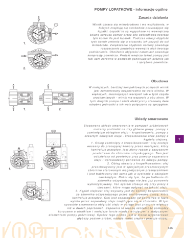 POMPY ŁOPATKOWE - informacje ogólne Zasada działania Wirnik obraca się mimośrodowo i ma wyżłobienia, w których znajdują się swobodnie poruszające się łopatki. Łopatki te są wypychane na wewnętrzną ścianę korpusu pompy przez siłę odśrodkową tworząc tyle komór ile jest łopatek. Podczas rotacji objętość tych komór zmienia się w stosunku ich pozycji do osi mimośrodu. Zwiększenie objętości komory powoduje rozszerzenie powietrza wewnątrz nich tworząc podciśnienie. Obniżenie objętości natomiast powoduje kompresję powietrza. Projekt wnętrza takiej pompy jest taki sam zarówno w pompach generujących próżnię jak i sprężone powietrze. 1. 2. Obudowa W mniejszych, bardziej kompaktowych pompach wirnik jest zamontowany bezpośrednio na wale silnika. W większych, mocniejszych wersjach lub w tych często uruchamianych - wirnik ma wsparcie z obu stron. W tych drugich pompa i silnik elektryczny stanowią dwie odrębne jednostki a ich wały połączone są sprzęgłem. 1. 2. Układy smarowane 1. 2. 3. Stosowane układy smarowania w pompach próżniowych możemy podzielić na trzy główne grupy: pompy z zamkniętym obiegiem oleju - kropelkowanie, pompy z otwartym obiegiem oleju - kropelkowanie oraz pompy z kąpielą olejową. 1. Obieg zamknięty z kropelkowaniem: olej zostaje wessany do pracującej komory przez naolejacz, który k o n t r o l u j e p r z e p ł y w, j e s t z l a n y r a z e m z z a s y s a n y m p o w i e t r z e m d o z b i o r n i k a o d z y s k u j ą c e g o . Ta m j e s t oddzielany od powietrza przy pomocy separatora o l e j u i w p r o w a d z a n y p o n o w n i e d o o b i e g u p o m p y. 2. Obieg otwarty z kropelkowaniem: olej przechowywany jest w specjalnym przezroczystym zbiorniku sterowanym magnetycznym przełącznikiem i jest traktowany tak samo jak w systemie z obiegiem zamkniętym. Różni się tym, że po trafieniu do zbiornika odzyskującego nie jest już ponownie w y k o r z y s t y w a n y. Te n s y s t e m s t o s u j e s i ę p r z y p r a c y z cieczami, które mogą wpłynąć na jakość oleju. 3. Kąpiel olejowa: olej wsysany jest do komory bezpośrednio ze zbiornika odzyskującego przez skalibrowaną dyszę, która k o n t r o l u j e p r z e p ł y w. O l e j j e s t s e p a r o w a n y o d p o w i e t r z a w f a z i e wylotu przez separatory oleju znajdujące się w zbiorniku. W tym sposobie smarowania objętość oleju w obiegu jest znacznie większa niż w dwóch poprzenich. Zapewnia to lepszą szczelność pomiędzy korpusem a wirnikiem i mniejsze tarcie między wirującymi a statycznymi elementami pompy próżniowej. Oprócz tego pompa jest w stanie wygenerować głębszy poziom próżni, oddaje mniej ciepła i pracuje ciszej. Conversion ratio: inch = mm ; pounds = g = Kg 25.4 453.6 0.4536 GAS-NPT thread adapters available at page 1.117 7.05 7 POMPY ŁOPATKOWE - informacje ogólne Bezolejowe pompy próżniowe Specyficzne ukształtowanie komór i grafit, z którego są wykonane łopatki i kołnierze blokujące pozwalają pompie na działanie bez potrzeby smaru. Nie należy używać tych pomp, gdy wsysane powietrze zawiera parę wodną lub inne opary. Bezolejowy pompy próżniowe są pompami całkowicie bezobsługowymi. Chłodzenie Chłodzenie pomp jest oparte na przepływie powietrza. Ciepło produkowane przez pompę jest rozpraszane z zewnętrznej powierzchni, która jest specjalnie ukształtowana przez wentylator elektryczny w mniejszych pompach i wentylator radialny montowany na wale większych pomp. Pompy o przepustowości 100m3/h wzwyż są wyposażone w radiator serpentynowy. W tym przypadku olej przechodzący przez radiator zanim dostanie się do komory jest chłodzony wsysanym powietrzem co dodatkowo zmniejsza produkowane w pompie ciepło. 1. 2. 3. Materiały Korpus pompy wykonany jest z żeliwa; wał napędowy i wirnik ze stali węglowej a łopatki z włókna węglowego lub szklanego do pomp olejowych i z grafitu do pomp bezolejowych. Silnik Wszystkie pompy próżniowe o wydajności do 20m3/h mogą być wyposażone w silnik jedno- lub trójfazowy, a większe - w trójfazowy. Wszystkie silniki są wielonapięciowe zgodne ze standardami CE. Na zamówienie silniki mogą być zgodne ze standardem specjalnych napięć i częstotliwości UL-CSA. 7.06 g Conversion ratio: inch = mm; pounds = = Kg 453.6 0.4536 25.4 GAS-NPT thread adapters available at page 1.117