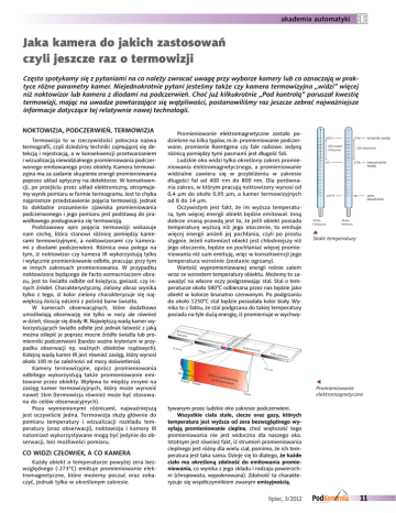 akademia automatyki Jaka kamera do jakich zastosowań czyli jeszcze raz o termowizji Często spotykamy się z pytaniami na co należy zwracać uwagę przy wyborze kamery lub co oznaczają w praktyce różne parametry kamer. Niejednokrotnie pytani jesteśmy także czy kamera termowizyjna „widzi” więcej niż noktowizor lub kamera z diodami na podczerwień. Choć już kilkukrotnie „Pod kontrolą” poruszał kwestię termowizji, mając na uwadze powtarzające się wątpliwości, postanowiliśmy raz jeszcze zebrać najważniejsze informacje dotyczące tej relatywnie nowej technologii. CO WIDZI CZŁOWIEK, A CO KAMERA Każdy obiekt o temperaturze powyżej zera bezwzględnego (-273°C) emituje promieniowanie elektromagnetyczne, które możemy poczuć oraz zobaczyć, jednak tylko w określonym zakresie. Promieniowanie elektromagnetyczne zostało podzielone na kilka typów, m.in. promieniowanie podczerwone, promienie Roentgena czy fale radiowe. Jedyną różnicą pomiędzy tymi pasmami jest długość fali. Ludzkie oko widzi tylko określony zakres promieniowania elektromagnetycznego, a promieniowanie widzialne zawiera się w przybliżeniu w zakresie długości fal od 400 nm do 800 nm. Dla porównania zakres, w którym pracują noktowizory wynosi od 0,4 µm do około 0,95 µm, a kamer termowizyjnych od 8 do 14 µm. Oczywistym jest fakt, że im wyższa temperatura, tym więcej energii obiekt będzie emitował. Inną dobrze znaną prawdą jest to, że jeśli obiekt posiada temperaturę wyższą niż jego otoczenie, to emituje więcej energii aniżeli jej pochłania, czyli po prostu stygnie. Jeżeli natomiast obiekt jest chłodniejszy niż jego otoczenie, będzie on pochłaniać więcej promieniowania niż sam emituję, więc w konsekwencji jego temperatura wzrośnie (zostanie ogrzany). Wartość wypromieniowanej energii rośnie zatem wraz ze wzrostem temperatury obiektu. Możemy to zauważyć na własne oczy podgrzewając stal. Stal o temperaturze około 580°C odbierana przez nas będzie jako obiekt w kolorze brunatno czerwonym. Po podgrzaniu do około 1250°C stal będzie posiadała kolor biały. Wynika to z faktu, że stal podgrzana do takiej temperatury posiada na tyle dużą energię, iż promieniuje w wychwy- ieniow anie X 0,1nm 373K – 100 stopni Celsjusza wrzenie wody 100 Kelwinów 0°C – 273K – zamarzanie wody -237°C – 0K – zero absolutne Skala Celsjusza Skala Kelwina Skale temperatury e Prom ien Gamm iowanie a Prom 100°C – ia ln Termowizja to w rzeczywistości potoczna nazwa termografii, czyli dziedziny techniki zajmującej się detekcją i rejestracją, a w konsekwencji przetwarzaniem i wizualizacją niewidzialnego promieniowania podczerwonego emitowanego przez obiekty. Kamera termowizyjna ma za zadanie skupienie energii promieniowania poprzez układ optyczny na detektorze. W konsekwencji, po przejściu przez układ elektroniczny, otrzymujemy wynik pomiaru w formie termogramu. Jest to chyba najprostsze przedstawienie pojęcia termowizji, jednak to dokładne zrozumienie zjawiska promieniowania podczerwonego i jego pomiaru jest podstawą do prawidłowego posługiwania się termowizją. Podstawowy opis pojęcia termowizji wskazuje nam cechę, która stanowi różnicę pomiędzy kamerami termowizyjnymi, a noktowizorami czy kamerami z diodami podczerwieni. Różnica owa polega na tym, iż noktowizor czy kamera IR wykorzystują tylko i wyłącznie promieniowanie odbite, pracując przy tym w innych zakresach promieniowania. W przypadku noktowizora będącego de facto wzmacniaczem obrazu, jest to światło odbite od księżyca, gwiazd, czy innych źródeł. Charakterystyczny, zielony obraz wynika tylko z tego, iż kolor zielony charakteryzuje się największą ilością odcieni z pośród barw światła. W kamerach obserwacyjnych, które dodatkowo umożliwiają obserwację nie tylko w nocy ale również w dzień, stosuje się diody IR. Największą wadą kamer wykorzystujących światło odbite jest jednak łatwość z jaką można oślepić je poprzez mocne źródło światła lub promienniki podczerwieni (bardzo ważne kryterium w przypadku obserwacji np. ważnych obiektów rządowych). Kolejną wadą kamer IR jest również zasięg, który wynosi około 100 m (w zależności od mocy doświetlenia). Kamery termowizyjne, oprócz promieniowania odbitego wykorzystują także promieniowanie emitowane przez obiekty. Wpływa to między innymi na zasięg kamer termowizyjnych, który może wynosić nawet 1km (termowizja również może być stosowana do celów obserwacyjnych). Poza wymienionymi różnicami, najważniejszą jest oczywiście jedna. Termowizja służy głównie do pomiaru temperatury i wizualizacji rozkładu temperatury (oraz obserwacji), noktowizja i kamery IR natomiast wykorzystywane mogą być jedynie do obserwacji, bez możliwości pomiaru. U ltr a Pa fio sm let o w id z NOKTOWIZJA, PODCZERWIEŃ, TERMOWIZJA Podcz e rwień 10nm Fale ra diowe Pasmo widzia lne 0,4μm 0,8μm 0,1cm Zakre s pom podcz iarowy erwie ni Promieniowanie elektromagnetyczne 15μm tywanym przez ludzkie oko zakresie podczerwieni. Wszystkie ciała stałe, ciecze oraz gazy, których temperatura jest wyższa od zera bezwzględnego wysyłają promieniowanie cieplne, choć większość tego promieniowania nie jest widoczna dla naszego oka. Istotnym jest również fakt, iż strumień promieniowania cieplnego jest różny dla wielu ciał, pomimo, że ich temperatura jest taka sama. Dzieje się to dlatego, że każde ciało ma określoną zdolność do emitowania promieniowania, co wynika z jego składu i rodzaju powierzchni (chropowata, wypolerowana). Zdolność ta charakteryzuje się współczynnikiem zwanym emisyjnością. lipiec, 3/2012 11 akademia automatyki EMISYJNOŚĆ, CIAŁO DOSKONALE CZARNE, REFLEKSYJNOŚĆ Wielokrotne odbicie Promieniowanie zewnętrzne Ciało doskonale czarne Wzorce kalibracyjne firmy LAND Schemat działania detektora Emisyjność materiału jest to stosunek energii wypromieni