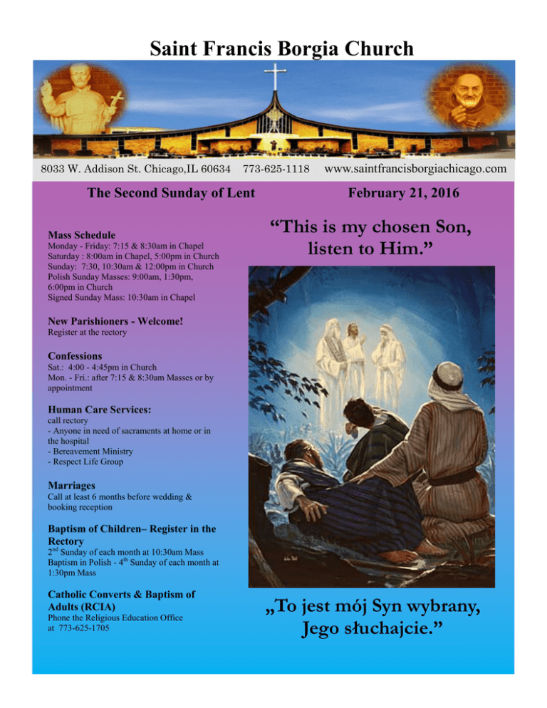 Saint Francis Borgia Church 8033 W. Addison St. Chicago,IL 60634 773-625-1118 The Second Sunday of Lent Mass Schedule Monday - Friday: 7:15 & 8:30am in Chapel Saturday : 8:00am in Chapel, 5:00pm in Church Sunday: 7:30, 10:30am & 12:00pm in Church Polish Sunday Masses: 9:00am, 1:30pm, 6:00pm in Church Signed Sunday Mass: 10:30am in Chapel www.saintfrancisborgiachicago.com February 21, 2016 “This is my chosen Son, listen to Him.” New Parishioners - Welcome! Register at the rectory Confessions Sat.: 4:00 - 4:45pm in Church Mon. - Fri.: after 7:15 & 8:30am Masses or by appointment Human Care Services: call rectory - Anyone in need of sacraments at home or in the hospital - Bereavement Ministry - Respect Life Group Marriages Call at least 6 months before wedding & booking reception Baptism of Children– Register in the Rectory 2nd Sunday of each month at 10:30am Mass Baptism in Polish - 4th Sunday of each month at 1:30pm Mass Catholic Converts & Baptism of Adults (RCIA) Phone the Religious Education Office at 773-625-1705 „To jest mój Syn wybrany, Jego słuchajcie.” Jozefa Cieciwa Monday, February 22, 2016 - The Chair of St. Peter the Apostle Saturday, February 20, 2016 8:00 For All Our Sick & Homebound 5:00 Giuseppa & Andrea Pellitteri Estelle Harris Zenaida Coleris Rolando Gayo Sunday, February 21, 2016 - Second Sunday of Lent 7:30 Eleanor Esposito 9:00 O Boze Blog. i opieke Matki Boskiej dla rodziny O zdrowie, Boze Blog. i opieke Matki Bozej dla Oliviera z okazji 3 urodzin Iwona Skrzyniasz w 2 rocz. smierci Jozef Koszarek w 3 rocz. smierci Czeslaw Sepko Zofia Dobosz Jozef Danowski Wladyslaw Polek Ryszard Mossakowski Bogumila Minor Lukasz Zylowski w 4 rocz. smierci Efilia Rulev Mieczyslaw, Leopolda i Lukasz Garbacz O spokoj duszy dla Jozefa Koziola w rocz. smierci Wladyslawa Baradziej Jan W rocz. smierci sw. pamieci Katarzyny Cison oraz meza Michala 10:30 Health & Blessings for Mary McGeean For a successful surgery for Anna Muniak Giuseppe Fricano Gloria & Renato Bacci Fred Kuttritz on 1st ann. of death Barbara Reid Santiago Chinchilla 12:00 Josephine Quattrocchi Cosimo Mirizzi 1:30 Janusz Boksa Maria i Stanislaw Szpara Leokadia Oles Michal Owsiany Grzegorz Florek w 2 rocz. smierci Miroslaw Dybas 6 miesiecy po smierci Emil Zawilinski 6:00 Przez wstawiennictwo Sw. Ojca Pio o szybki powrot do zdrowia dla Konrada Jan Czepiel Adam Cieciwa New Parishioners Are Invited to Register ____________________________________________________ Last name of registrants / Nazwisko Name of spouse / Imię małżonk Date of Birth ____________________________________________________ Address / Adres Date of Birth ______________________________________________________ Names of children / Dzieci Dates of Birth ______________________________________________________ City, State, Zip / Miasto, Stan, Zip ____________________________________________________ Home phone number / Numer telefonu Married Forma Rejestracyjna ______________________________________________________ First name / Imię ____________________________________________________ I am: 7:15 For All Our Sick & Homebound 8:30 Estelle Harris Tuesday, February 23, 2016 7:15 For All Our Sick & Homebound 8:30 For a successful surgery for Anna Muniak Wednesday, February 24, 2016 7:15 Jerry Lucey 8:30 Frances C. Slowik Thursday, February 25, 2016 7:15 Gloria Bacci on 30th ann. of death 8:30 Most Forgotten Souls in Purgatory Friday, February 26, 2016 7:15 Michael Kennedy 8:30 Most Forgotten Souls in Purgatory 7:00 Miroslaw Dybas w dniu imienin Saturday, February 27, 2016 8:00 Health & Blessings for Malgorzata & her family Joseph Jagiello Barbara & Louis Smagacz 5:00 Theodore Stellmack Estelle Harris Genowefa Chlopek Sunday, February 28, 2016 - Third Sunday of Lent 7:30 Scott Semenik 9:00 Pawel Kafel w 1 rocz. smierci Janusz Sobusiak w 1 rocz. smierci Czeslaw Sepko Zofia Dobosz Mieczyslaw Garbacz w rocz. smierci Wladyslaw Polek Ryszard Mossakowski Bogumila Minor Lukasz Zylowski w 4 rocz. smierci 10:30 Ken Grenier Dan Ludwig Fred Kuttritz on 1st ann. of death 12:00 William & Frances Slowik Madeleine Nelson Peggy June Beavers 1:30 Janusz Boksa Michal Owsiany Leokadia Oles Sebastian Kepa 30 dni po smierci 6:00 Przez wstawiennictwo Matki Bozej Nieustajacej Pomocy o szybki powrot do zdrowia dla Konrada Jan Bialoszewski w 2 rocz. smierci Single Widowed ______________________________________________________ Alternate phone number / Numer telefonu Divorced Separated St. Francis Borgia Mission Statement “St. Francis Borgia nurtures the Roman Catholic Faith and fosters the gifts of the Holy Spirit in all by: Welcoming everyone into our faith community; Celebrating the sacraments together; Providing faith education; Providing an environment for prayerful meditation; Utilizing our time, talents and treasures. We resolve to develop, support, empower, and encourage individuals to reach their spiritual potential for the greater glory of God and the good of His people.” Members of our church community are serving our country in the various branches of the military. Please pray for all of them and their families and especially for those listed below. Matthew J. Albanese James Allision Paul Raymond Barthel Rev. Marcin Bulinski Christopher R. Burdulinski Joseph Vito Burdulinski Luciano Cammuca Sr. James D. Campis Jasper Catalano Kevin Chesney Robert Curtis Tamara DeCaro Shawn Gaffney Gerald Giovannelli Slawomir Glownia Michael Granadon Daniel Jarosz Joseph Patrick Kinney Frank Joseph Klimas James Labbe Tom Lewandowski Michael Labek Matt Manzano Tim McManus AR T CALEND VEN PARISH E SUNDAY, February 21 9:00 Deaf Ministry ............................Chapel/SC2/Mayall 10:30 1st Comm. Commit. Brunch ............... Church/SC2 MONDAY, February 22 9:00 Crafters ............................................................... SC3 7:30 Knights of Columbus ......................................... SC2 7:30 Italian Catholic Federation ............................... SC3 TUESDAY, Febr