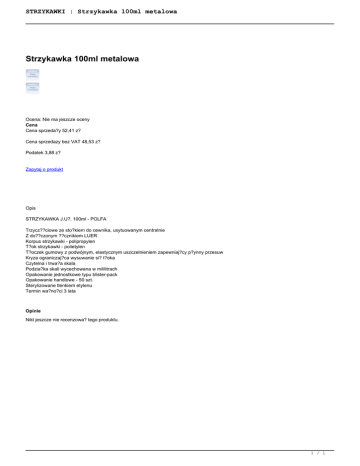 STRZYKAWKI : Strzykawka 100ml metalowa Strzykawka 100ml metalowa Ocena: Nie ma jeszcze oceny Cena Cena sprzeda?y 52,41 z? Cena sprzedazy bez VAT 48,53 z? Podatek 3,88 z? Zapytaj o produkt Opis STRZYKAWKA J.U?. 100ml - POLFA Trzycz??ciowe ze sto?kiem do cewnika, usytuowanym centralnie Z do??czonym ??cznikiem LUER Korpus strzykawki - polipropylen T?ok strzykawki - polietylen T?oczek gumowy z podwójnym, elastycznym uszczelnieniem zapewniaj?cy p?ynny przesuw Kryza ograniczaj?ca wysuwanie si? t?oka Czytelna i trwa?a skala Podzia?ka skali wycechowana w mililitrach Opakowanie jednostkowe typu blister-pack Opakowanie handlowe - 50 szt. Sterylizowane tlenkiem etylenu Termin wa?no?ci 3 lata Opinie Nikt jeszcze nie recenzowa? tego produktu. 1 / 1 Powered by TCPDF (www.tcpdf.org)