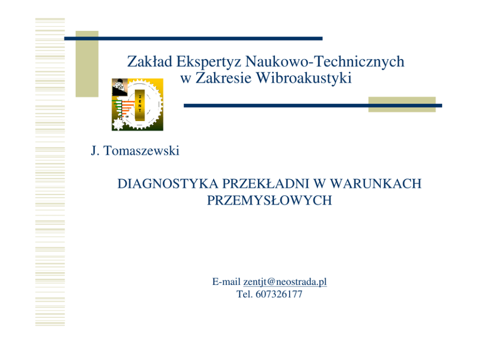 Zakład Ekspertyz Naukowo-Technicznych w Zakresie Wibroakustyki J. Tomaszewski DIAGNOSTYKA PRZEKŁADNI W WARUNKACH PRZEMYSŁOWYCH E-mail [email protected] Tel. 607326177 Definicja przekładni Przekładnie zębate są podzespołem układów napędowych składających się najczęściej z : silnika napędowego, sprzęgła elastycznego, przekładni zębatej Przyczyny uszkodzeń przekładni ogólnego przeznaczenia 1. Nieszczelności spowodowane uszkodzeniami pierścieni uszczelniających 2. Uszkodzenia łoŜysk tocznych 3. Uszkodzenie sprzęgła 4. Wyłamanie zębów 5. ZuŜycie zębów ( pitting, spalling, scuffing,) 6. Pęknięcia i zuŜycia wałów 7. Inne ( pęknięcia korpusu, uszkodzenia silnika) Koincydencja pomiędzy uszkodzeniami Największe oddziaływanie destruktywne na pozostałe elementy przekładni ma awaria łoŜysk i wyciek oleju KaŜda awaria jednego elementu przekładni, pociąga za sobą moŜliwość wystąpienia awarii innych elementów (efekt domino) Istnieje związek przyczynowo-skutkowy pomiędzy uszkodzeniem łoŜysk a uszkodzeniem zębów Przykład koincydencji uszkodzeń Skutek Przyczyna Obrazy typowych uszkodzeń przekładni Wykruszenie Pitting Wyłamanie zmęczeniowe Zacieranie (scuffing) Zadania diagnozowania Zadaniem diagnostyki jest wykrycie uszkodzeń i nieprawidłowości pracy przekładni zębatej. Wykrywanie uszkodzeń i innych nieprawidłowości pracy przekładni odbywa się poprzez monitorowanie i analizę sygnałów drganiowych, temperaturę, analizę produk tów powstałych w wyniku uszkodzeń. Stosowane systemy diagnozowania przekładni 1. Obchodowy system monitorowania przekładni 2. Ciągłe systemy diagnozowania przekładni 3. Diagnozowanie przyczyn pogarszania się stanu technicznego przekładni Obchodowy system monitorowania 1 2 3 ...... n VIBROMETR Mierzone parametry : 1.Wartość skuteczna prędkości drgań 2. Wartość szczytowa przyspieszenia drgań 3. Wartość międzyszczytowa przemieszczenia ( peak to peak) Diagnostyka Baza wyników EKSPERT Ciągłe monitorowanie •Zasilanie 24 V DC lub 220 AC •Mierzone parametry : RMS lub szczyt v,a temperatura •Sygnalizacja stanu diagnozowania ( 3 diody – zielona, Ŝółta, czerwona) •Alarm za pomocą GSM, M20 •Rejestracja parametrów przez okres 4 lata tj. 2 x co 10 minut System VIBCOM firmy „ENERGOCONTROL” Kraków Kryteria oceny Mierzony parametr : v skuteczne pasmo 45-1590 Hz (załącznik D do PN-ISO 8579-2) Zatrzymaj i dokonaj przeglądu – powyŜej 8 do 12 mm/s Groźny stan – powyŜej 12 do 18 mm/s Zatrzymaj natychmiast – powyŜej 18 mm/s Mierzony parametr : a szczyt pasmo 1-4 kHz( wg. Blake M.P.) Do planowanej wymiany w 21 dniach – do 31,6 mm/s Groźny, napraw w ciągu 2 dni - do 178 mm/s Katastrofalny, wyłącz natychmiast – powyŜej 1000 mm/s Mierzony parametr : v szczyt wg. Jacksona Bez działania – do 7,62 mm/s Zaplanuj remont – do 10,16 mm/s Wykonaj remont – do 15,24 Natychmiast zatrzymaj – powyŜej 15,24 Kryteria oceny Mierzony parametr – przemieszczenia µm pasmo do 200Hz ( dotyczy tylko posadowienia, fundamentów) W kierunku poziomym – mniej niŜ 200 W kierunku pionowym – mniej niŜ 150 Ocena wg. wg.PN 80/B-03040 Metodyka pomiarów Metodyka pomiaru zgodna z PN-ISO 8579-2 1. Drgania korpusu powinny być mierzone na sztywnym fragmencie korpusu, takim jak obudowa łoŜysk. 2. Pomiary nie powinny być wykonywane na tych frag – mentach korpusu, które nie podpierają łoŜysk 3. Pomiary powinny być wykonywane w trzech wzajemnie prostopadłych kierunkach, z których dwa leŜą w płaszczyźnie , najlepiej prostopadłej do osi obrotu kół zębatych 4. Zaleca się, Ŝeby pomiary były wykonywane we wszystkich dostępnych miejscach łoŜyskowania przekładni zębatej Generalna zasada dla przekładni ogólnego przeznaczenia Przekładnie o v rms < 8 mm/s : praca bez nagłych awarii Przekładnie o v rms > 8 mm/s : nagłe awarie, ciągłe kłopoty eksploatacyjne NaleŜy dąŜyć do tego, aby napędy zębate posiadały poziom drgań mniejszy od 8 mm/s Potrzebne dane do diagnostyki przekładni 1. 2. 3. 4. Schemat kinematyczny napędu z przekładnią Ilość zębów poszczególnych stopni przekładni Typy łoŜysk ułoŜyskowania wałów przekładni Typ sprzęgieł połączeniowych ( Ilości elementów np. palców sprzęgieł podatnych itp..) 5. Prędkość obrotowa wejściowa lub wyjściowa przekładni Obliczane teoretyczne parametry 1. Częstotliwość obrotowa wału fo = nw/60 Hz 2. Częstotliwość zazębienia przekładni fz = fo x z1 gdzie : z1 – ilość zębów koła zamocowanego na wale obracającym się z częstotliwością fo 3. Kinematyczna częstotliwość zazębienia fk=fz/NWW(z1,z2) gdzie : NWM – najmniejsza wspólna wielokrotność ilości zębów koła i zębnika danego stopnia 4. Częstotliwości charakterystyczne uszkodzeń elementów łoŜysk tocznych (odczytywane z bazy producentów łoŜysk) Przykład przygotowania danych do obliczeń Przykład obliczeń Oblic ze nia wraz z wynikami Numer wiers za zapis u S che ma t urzą dze nia Nazwa pliku: Pas mo : MCL_7A 2500 Hz 3 Widmo Punkt po miaro wy : Kie rune k po miaró w : Podstawowa nr. Harm. 19,23 3 1 V 2500 WartośćHz Hz 57,70 Wyszukana Dla wartość Częstotliw 0,2666 Ele me nt wał 1 wał 2 wał 3 wał 4 wał 5 zazęb- z1 zazęb-z2 zazęb-z3 zazęb-z4 kinemat z1 kinemat z2 kinemat z3 kinemat z4 Inne 1 1-V Częstotliwość szukana 57,90 Analiza powyŜej wartości 56,15 23238A 23238A 23238A 23164A 23164A 23072A P.Z 152,5 152,5 152,5 43,0 43,0 22,9 IV wa ł pośre dni W p is z d o fo rm. I II 4 1 we jście , silnik >60 Ło Ŝys ko 7 2 Wyniki 1harm. 16,50 4,39 1,67 0 0 346,50 118,42 0,00 0 0,21 0,06 0,00 0,0 148,5 5 III Harmoniczne 8,8 P.W. 194,0 194,0 194,0 53,5 53,5 27,1 E.T. 114,3 132,1 132,1 39,1 39,1 19,2 7 wyjście , bę be n Ko s zyk 7,3 7,3 7,3 2,0 2,0 0,8 23238A-1 23238A-2 23238A-3 23164A-4 23164A-5 23072A-6 6 Konstrukcja wsporcza 4 B.B. VDI 2159 0,0 0,0 0,0 0,0 0,0 0,0 5,92 5,92 5,92 1