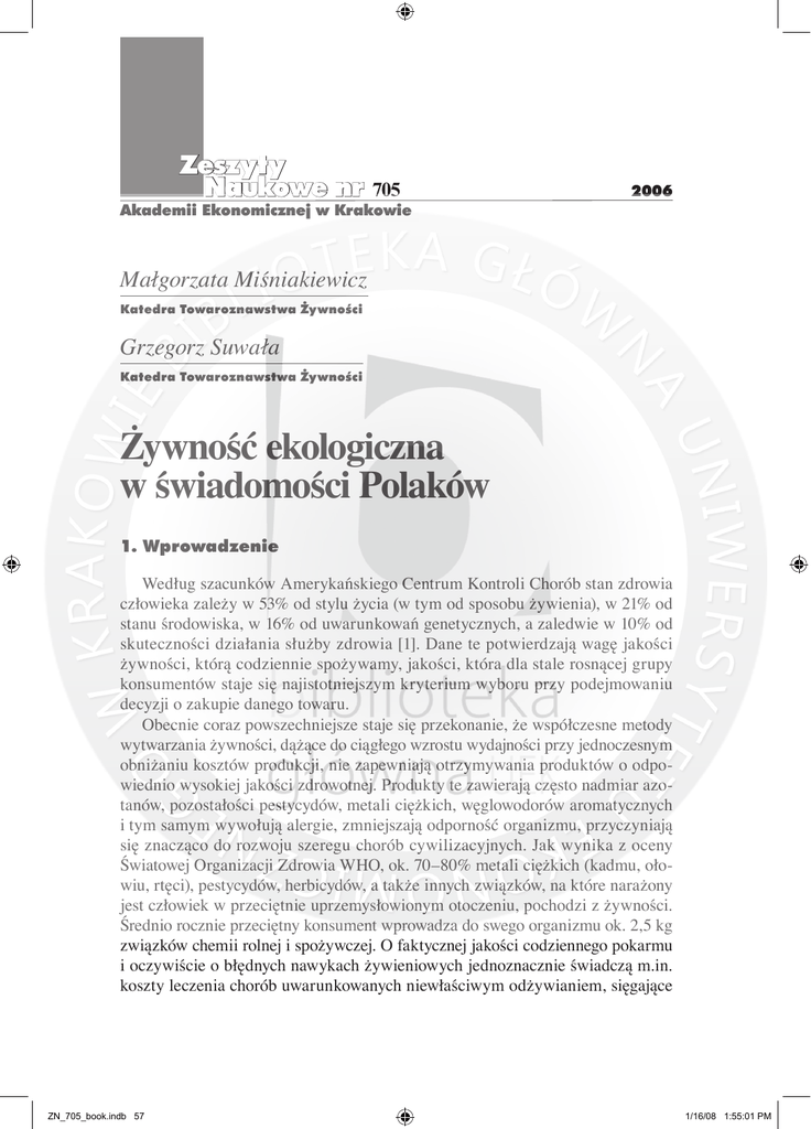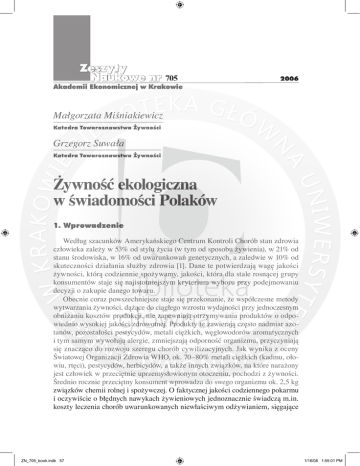 Zeszyty Naukowe nr 705 Akademii Ekonomicznej w Krakowie 2006 Małgorzata Miśniakiewicz Katedra Towaroznawstwa Żywności Grzegorz Suwała Katedra Towaroznawstwa Żywności Żywność ekologiczna w świadomości Polaków 1. Wprowadzenie Według szacunków Amerykańskiego Centrum Kontroli Chorób stan zdrowia człowieka zależy w 53% od stylu życia (w tym od sposobu żywienia), w 21% od stanu środowiska, w 16% od uwarunkowań genetycznych, a zaledwie w 10% od skuteczności działania służby zdrowia [1]. Dane te potwierdzają wagę jakości żywności, którą codziennie spożywamy, jakości, która dla stale rosnącej grupy konsumentów staje się najistotniejszym kryterium wyboru przy podejmowaniu decyzji o zakupie danego towaru. Obecnie coraz powszechniejsze staje się przekonanie, że współczesne metody wytwarzania żywności, dążące do ciągłego wzrostu wydajności przy jednoczesnym obniżaniu kosztów produkcji, nie zapewniają otrzymywania produktów o odpowiednio wysokiej jakości zdrowotnej. Produkty te zawierają często nadmiar azotanów, pozostałości pestycydów, metali ciężkich, węglowodorów aromatycznych i tym samym wywołują alergie, zmniejszają odporność organizmu, przyczyniają się znacząco do rozwoju szeregu chorób cywilizacyjnych. Jak wynika z oceny Światowej Organizacji Zdrowia WHO, ok. 70–80% metali ciężkich (kadmu, ołowiu, rtęci), pestycydów, herbicydów, a także innych związków, na które narażony jest człowiek w przeciętnie uprzemysłowionym otoczeniu, pochodzi z żywności. Średnio rocznie przeciętny konsument wprowadza do swego organizmu ok. 2,5 kg związków chemii rolnej i spożywczej. O faktycznej jakości codziennego pokarmu i oczywiście o błędnych nawykach żywieniowych jednoznacznie świadczą m.in. koszty leczenia chorób uwarunkowanych niewłaściwym odżywianiem, sięgające ZN_705_book.indb 57 1/16/08 1:55:01 PM 58 Małgorzata Miśniakiewicz, Grzegorz Suwała np. w Niemczech 30 mld euro. W Polsce brak jest wiarygodnych danych na ten temat, ale można przypuszczać, że są one równie niepokojące [6, 15]. W takiej sytuacji, przy stale rosnącej świadomości ekologicznej i żywieniowej społeczeństwa, coraz większa grupa konsumentów poszukuje żywności ekologicznej, organicznej, mało przetworzonej, pochodzącej z certyfikowanych gospodarstw ekologicznych. Żywność ta umożliwia nie tylko podtrzymanie procesów przemiany materii w organizmie, ale także przyczynia się do zachowania dobrego stanu zdrowia i tym samym stanowi ważny element profilaktyki zdrowotnej społeczeństwa [4, 16, 17]. Celem niniejszej pracy jest określenie poziomu zainteresowania Polaków żywnością ekologiczną, stopnia zrozumienia podstawowych pojęć z nią związanych oraz znajomości znaków pozwalających na odróżnienie żywności ekologicznej od konwencjonalnej. Szczególną uwagę zwrócono na ustalenie świadomości w zakresie żywności ekologicznej mieszkańców Krakowa, bo jak wynika z dostępnych danych literaturowych, przeciętny konsument żywności ekologicznej to mieszkaniec dużego miasta, o średnim lub wyższym wykształceniu oraz wyższych niż przeciętne dochodach na członka rodziny, a także uczniowie i studenci, co jest wynikiem prowadzonej w szkołach i na uczelniach edukacji ekologicznej [4, 7, 19]. 2. Charakterystyka żywności ekologicznej Żywność pochodząca z rolnictwa i przetwórstwa ekologicznego określana jest jako ekologiczna, biologiczna, organiczna lub biodynamiczna. Tego typu rolnictwo oznacza system gospodarowania o zrównoważonej produkcji roślinnej i zwierzęcej, co pozwala osiągnąć równowagę paszowo-nawozową w obrębie gospodarstwa, oparty na środkach pochodzenia biologicznego i mineralnego nieprzetworzonych technologicznie. Podstawową zasadą jest odrzucenie w procesie produkcji żywności środków chemii rolnej, weterynaryjnej i spożywczej, dzięki czemu uzyskuje się wysoką, tzw. pierwotną jakość biologiczną płodów rolnych zbliżoną do jakości żywności powstałej naturalnie, bez ingerencji człowieka [9, 13, 17, 21]. Taki system gospodarowania pozwala jednocześnie na zachowanie walorów środowiska naturalnego, jego bioróżnorodności, a zarazem chroni glebę, wodę i krajobraz. W epoce globalnego zanieczyszczenia nie ma już niestety terenów nieskażonych ani całkowicie naturalnych produktów żywnościowych. Dokonując jednak zakupów w świadomy sposób można znacząco ograniczyć niebezpieczeństwo spożywania zanieczyszczeń. Rolnictwo ekologiczne nie daje stuprocentowej gwarancji, że jego produkty będą całkowicie wolne od transgranicznych zanieczyszczeń pochodzących z powietrza (obecność pestycydów wykryto nawet w lodach Antarktydy), gleby, wody i innych źródeł znajdujących się poza kontrolą rolnika, choć wymaga spełnienia określonych kryteriów środowiskowych [10]. Ogólnie ZN_705_book.indb 58 1/16/08 1:55:01 PM Żywność ekologiczna w świadomości Polaków 59 z uwagi na globalne zanieczyszczenie środowiska nie można zagwarantować, że jakakolwiek żywność będzie wolna od zanieczyszczeń. W rolnictwie ekologicznym obowiązuje zasada kontroli procesu wytwarzania, a nie produktu – przyjmuje się, że jeśli warunki środowiskowe nie budzą zastrzeżeń, to jakość produktów rolniczych zależy od sposobu wytwarzania. Zdaniem znawców tematu, bywa to powodem ograniczonego zaufania do jakości ekologicznych produktów żywnościowych wśród coraz liczniejszej grupy konsumentów. Wysokie koszty badań analitycznych, trudności z uzyskaniem wiarygodnych wyników niektórych analiz, np. oznaczeń jakościowych i ilościowych pozostałości pestycydów, czy w końcu brak zadowalających metod analitycznych do określania jakości żywności ekologicznej – to najczęściej wymieniane przyczyny uznania sposobu produkcji za podstawę atestowania produktów z rolnictwa ekologicznego [9, 14]. Jedynym czynnikiem decydującym o
