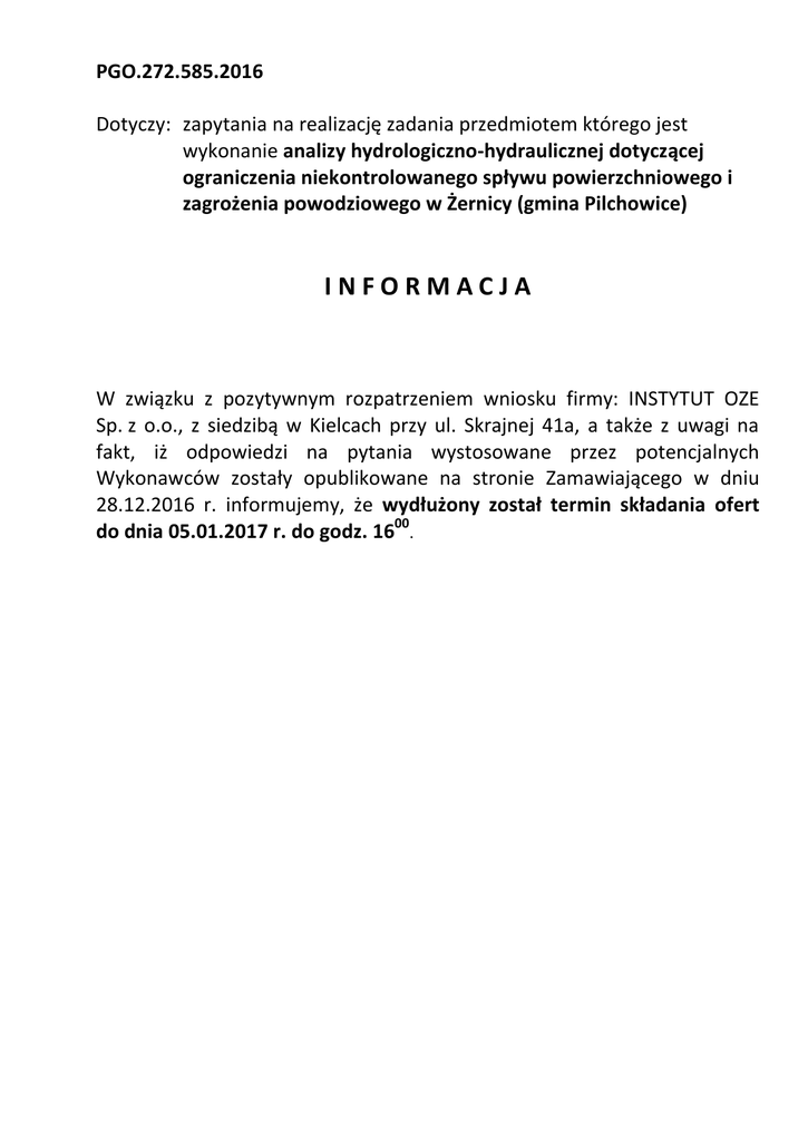 PGO.272.585.2016 Dotyczy: zapytania na realizację zadania przedmiotem którego jest wykonanie analizy hydrologiczno-hydraulicznej dotyczącej ograniczenia niekontrolowanego spływu powierzchniowego i zagrożenia powodziowego w Żernicy (gmina Pilchowice) INFORMACJA W związku z pozytywnym rozpatrzeniem wniosku firmy: INSTYTUT OZE Sp. z o.o., z siedzibą w Kielcach przy ul. Skrajnej 41a, a także z uwagi na fakt, iż odpowiedzi na pytania wystosowane przez potencjalnych Wykonawców zostały opublikowane na stronie Zamawiającego w dniu 28.12.2016 r. informujemy, że wydłużony został termin składania ofert do dnia 05.01.2017 r. do godz. 1600.