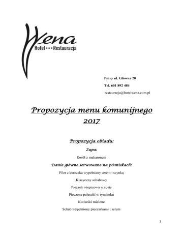 Psary ul. Główna 20 Tel. 601 892 484 [email protected] Propozycja menu komunijnego 2017 Propozycja obiadu: Zupa: Rosół z makaronem Danie główne serwowane na półmiskach: Filet z kurczaka wypełniany serem i szynką Klasyczny schabowy Pieczeń wieprzowa w sosie Pieczone pałeczki w tymianku Kotleciki mielone Schab wypełniony pieczarkami i serem 1 Dodatki: Ziemniaki, kluski śląskie Bukiet surówek Deser: bez ograniczeń Patery ciast Napoje: bez ograniczeń Kawa, herbata Sok owocowy, napoje, woda mineralna Cena 95zł. /osoba Propozycja II Zupa: Rosół z makaronem Danie główne serwowane na półmiskach: Filet z kurczaka wypełniany serem i szynką Klasyczny schabowy Pieczeń wieprzowa w sosie Pieczone pałeczki w tymianku Kotleciki mielone Dodatki: Ziemniaki, kluski śląskie Bukiet surówek 2 Deser: bez ograniczeń Patery ciast Napoje: bez ograniczeń Kawa, herbata Sok owocowy, napoje, woda mineralna Zimne przekąski; Karczek w ziołach Schab wypełniony morelą Mini kuleczki drobiowe podawane dipem Terina drobiowa z papryką Sałatka tradycyjna z jajkiem Tymbaliki drobiowe Pomidory przełożone mozzarelą Sałatka z grillowanym kurczakiem Kawałeczki kurczaka w cieście francuskim Pikle Pieczywo Cena 125 zł. / osoba Propozycja III Zupa: Rosół z makaronem Danie główne serwowane na półmiskach: Sakiewki z polędwiczki wieprzowej wypełnione grzybami Pieczone pałeczki w tymianku Schab wypełniony pieczarkami i serem Roladki drobiowe z szynką i serem Roladki wołowe z tradycyjnym farszem w sosie pieczeniowym 3 Klasyczny schabowy Dodatki: Kluski śląskie, ziemniaki Bukiet surówek Deser: bez ograniczeń Patery ciast Napoje bez ograniczeń Kawa, herbata, Sok owocowy, napoje, woda mineralna Zimne przekąski; Karczek w ziołach Schab wypełniony morelą Rolada drobiowa z kolorową papryką Nadziewany boczek wędzony Mini kotleciki drobiowe podawane z dipem Rolada szpinakowa z łososiem wędzonym Tymbaliki drobiowe Sałatka tradycyjna z jajkiem Sałatka capresse Kawałeczki kurczaka w cieście francuskim Jajka faszerowane Sałatka z grillowanym kurczakiem Pikle Pieczywo Danie ciepłe : Gulaszowa z warzywami Lub Barszcz czerwony z krokietem Cena 145 zł od osoby 4 Istnieje możliwość zamówienia w restauracji tortu komunijnego w kształcie księgi lub kielicha 60 zł/ kg Propozycja dań ciepłych: Barszcz z krokietem z farszem kapustnym 10 zł od osoby Gulaszowa z warzywami 10 zł od osoby Dla naszych gości podczas przyjęcia komunijnego zapewniamy dodatkowe atrakcje. Zapewnią one wyśmienitą zabawę najmłodszym, a Państwu chwilę czasu na wspólne rozmowy w rodzinnym gronie. Na specjalne życzenie: fontanna czekoladowa z owocami Atrakcja dla dzieci – Zamek dmuchany ze zjeżdżalnią. Dzieci do lat 6 – bezpłatnie Dzieci powyżej 6 lat – 100 % płatne 5
