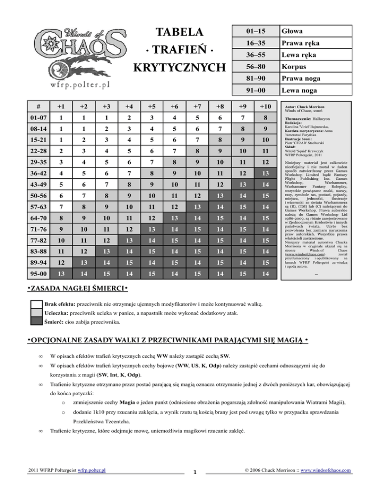 TABELA 01–15 Głowa ∙ TRAFIEŃ ∙ 16–35 Prawa ręka 36–55 Lewa ręka KRYTYCZNYCH 56–80 Korpus 81–90 Prawa noga 91–00 Lewa noga # +1 +2 +3 +4 +5 +6 +7 +8 +9 +10 01-07 1 1 1 2 3 4 5 6 7 8 08-14 1 1 2 3 4 5 6 7 8 9 15-21 1 2 3 4 5 6 7 8 9 10 22-28 2 3 4 5 6 7 8 9 10 11 29-35 3 4 5 6 7 8 9 10 11 12 36-42 4 5 6 7 8 9 10 11 12 13 43-49 5 6 7 8 9 10 11 12 13 14 50-56 6 7 8 9 10 11 12 13 14 15 57-63 7 8 9 10 11 12 13 14 15 14 64-70 8 9 10 11 12 13 14 15 14 15 71-76 9 10 11 12 13 14 15 14 15 14 77-82 10 11 12 13 14 15 14 15 14 15 83-88 11 12 13 14 15 14 15 14 15 14 89-94 12 13 14 15 14 15 14 15 14 15 95-00 13 14 15 14 15 14 15 14 15 14 Autor: Chuck Morrison Winds of Chaos, 2006 Tłumaczenie: Hallucyon Redakcja: Karolina 'Viriel' Bujnowska, Korekta merytoryczna: Anna 'Ameratsu' Faryńska Ilustracje broni: Piotr 'CE2AR' Stachurski Skład: Witold 'Squid' Krawczyk WFRP Poltergeist, 2011 Niniejszy materiał jest całkowicie nieoficjalny i nie został w żaden sposób zatwierdzony przez Games Workshop Limited bądź Fantasy Flight Publishing Inc. Games Workshop, Warhammer, Warhammer Fantasy Roleplay, wszystkie powiązane znaki, nazwy, rasy, symbole ras, postaci, pojazdy, miejsca, jednostki, ilustracje i wizerunki ze świata Warhammera są (R), (TM) lub (C) należącymi do Games Workshop. Prawa autorskie należą do Games Workshop Ltd 1986-2009, są różnie zarejestrowane w Zjednoczonym Królestwie i innych państwach świata. Użyto bez pozwolenia bez zamiaru naruszenia praw autorskich. Wszystkie prawa właścicieli zastrzeżone. Niniejszy materiał autorstwa Chucka Morrisona w oryginale ukazał się na stronie Winds of Chaos (www.windsofchaos.com) został przetłumaczony i opublikowany na łamach WFRP Poltergeist za wiedzą i zgodą autora. ∙∙∙ ∙ZASADA NAGŁEJ ŚMIERCI∙ Brak efektu: przeciwnik nie otrzymuje ujemnych modyfikatorów i może kontynuować walkę. Ucieczka: przeciwnik ucieka w panice, a napastnik może wykonać dodatkowy atak. Śmierć: cios zabija przeciwnika. ∙OPCJONALNE ZASADY WALKI Z PRZECIWNIKAMI PARAJĄCYMI SIĘ MAGIĄ ∙ • W opisach efektów trafień krytycznych cechę WW należy zastąpić cechą SW. • W opisach efektów trafień krytycznych cechy bojowe (WW, US, K, Odp) należy zastąpić cechami odnoszącymi się do korzystania z magii (SW, Int, K, Odp). • Trafienie krytyczne otrzymane przez postać parającą się magią oznacza otrzymanie jednej z dwóch poniższych kar, obowiązującej do końca potyczki: o zmniejszenie cechy Magia o jeden punkt (odniesione obrażenia pogarszają zdolność manipulowania Wiatrami Magii), o dodanie 1k10 przy rzucaniu zaklęcia, a wynik rzutu tą kością brany jest pod uwagę tylko w przypadku sprawdzania Przekleństwa Tzeentcha. • Trafienie krytyczne, które odejmuje mowę, uniemożliwia magikowi rzucanie zaklęć. 2011 WFRP Poltergeist wfrp.polter.pl 1 © 2006 Chuck Morrison :: www.windsofchaos.com ∙EFEKTY TRAFIEŃ KRYTYCZNYCH – BRONIE SIECZNE∙ RĘKA GŁOWA 1. Ostrze broni powoduje niewielkie zadraśnięcie skóry nadgarstka. Spływająca krew sprawia, że na początku następnej rundy przeciwnik musi wykonać Wymagający (-10) test Walki Wręcz, aby nie upuścić trzymanych w dłoni przedmiotów. 2. Ostrze broni rozcina palec tak boleśnie, że przeciwnik musi wykonać Trudny (-20) test Odporności, by nie upuścić trzymanych w dłoni przedmiotów. 3. Ostrze broni zagłębia się w bicepsie przeciwnika. Zraniony musi wykonać Bardzo Trudny (-30) test Odporności, aby nie upuścić trzymanych w dłoni przedmiotów. Do końca potyczki parowanie z użyciem tej ręki obarczone jest modyfikatorem -20. 4. Ostrze broni zagłębia się w mięśniu naramiennym przeciwnika, powodując tak silny ból, że upuszcza on trzymane w dłoni przedmioty. Do końca potyczki Walka Wręcz przeciwnika jest obniżona o 5 punktów. 5. Ostrze broni rozcina ramię na całej długości. Ból jest tak silny, że przeciwnik upuszcza trzymane w dłoni przedmioty. Musi wykonać Wymagający (-10) test Siły Woli, by nie upuścić przedmiotów trzymanych w drugiej dłoni. Do końca potyczki Walka Wręcz przeciwnika jest obniżona o 10 punktów. 6. Ostrze broni rozcina przeciwnikowi nadgarstek, zatrzymując się na kościach. Upuszcza on trzymane w dłoni przedmioty i nie może posługiwać się zranioną ręką przez następne 1k10/2 rund. Do chwili otrzymania pomocy medycznej lub magicznej jego Walka Wręcz jest obniżona o 20 punktów. 7. Ostrze broni przebija przedramię przeciwnika i zaklinowuje się między kośćmi. Upuszcza on wszystkie trzymane w dłoni przedmioty. Nie licząc wycia z bólu, przeciwnik nic nie może robić w najbliższej rundzie, zaś atakujący musi wykonać Łatwy (+20) test Krzepy, aby wyciągnąć broń. Zadaje to dodatkowe obrażenia z Siłą 2. 8. Ostrze broni przecina ścięgno bicepsa, przeciwnik upuszcza wszystkie trzymane w dłoni przedmioty. Krwawienie jest tak obfite, że do chwili otrzymania pomocy medycznej lub magicznej nie może posługiwać się zranioną ręką. Do momentu opatrzenia rany co rundę traci on 1 punkt Żywotności, a do czasu zastosowania chirurgicznej lub magicznej pomocy jego Walka Wręcz jest obniżona o 30 punktów. 9. Ostrze broni wrzyna się głęboko w ramię. Przeciwnik upuszcza trzymane w dłoni przedmioty i musi wykonać Bardzo Trudny (-30) test Siły Woli, by nie upaść. Utrata krwi jest tak duża, że do chwili opatrzenia rany traci co rundę 2 punkty Żywotności. Do końca potyczki jego Walka Wręcz oraz Krzepa jest obniżona o 20 punktów. 10. Ostrze broni odcina przeciwnikowi 1k10/2 palców, przy czym jeśli wypadnie 10, traci on całą dłoń, która zostaje odrąbana na wysokości nadgarstka. Przeciwnik musi wykonać Wymagający (-10) test Siły Woli, aby nie uciec. Za każdy odcięty palec jego Zręczność obniża się trwale o 3 punkty. 11. Ostrze broni odrąbuje przeciwnikowi rękę na wysokości łokcia, a jego Zręczność trwale obniża się o 15 pun