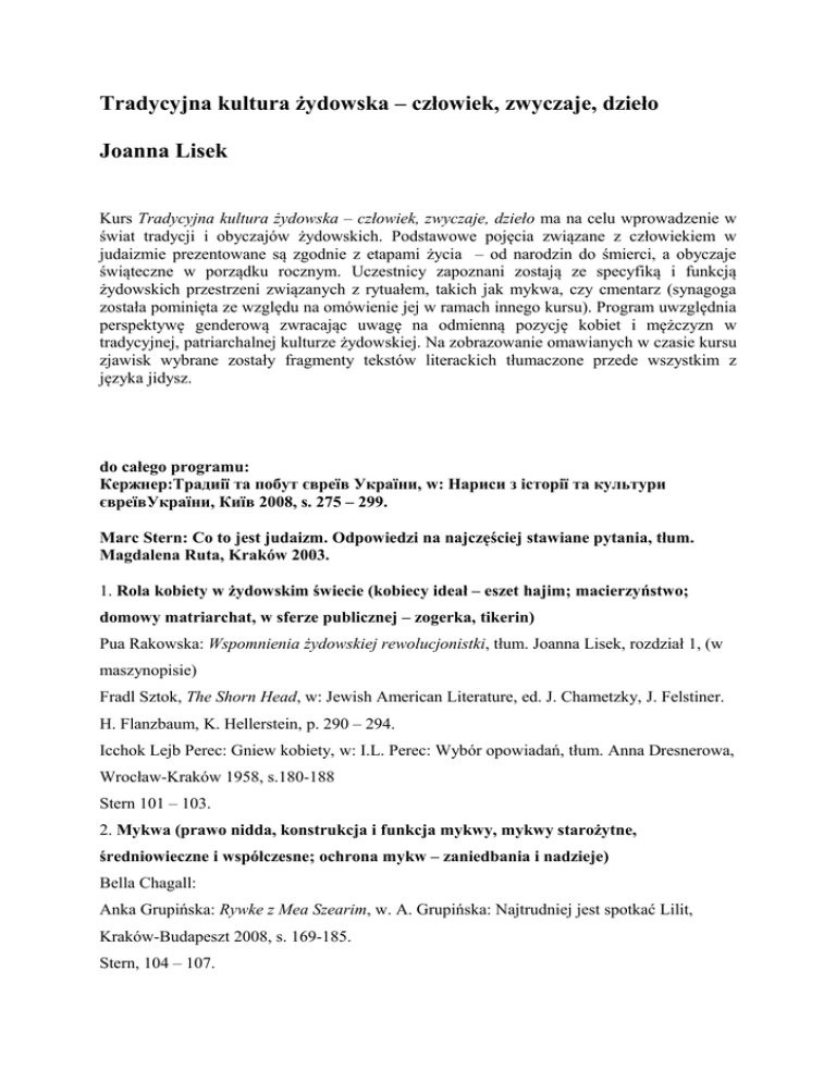 Tradycyjna kultura żydowska – człowiek, zwyczaje, dzieło Joanna Lisek Kurs Tradycyjna kultura żydowska – człowiek, zwyczaje, dzieło ma na celu wprowadzenie w świat tradycji i obyczajów żydowskich. Podstawowe pojęcia związane z człowiekiem w judaizmie prezentowane są zgodnie z etapami życia – od narodzin do śmierci, a obyczaje świąteczne w porządku rocznym. Uczestnicy zapoznani zostają ze specyfiką i funkcją żydowskich przestrzeni związanych z rytuałem, takich jak mykwa, czy cmentarz (synagoga została pominięta ze względu na omówienie jej w ramach innego kursu). Program uwzględnia perspektywę genderową zwracając uwagę na odmienną pozycję kobiet i mężczyzn w tradycyjnej, patriarchalnej kulturze żydowskiej. Na zobrazowanie omawianych w czasie kursu zjawisk wybrane zostały fragmenty tekstów literackich tłumaczone przede wszystkim z języka jidysz. do całego programu: Кержнер:Традиії та побут євреїв України, w: Нариси з історії та культури євреївУкраїни, Київ 2008, s. 275 – 299. Marc Stern: Co to jest judaizm. Odpowiedzi na najczęściej stawiane pytania, tłum. Magdalena Ruta, Kraków 2003. 1. Rola kobiety w żydowskim świecie (kobiecy ideał – eszet hajim; macierzyństwo; domowy matriarchat, w sferze publicznej – zogerka, tikerin) Pua Rakowska: Wspomnienia żydowskiej rewolucjonistki, tłum. Joanna Lisek, rozdział 1, (w maszynopisie) Fradl Sztok, The Shorn Head, w: Jewish American Literature, ed. J. Chametzky, J. Felstiner. H. Flanzbaum, K. Hellerstein, p. 290 – 294. Icchok Lejb Perec: Gniew kobiety, w: I.L. Perec: Wybór opowiadań, tłum. Anna Dresnerowa, Wrocław-Kraków 1958, s.180-188 Stern 101 – 103. 2. Mykwa (prawo nidda, konstrukcja i funkcja mykwy, mykwy starożytne, średniowieczne i współczesne; ochrona mykw – zaniedbania i nadzieje) Bella Chagall: Anka Grupińska: Rywke z Mea Szearim, w. A. Grupińska: Najtrudniej jest spotkać Lilit, Kraków-Budapeszt 2008, s. 169-185. Stern, 104 – 107. 3. Starość i śmierć (choroba, umieranie, chewra kadisza, żałoba) Frida Himelblau: Pomoc medyczna w Pińczowie, Złe oko, Chewra Kadisza, w: Sefer zikaron lekehilat Pinczew, tłum. Joanna Lisek, Tel Awiw 1970 (przekład w maszynopisie) 193-201. Кержнер, s. 290 – 292; Stern, s. 51 – 62. 4. Cmentarz (lokalizacja cmentarza, przestrzeń, macewy żydowskie – symbolika, inskrypcje, odwiedzanie cmentarza, zwyczaje - ślub na cmentarzu, mierzenie cmentarza; groby cadyków, kwitlech) Izrael Joszua Singer: Josie Kalb, Warszawa 1961, s. 204-215. 5. Dziecko w kulturze żydowskiej (poczęcie, narodziny, obrzezanie, wykupienie pierworodnego, nauka – cheder, jesziwa) Szolem Alejchem: Z jarmarku, tłum. Michał Fridman, Wrocław 1989, s. 133-142 (Dawny cheder, Bar micwa); Regina Lilientalowa: Dziecko żydowskie, Warszawa 2007, s.17-39. Кержнер, s. 287 – 288; Stern, 26 – 37. 6. Wejście w dorosłość (bat micwa, bar micwa, swaty, kontrakt ślubny - ketuba, ślub, prawo lewiratu - chalica) Izrael Joszua Singer: Josie Kalb, Warszawa 1961, s.29-41. Alter Kacyzne: Swaty w Parczewie, w: Alter Kacyzne: Chore perły i inne opowiadania, Wrocław 1999, s. 149-161. Кержнер, 288 – 290; Stern, 38 – 51. 7. Rola mężczyzny w żydowskim świecie (specyfika żydowskiego patriarchatu; męski ideał – geniusz talmudyczny i jego konsekwencje; kest – lata u teściów; w sferze publicznej – w synagodze i gminie) Salomon Majmon: Autobiografia, tłum. Leo Belmont, Warszawa 2007, s. 88-100. Stern, 116 - 123 8. Żydowski dom (znaki na domu – mezuza, mizrachi; finanse – cedaka; życie seksualne, rozwód) Anna Grupińska: Zwyczajna rzecz, jak każda inna; Malke; w: A. Grupińska: Najtrudniej jest spotkać Lilit, Kraków – Budapeszt 2008, 191-199, 219-239. Isaac Bashevis Singer: Upominek purimowy, w: I.B. Singer: Urząd mojego ojca, tłum. Irena Wyrzykowska,Warszawa 1992, s. 65-69. Stern, 121 – 123, 131 - 133. 8. Zasady koszerności (pokaramy czyste i nieczyste; ubój – szechita, mięso i mleko; w żydowskiej kuchni) Isaac Bashevis Singer: Dlaczego gęsi krzyczały?, w: I.B. Singer: Urząd mojego ojca, tłum. Irena Wyrzykowska,Warszawa 1992, s. 13-17. Кержнер, 282 – 284; Stern, 123 – 130. 10-12. Kalendarz żydowski i święta (3 godz.) Bella Chagall, Płonące świece, tłum. Jolanta Sell, Kraków 1978, tu: Szabes, s.32 – 52. Кержнер, s. 275 – 282, Stern, s. 63 – 100. Stern, 104 – 107.