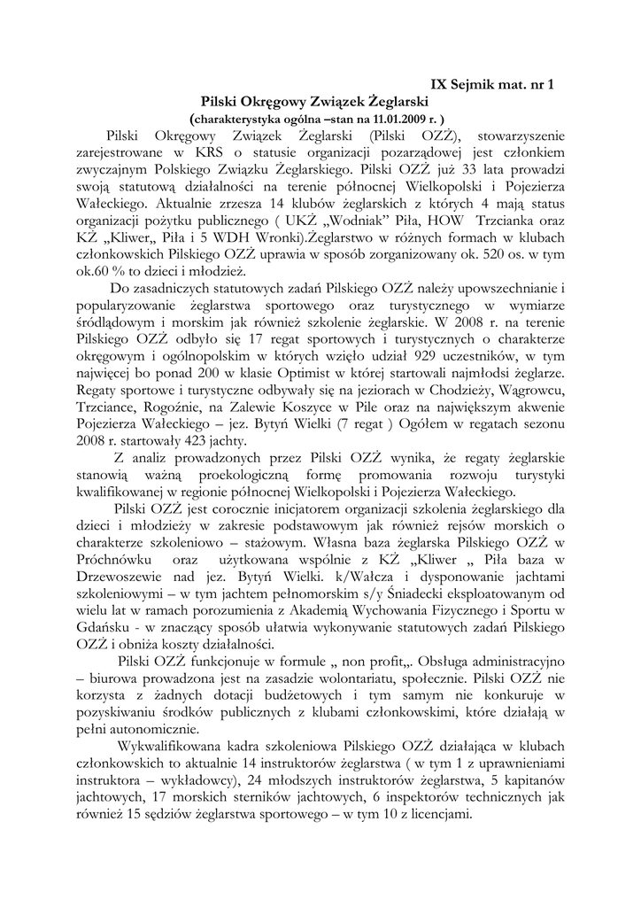 IX Sejmik mat. nr 1 Pilski Okręgowy Związek śeglarski (charakterystyka ogólna –stan na 11.01.2009 r. ) Pilski Okręgowy Związek śeglarski (Pilski OZś), stowarzyszenie zarejestrowane w KRS o statusie organizacji pozarządowej jest członkiem zwyczajnym Polskiego Związku śeglarskiego. Pilski OZś juŜ 33 lata prowadzi swoją statutową działalności na terenie północnej Wielkopolski i Pojezierza Wałeckiego. Aktualnie zrzesza 14 klubów Ŝeglarskich z których 4 mają status organizacji poŜytku publicznego ( UKś ,,Wodniak” Piła, HOW Trzcianka oraz Kś ,,Kliwer,, Piła i 5 WDH Wronki).śeglarstwo w róŜnych formach w klubach członkowskich Pilskiego OZś uprawia w sposób zorganizowany ok. 520 os. w tym ok.60 % to dzieci i młodzieŜ. Do zasadniczych statutowych zadań Pilskiego OZś naleŜy upowszechnianie i popularyzowanie Ŝeglarstwa sportowego oraz turystycznego w wymiarze śródlądowym i morskim jak równieŜ szkolenie Ŝeglarskie. W 2008 r. na terenie Pilskiego OZś odbyło się 17 regat sportowych i turystycznych o charakterze okręgowym i ogólnopolskim w których wzięło udział 929 uczestników, w tym najwięcej bo ponad 200 w klasie Optimist w której startowali najmłodsi Ŝeglarze. Regaty sportowe i turystyczne odbywały się na jeziorach w ChodzieŜy, Wągrowcu, Trzciance, Rogoźnie, na Zalewie Koszyce w Pile oraz na największym akwenie Pojezierza Wałeckiego – jez. Bytyń Wielki (7 regat ) Ogółem w regatach sezonu 2008 r. startowały 423 jachty. Z analiz prowadzonych przez Pilski OZś wynika, Ŝe regaty Ŝeglarskie stanowią waŜną proekologiczną formę promowania rozwoju turystyki kwalifikowanej w regionie północnej Wielkopolski i Pojezierza Wałeckiego. Pilski OZś jest corocznie inicjatorem organizacji szkolenia Ŝeglarskiego dla dzieci i młodzieŜy w zakresie podstawowym jak równieŜ rejsów morskich o charakterze szkoleniowo – staŜowym. Własna baza Ŝeglarska Pilskiego OZś w Próchnówku oraz uŜytkowana wspólnie z Kś ,,Kliwer „ Piła baza w Drzewoszewie nad jez. Bytyń Wielki. k/Wałcza i dysponowanie jachtami szkoleniowymi – w tym jachtem pełnomorskim s/y Śniadecki eksploatowanym od wielu lat w ramach porozumienia z Akademią Wychowania Fizycznego i Sportu w Gdańsku - w znaczący sposób ułatwia wykonywanie statutowych zadań Pilskiego OZś i obniŜa koszty działalności. Pilski OZś funkcjonuje w formule ,, non profit,,. Obsługa administracyjno – biurowa prowadzona jest na zasadzie wolontariatu, społecznie. Pilski OZś nie korzysta z Ŝadnych dotacji budŜetowych i tym samym nie konkuruje w pozyskiwaniu środków publicznych z klubami członkowskimi, które działają w pełni autonomicznie. Wykwalifikowana kadra szkoleniowa Pilskiego OZś działająca w klubach członkowskich to aktualnie 14 instruktorów Ŝeglarstwa ( w tym 1 z uprawnieniami instruktora – wykładowcy), 24 młodszych instruktorów Ŝeglarstwa, 5 kapitanów jachtowych, 17 morskich sterników jachtowych, 6 inspektorów technicznych jak równieŜ 15 sędziów Ŝeglarstwa sportowego – w tym 10 z licencjami. Pilski OZś posiada uprawnienia do egzaminowania do stopnia sternika jachtowego włącznie oraz do szkolenia na patenty młodszych instruktorów Ŝeglarstwa (MIś). W 2008 r. uprawnienia Ŝeglarza jachtowego w wyniku egzaminów przeprowadzonych przez komisję Pilskiego OZś uzyskało 51 osób. Obowiązujące od 01.01.2008 r. nowe przepisy liberalizujące kwalifikacje wymagane do uprawiania Ŝeglarstwa nie spowodowały - w warunkach działania Pilskiego OZś w 2008 r. – istotnego zmniejszenia zainteresowania uzyskiwaniem uprawnień Ŝeglarskich. Podobnie przedstawia się – po zmianie przepisów – sprawa rejestracji jachtów na terenie działania Pilskiego OZś. Dobrowolną rejestrację jachtów, na Ŝyczenie armatora lub właściciela nadal prowadzi Pilski OZś. W realizacji zadań statutowych Pilski OZś współpracuje – m.in.za pośrednictwem klubów członkowskich –z samorządami lokalnymi miast i gmin oraz wieloma innymi organizacjami pozarządowymi, w tym z prowadzącymi działalność w środowisku osób niepełnosprawnych. Warto podkreślić bardzo dobrą wieloletnią współpracę z KH ZHP w Pile w zakresie popularyzowania Ŝeglarstwa wśród najmłodszych. Jednym z przykładów tej współpracy jest korzystanie z bazy socjalno-Ŝywieniowej stanicy KH ZHP w Próchnówku nad jez. Bytyń Wlk. W bazie szkoleniowej Pilskiego OZś zlokalizowanej bardzo blisko tej stanicy odbywają się corocznie - w 2-3 turnusach - obozy Ŝeglarskie. W 2008 r. obóz szkoleniowy w Próchnówku zorganizował Pilski OZś wspólnie z BT ..Ferajna” z Poznania oraz Kś ,,Opty” z ChodzieŜy, HOW MDK Trzcianka i Klub Płetwonurków ,,Rafa,, z Piły. Od 1989 w bazie tej Pilski OZś wyszkolił ponad 1400 najmłodszych Ŝeglarzy. W sezonie 2008 odbyły się teŜ 2 morskie rejsy staŜowo – turystyczne Pilskiego OZś na s/y Śniadecki na ciekawych trasach a mianowicie przez Bałtyk do Sztokholmu i dalej przez wielkie szwedzkie jezioro Wenern i Kanał Gota , do Goeteborga i Kopenhagi ( załoga Kś ,,Kliwer,, Piła ) oraz w rejonie środkowego Bałtyku z wejściem do szwedzkiej Karlskrony (załoga Kś ,,Opty,, ChodzieŜ.) Znaczącym wydarzeniem Ŝeglarskim sezonu – nawet w wymiarze jachtingu światowego - było przejście w styczniu 2008 r. Przylądka Horn oraz z lutym 2008 r. rekordowe zejście poniŜej 68 stopnia szerokości pd. na Antarktydzie przez Kol. Zbigniewa Romanowskiego ( Kś ,,Mewa” Piła) na jachcie ,,Bona Terra”. Jacht ten kilka tygodni później zatonął w silnym sztormie na Atlantyku – w rejonie Przylądka Horn. Na szczęście obyło się bez ofiar. Rejsowi s/y Bona Terra w którym uczestniczył Zbigniew Romanowski - organizowanemu w ramach ekspedycji ,,Sails of Antarctica”- patronował między innymi Pilski OZś. Warto przypomnieć, Ŝe za tym samym jachcie w listopadzie 2007 r. Przylądek Horn opłynął Jarosław Gawrysiak (Kś ,