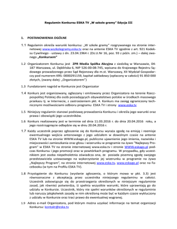 Regulamin Konkursu ESKA TV „W szkole gramy” Edycja III 1. POSTANOWIENIA OGÓLNE 1.1 Regulamin określa warunki konkursu: „W szkole gramy” rozgrywanego na stronie internetowej www.wszkolegramy.eska.tv oraz na antenie ESKA TV zgodnie z art. 921 Kodeksu Cywilnego - ustawy z dn. 23.04.1964 r. (Dz.U.Nr 16, poz. 93 z późn. zm.) – dalej zwanego „Konkursem” 1.2 Organizatorem Konkursu jest ZPR Media Spółka Akcyjna z siedzibą w Warszawie, 04187 Warszawa, ul. Dęblińska 6, NIP 526-00-08-745, wpisana do Krajowego Rejestru Sądowego prowadzonego przez Sąd Rejonowy dla m.st. Warszawy, XII Wydział Gospodarczy pod numerem KRS: 0000291159, kapitał zakładowy (opłacony w całości) 91 850 000 złotych, (zwany dalej: „Organizatorem”) 1.3 Fundatorami nagród w Konkursie jest Organizator 1.4 Konkurs jest organizowany, ogłaszany i emitowany przez Organizatora na terenie Rzeczpospolitej Polskiej dla osób posiadających obywatelstwo polskie w środkach masowego przekazu tj. w Internecie, z zastrzeżeniem pkt. 4. Konkurs ma zasięg ograniczony technicznymi możliwościami odbioru programu ESKA TV i strony www.eska.tv 1.5 Niniejszy regulamin stanowi podstawę prowadzenia Konkursu i określa jego warunki oraz prawa i obowiązki jego uczestników. 1.6 Konkurs realizowany jest w terminie od dnia 11.03.2016 r. do dnia 20.04.2016 roku, a jego rozstrzygnięcie odbędzie się w dniu 20.04.2016 r. 1.7 Każdy uczestnik poprzez zgłoszenie się do Konkursu wyraża zgodę na emisję i reemisje ewentualnego wejścia antenowego z jego udziałem w dowolnym czasie na antenie ESKA TV lub na stronie WWW.eskago.pl, publiczne ujawnienie jego imienia, nazwiska i miejscowości zamieszkania oraz głosu i wizerunku w programie na żywo "Najlepszy Program" w ESKA TV na stronie internetowej www.eska.tv i stronie WWW.eskago.pl podczas Konkursu i jego promocji oraz w powtórkach programu. W przypadku, gdy uczestnikiem jest osoba niepełnoletnia oświadcza ona, że posiada pisemną zgodę swojego przedstawiciela ustawowego na wykorzystanie jej wizerunku w programie na żywo „Najlepszy Program”, na stronie internetowej www.eska.tv, www.eskago.pl oraz na Facebooku (w tym na Profilu ESKA TV). 1.8 Przystąpienie do Konkursu (wysłanie zgłoszenia, o którym mowa w pkt. 3.3) jest równoznaczne z akceptacją przez uczestnika niniejszego regulaminu w całości. Uczestnik zobowiązuje się do przestrzegania określonych w niniejszym regulaminie zasad, jak również potwierdza, iż spełnia wszystkie warunki, które uprawniają go do udziału w Konkursie. Uczestnik, który nie spełni warunków określonych w regulaminie lub naruszy jakąkolwiek zasadę w nim określoną może być w każdym czasie wykluczony z udziału w Konkursie oraz traci prawo do ewentualnej wygranej. 1.9 Adres e-mail Organizatora, pod którym można uzyskać informacje na temat organizacji Konkursu: [email protected] 2. Nagrody 2.1 Zwycięzca Konkursu otrzyma nagrodę rzeczową w postaci 5 (pięciu) płyt zespołu Enej „Paparanoja” z podpisami zespołu. Łączna wartość nagrody rzeczowej to 190 zł (słownie: złotych sto dziewięćdziesiąt) brutto. 2.2 Dodatkowo Organizator przekaże szkole Zwycięzcy Konkursu darowiznę pieniężną o wartości 10 000 zł (słownie: dziesięciu tysięcy złotych) brutto na zakup sprzętu dydaktycznego oraz w ramach działań promocyjnych stacji ESKA TV zorganizuje koncert zepsołu Enej w szkole zwycięzcy, wyłonionym zgodnie z pkt. 3.6. 2.3 Koncert odbędzie się 28.04.2016 roku. Jeżeli szkoła odmówi udostępnienia miejsca na koncert w danym terminie traci ona prawo do świadczeń o których mowa w pkt. 2.2. W takim wypadku świadczenia, o których mowa w pkt. 2.2 przechodzą na szkołę finalisty, który zajął drugie miejsce w ETAPIE II konkursu, o którym mowa w pkt. 3.2 oraz pkt. 3.6 2.4 Wszyscy finaliści konkursu otrzymają nagrody pocieszenia w postaci pamiątkowych złotych płyt potwierdzających wejście do finału III edycji konkursu „W Szkole Gramy”. Wartość jednej nagrody pocieszenia to 339 zł (słownie: trzysta trzydzieści dziewięć złotych ) brutto. 2.5 W przypadku, gdy Nagrody podlegają opodatkowaniu zryczałtowanym podatkiem dochodowym od osób fizycznych zgodnie z art.21 ust.1 pkt 68 Ustawy z dn. 26.07.1991 r. o podatku dochodowym od osób fizycznych za pobranie od zwycięzców nagród i odprowadzenie należnego odpowiedzialny jest Organizator. 2.6 Organizator oświadcza, iż wszystkie nagrody zostaną wydane zgodnie z obowiązującymi przepisami prawa podatkowego. 2.7 Organizator nie ponosi odpowiedzialności za niemożność odbioru lub nieodebranie którejkolwiek nagrody, z jakiejkolwiek przyczyny leżącej po stronie nagrodzonego uczestnika. 2.8 Organizator nie ponosi odpowiedzialności za zmianę miejsca zamieszkania i/lub podanego przez uczestnika Konkursu adresu lub zmianę innych danych – uniemożliwiającą kontakt z tym uczestnikiem lub odebranie przez niego zestawu nagród/nagrody. 2.9 O szczegółach odbioru i realizacji nagród zwycięzca oraz finaliści Konkursu zostaną poinformowani przez Organizatora drogą mailową lub za pośrednictwem rozmowy telefonicznej. 2.10 Nagrody nieodebrane przez zwycięzcę Konkursu w terminie 90 dni od rozstrzygnięcia Konkursu przechodzą na własność Fundatorów. 2.4 Przy odbiorze przez zwycięzcę edycji Konkursu nagrody zobowiązany jest on okazać dokument potwierdzający jego tożsamość lub w przypadku odbioru tej nagrody przez pełnomocnika zwycięzcy zobowiązany jest on okazać pisemne upoważnienie od zwycięzcy, który wygrał daną nagrodę, zawierające następujące informacje: imię nazwisko, adres, numer i seria dowodu osobistego, telefon kontaktowy tego zwycięzcy oraz adnotację o upoważnieniu określonej osoby do odbioru w jego imieniu danej nagrody, jak również podpis tego zwycięzcy wraz z danymi osoby odbierającej czyli imieniem, nazwiskiem, serią i numerem dowodu osobistego oraz telefonem