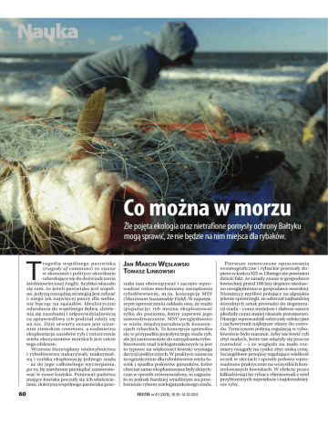 Nauka Co można w morzu Źle pojęta ekologia oraz nietrafione pomysły ochrony Bałtyku mogą sprawić, że nie będzie na nim miejsca dla rybaków. T ragedia wspólnego pastwiska (tragedy of commons) to znane w ekonomii i polityce określenie odwołujące się do doświadczenia średniowiecznej Anglii. Szybko okazało się tam, że jeżeli pastwisko jest wspólne, jedyną rozsądną strategią jest zebrać z niego jak najwięcej paszy dla siebie, nie bacząc na sąsiadów. Idealistyczne odwołania do wspólnego dobra, dzielenia się zasobami i odpowiedzialnością za sprawiedliw y ich podział zdały się na nic. Dziś otwarty ocean jest ostatnim ziemskim commons, a nadmierna eksploatacja zasobów ryb i zniszczenie wielu ekosystemów morskich jest także tego efektem. Wczesne biznesplany wielorybnictwa i rybołówstwa nakazywały maksymalną i szybką eksploatację jednego stada – aż do jego całkowitego wyczerpania, po to, by zarobione pieniądze zainwestować w nowe łowisko. Ponieważ państwa mające łowiska poczuły się ich właścicielami, doktryna wspólnego pastwiska prze- 60 JAN MARCIN WĘSŁAWSKI TOMASZ LINKOWSKI stała tam obowiązywać i zaczęto wprowadzać różne mechanizmy zarządzania rybołówstwem, m.in. koncepcję MSY (Maximum Sustainable Yield). W największym uproszczeniu zakłada ona, że stado (populację) ryb można eksploatować tylko do poziomu, który zapewni jego samoodtwarzanie. MSY uwzględniono w wielu międzynarodowych konwencjach rybackich. Ta koncepcja sprawdza się w przypadku pojedynczego stada ryb, ale jej zastosowanie do zarządzania rybołówstwem stad wielogatunkowych (a jest to typowe na większości łowisk) wymaga decyzji politycznych. W praktyce oznacza to ograniczenie dla rybołówstwa wielu łowisk i spadku połowów gatunków, które chociaż same eksploatowane były dotychczas w sposób zrównoważony, to zagrażało to jednak bardziej wrażliwym na przełowienie rybom wielogatunkowego stada. P OL I T Y K A nr 41 (2878), 10.10–16.10.2012 Pierwsze nowoczesne opracowania oceanograficzne i rybackie powstały dopiero w końcu XIX w. Dlatego nie powinien dziwić fakt, że zasady znane w gospodarce łowieckiej przed 100 laty dopiero niedawno uwzględniono w gospodarce morskiej. Niemieccy myśliwi polujący na alpejskie jelenie spostrzegli, że odstrzał najbardziej dorodnych sztuk prowadzi do degeneracji stada – coraz mniejsze i słabsze samce płodziły coraz mniej okazałe potomstwo. Dlatego wprowadzili odstrzały selekcyjne i zachowywali najlepsze okazy do rozrodu. Tymczasem jedyną regulacją w rybołówstwie było staranie, żeby nie łowić ryb zbyt małych, które nie zdążyły się jeszcze rozrodzić – i ze względu na małe rozmiary osiągały na rynku zbyt niską cenę. Szczegółowe przepisy regulujące wielkość oczek w sieciach i sposób połowu wprowadzono praktycznie na wszystkich kontrolowanych łowiskach. W efekcie przez kilkadziesiąt lat rybacy eliminowali z wód przybrzeżnych największe i najdorodniejsze ryby. nie stado w ymaga innych mechanizmów zarządzania. © TAIDA TARABUŁA/FORUM Mniej dorszy, więcej fok Ponieważ biologicznym celem każdego osobnika jest płodzenie potomstwa, dla ryby zagrożonej połowem strategia przetrwania była prosta – należy rozmnożyć się jak najszybciej, przy jak najmniejszych rozmiarach, które pozwolą uniknąć sieci. Ten teoretyczny wywód znalazł stosunkowo niedawno potwierdzenie naukowe – okazało się, że ewolucy jne zmiany mogą zachodzić w ciągu zaledwie kilku pokoleń. A zatem tak zmodyfikowane genetycz- Nieznajomość konsekwencji masowej eksploatacji łowisk prowadzi nie tylko do zmian w obrębie gatunku, ale z reguły pociąga za sobą kaskadę innych skutków. Klasycznym tego przykładem są zdewastowane łowiska Nowej Fundlandii – w latach 70. eksploatowano tam intensywnie wielkie ławice dorszy. Nie wytępiono gatunku, ale zredukowano jego liczebność tak bardzo, że rozmnożyły się mniejsze gatunki ryb, które wcześniej były pokarmem drapieżnych dorszy. Nagły wzrost liczby małych ryb (gromadnika, śledzia, witlinka) spowodował błyskawiczny wzrost populacji fok grenlandzkich, dla których właśnie te małe ryby (a nie wielkie dorsze, jak głosiła to propaganda) były najważniejszym pokarmem. Eksplozja demograficzna fok kanadyjskich nie była wynikiem działania Brigitte Bardot i zielonych, ale rabunkowego rybołówstwa. Teraz, po 30 latach od załamania łowisk, Kanada ma problem z 7 mln fok i brak perspektyw na powrót dorszy, bo na ich miejsce weszły krewetki i inne gatunki ryb – jak wiadomo, przyroda nie znosi próżni. Współczesne państwa mają arsenał środków kontroli swoich łowisk – od inspekcji rybackich po satelitarne śledzenie ruchów każdego kutra i szczegółową rejestrację połowu. W krajach posiadających bogate łowiska kontrola jest szczególnie rozbudowana i kary dotkliwe. O ile łamanie przepisów regulujących rybołówstwo w strefach przybrzeżnych można porów nać do k łusow nictwa, o tyle nielegalne połowy na wodach międzynarodowych bardziej przypominają piractwo. Statki rybackie, które często zmieniają nazwy i port macierzysty, operują bez litości na wodach poza kontrolą międzynarodową lub na akwenach biednych państw nadbrzeżnych, których nie stać na inspekcję rybacką. Biorą wszystko, co im wpadnie w sieci lub złowi się na niewyobrażalnie długie zestawy haków (takle). Szczególnie groźne są połowy wolno rosnących ryb głębokowodnych, prowadzone za pomocą ciężkiego sprzętu niszczącego unikatowe siedliska korali zimnowodnych. Od lat trwa walka ze statkami poławiającymi nielegalnie na haki niezmiernie cenny, ale zagrożony gatunek zębacza antarktycznego (polska nazwa: antar). Połowy te, poza rabunkową eksploatacją ryb, niszczą tysiące ptaków, które łapią się na haki podczas w ybierania zestawów takli. Szczególnie zagrożone są tym niektóre populacj