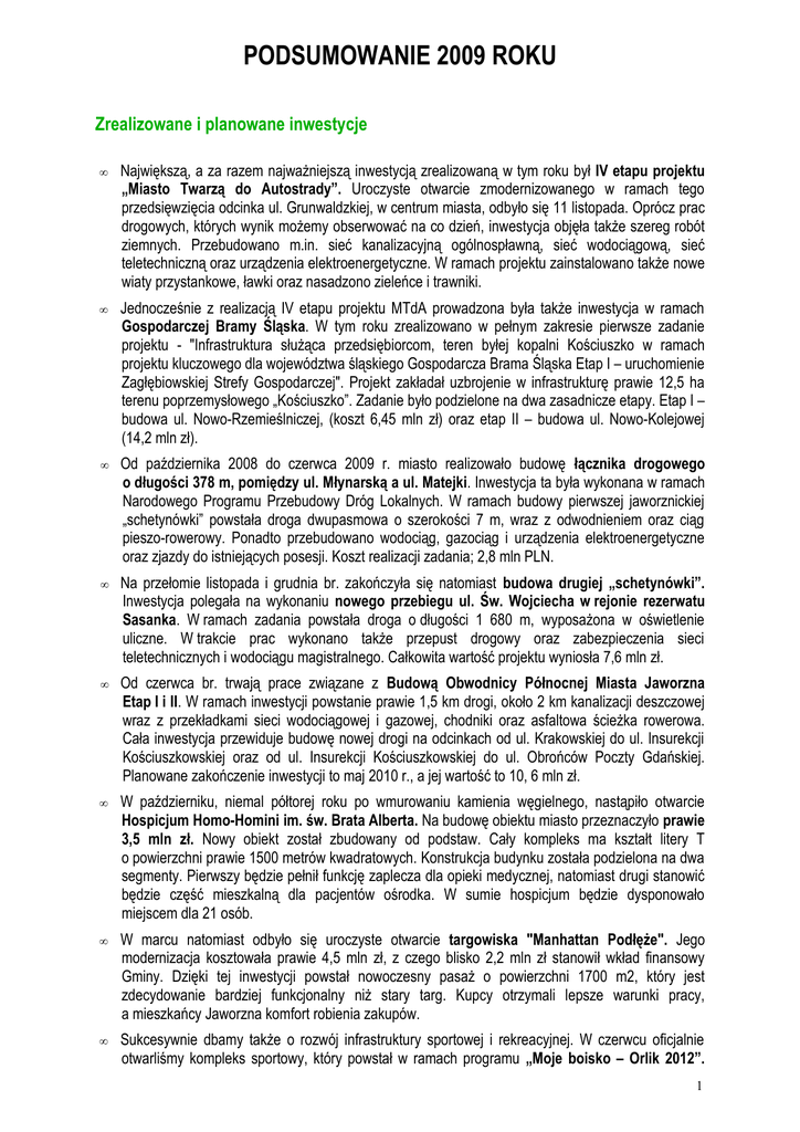 PODSUMOWANIE 2009 ROKU Zrealizowane i planowane inwestycje • Największą, a za razem najważniejszą inwestycją zrealizowaną w tym roku był IV etapu projektu „Miasto Twarzą do Autostrady”. Uroczyste otwarcie zmodernizowanego w ramach tego przedsięwzięcia odcinka ul. Grunwaldzkiej, w centrum miasta, odbyło się 11 listopada. Oprócz prac drogowych, których wynik możemy obserwować na co dzień, inwestycja objęła także szereg robót ziemnych. Przebudowano m.in. sieć kanalizacyjną ogólnospławną, sieć wodociągową, sieć teletechniczną oraz urządzenia elektroenergetyczne. W ramach projektu zainstalowano także nowe wiaty przystankowe, ławki oraz nasadzono zieleńce i trawniki. • Jednocześnie z realizacją IV etapu projektu MTdA prowadzona była także inwestycja w ramach Gospodarczej Bramy Śląska. W tym roku zrealizowano w pełnym zakresie pierwsze zadanie projektu - "Infrastruktura służąca przedsiębiorcom, teren byłej kopalni Kościuszko w ramach projektu kluczowego dla województwa śląskiego Gospodarcza Brama Śląska Etap I – uruchomienie Zagłębiowskiej Strefy Gospodarczej". Projekt zakładał uzbrojenie w infrastrukturę prawie 12,5 ha terenu poprzemysłowego „Kościuszko”. Zadanie było podzielone na dwa zasadnicze etapy. Etap I – budowa ul. Nowo-Rzemieślniczej, (koszt 6,45 mln zł) oraz etap II – budowa ul. Nowo-Kolejowej (14,2 mln zł). • Od października 2008 do czerwca 2009 r. miasto realizowało budowę łącznika drogowego o długości 378 m, pomiędzy ul. Młynarską a ul. Matejki. Inwestycja ta była wykonana w ramach Narodowego Programu Przebudowy Dróg Lokalnych. W ramach budowy pierwszej jaworznickiej „schetynówki” powstała droga dwupasmowa o szerokości 7 m, wraz z odwodnieniem oraz ciąg pieszo-rowerowy. Ponadto przebudowano wodociąg, gazociąg i urządzenia elektroenergetyczne oraz zjazdy do istniejących posesji. Koszt realizacji zadania; 2,8 mln PLN. • Na przełomie listopada i grudnia br. zakończyła się natomiast budowa drugiej „schetynówki”. Inwestycja polegała na wykonaniu nowego przebiegu ul. Św. Wojciecha w rejonie rezerwatu Sasanka. W ramach zadania powstała droga o długości 1 680 m, wyposażona w oświetlenie uliczne. W trakcie prac wykonano także przepust drogowy oraz zabezpieczenia sieci teletechnicznych i wodociągu magistralnego. Całkowita wartość projektu wyniosła 7,6 mln zł. • Od czerwca br. trwają prace związane z Budową Obwodnicy Północnej Miasta Jaworzna Etap I i II. W ramach inwestycji powstanie prawie 1,5 km drogi, około 2 km kanalizacji deszczowej wraz z przekładkami sieci wodociągowej i gazowej, chodniki oraz asfaltowa ścieżka rowerowa. Cała inwestycja przewiduje budowę nowej drogi na odcinkach od ul. Krakowskiej do ul. Insurekcji Kościuszkowskiej oraz od ul. Insurekcji Kościuszkowskiej do ul. Obrońców Poczty Gdańskiej. Planowane zakończenie inwestycji to maj 2010 r., a jej wartość to 10, 6 mln zł. • W październiku, niemal półtorej roku po wmurowaniu kamienia węgielnego, nastąpiło otwarcie Hospicjum Homo-Homini im. św. Brata Alberta. Na budowę obiektu miasto przeznaczyło prawie 3,5 mln zł. Nowy obiekt został zbudowany od podstaw. Cały kompleks ma kształt litery T o powierzchni prawie 1500 metrów kwadratowych. Konstrukcja budynku została podzielona na dwa segmenty. Pierwszy będzie pełnił funkcję zaplecza dla opieki medycznej, natomiast drugi stanowić będzie część mieszkalną dla pacjentów ośrodka. W sumie hospicjum będzie dysponowało miejscem dla 21 osób. • W marcu natomiast odbyło się uroczyste otwarcie targowiska "Manhattan Podłęże". Jego modernizacja kosztowała prawie 4,5 mln zł, z czego blisko 2,2 mln zł stanowił wkład finansowy Gminy. Dzięki tej inwestycji powstał nowoczesny pasaż o powierzchni 1700 m2, który jest zdecydowanie bardziej funkcjonalny niż stary targ. Kupcy otrzymali lepsze warunki pracy, a mieszkańcy Jaworzna komfort robienia zakupów. • Sukcesywnie dbamy także o rozwój infrastruktury sportowej i rekreacyjnej. W czerwcu oficjalnie otwarliśmy kompleks sportowy, który powstał w ramach programu „Moje boisko – Orlik 2012”. 1 W ramach inwestycji, przy Gimnazjum nr 11 w Pieczyskach, powstały dwa boiska - piłkarskie oraz wielofunkcyjne – do siatkówki, koszykówki, piłki ręcznej i tenisa ziemnego. Zgodnie z wytycznymi projektu zbudowany został również obiekt sanitarno-szatniowy. Obiekt jest ogólnodostępny a korzystanie z niego bezpłatne. Na terenie Orlika zatrudniony jest trener środowiskowy, który będzie czuwał nad bezpieczeństwem osób korzystających z boisk. Z inicjatywy miasta, w sąsiedztwie kompleksu sportowego, powstał także plac zabaw. • Oprócz Orlika w Jaworznie powstały także cztery inne obiekty sportowe. Wielofunkcyjne boiska ze sztuczna nawierzchnią zostały wybudowane w okolicy szkół. Przy Szkole Podstawowej Nr 14 powstało boisko do piłki ręcznej, koszykówki i siatkówki. Na terenie Zespołu Szkół Ponadgimnazjalnych Nr 4 wykonano boisko sportowe wielofunkcyjne - do piłki nożnej, ręcznej, koszykówki oraz siatkówki. Przy Gimnazjum Miejskim Nr 6 powstało boisko wielofunkcyjne (koszykówka i siatkówka), boisko do siatkówki, bieżnia do skoku w dal oraz stół do tenisa stołowego. W Zespole Szkół Nr 1 wykonano natomiast dwa boiska wielofunkcyjne, bieżnię lekkoatletyczną prostą – 60m oraz skocznię do skoku w dal i trójskoku z rozbiegiem. Ponadto przy wszystkich boiskach zainstalowano piłkochwyty i ławeczki, a na Osiedlu Stałym i na Borach powstało dodatkowo oświetlenie. Na budowę boisk wydaliśmy w tym roku ponad 2,7 mln zł. • Nie zapomnieliśmy także o najmłodszych. Obok wspomnianego już placu zabaw przy Orliku powstały także 4 inne. Nowe urządzenia, w tym huśtawki, karuzele a nawet mini twierdza pojawiły się w Szczakowej przy Specjalnym Ośrodku Szkolno-Wychowawczym, w parku na Górze Piasku oraz