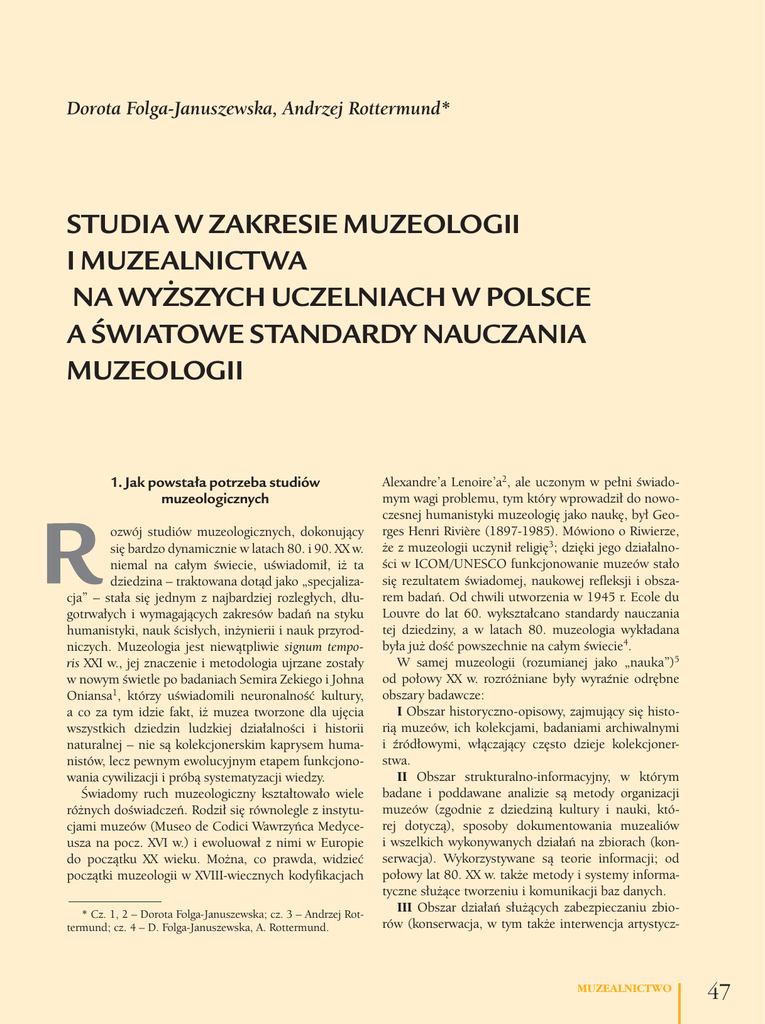 Dorota Folga-Januszewska, Andrzej Rottermund* STUDIA W ZAKRESIE MUZEOLOGII I MUZEALNICTWA NA WYŻSZYCH UCZELNIACH W POLSCE A ŚWIATOWE STANDARDY NAUCZANIA MUZEOLOGII 1. Jak powstała potrzeba studiów muzeologicznych ozwój studiów muzeologicznych, dokonujący się bardzo dynamicznie w latach 80. i 90. XX w. niemal na całym świecie, uświadomił, iż ta dziedzina – traktowana dotąd jako „specjalizacja” – stała się jednym z najbardziej rozległych, długotrwałych i wymagających zakresów badań na styku humanistyki, nauk ścisłych, inżynierii i nauk przyrodniczych. Muzeologia jest niewątpliwie signum temporis XXI w., jej znaczenie i metodologia ujrzane zostały w nowym świetle po badaniach Semira Zekiego i Johna Oniansa1, którzy uświadomili neuronalność kultury, a co za tym idzie fakt, iż muzea tworzone dla ujęcia wszystkich dziedzin ludzkiej działalności i historii naturalnej – nie są kolekcjonerskim kaprysem humanistów, lecz pewnym ewolucyjnym etapem funkcjonowania cywilizacji i próbą systematyzacji wiedzy. Świadomy ruch muzeologiczny kształtowało wiele różnych doświadczeń. Rodził się równolegle z instytucjami muzeów (Museo de Codici Wawrzyńca Medyceusza na pocz. XVI w.) i ewoluował z nimi w Europie do początku XX wieku. Można, co prawda, widzieć początki muzeologii w XVIII-wiecznych kodyfikacjach * Cz. 1, 2 – Dorota Folga-Januszewska; cz. 3 – Andrzej Rottermund; cz. 4 – D. Folga-Januszewska, A. Rottermund. Alexandre’a Lenoire’a2, ale uczonym w pełni świadomym wagi problemu, tym który wprowadził do nowoczesnej humanistyki muzeologię jako naukę, był Georges Henri Rivière (1897-1985). Mówiono o Riwierze, że z muzeologii uczynił religię3; dzięki jego działalności w ICOM/UNESCO funkcjonowanie muzeów stało się rezultatem świadomej, naukowej refleksji i obszarem badań. Od chwili utworzenia w 1945 r. Ecole du Louvre do lat 60. wykształcano standardy nauczania tej dziedziny, a w latach 80. muzeologia wykładana była już dość powszechnie na całym świecie4. W samej muzeologii (rozumianej jako „nauka”)5 od połowy XX w. rozróżniane były wyraźnie odrębne obszary badawcze: I Obszar historyczno-opisowy, zajmujący się historią muzeów, ich kolekcjami, badaniami archiwalnymi i źródłowymi, włączający często dzieje kolekcjonerstwa. II Obszar strukturalno-informacyjny, w którym badane i poddawane analizie są metody organizacji muzeów (zgodnie z dziedziną kultury i nauki, której dotyczą), sposoby dokumentowania muzealiów i wszelkich wykonywanych działań na zbiorach (konserwacja). Wykorzystywane są teorie informacji; od połowy lat 80. XX w. także metody i systemy informatyczne służące tworzeniu i komunikacji baz danych. III Obszar działań służących zabezpieczaniu zbiorów (konserwacja, w tym także interwencja artystycz- MUZEALNICTWO 47 na), tworzeniu właściwych warunków ich przechowywania i eksponowania (nauka o środowisku, chemia, biologia), nadzoru nad bezpieczeństwem zbiorów. IV Obszar prawno-ekonomiczny, w którym muzea traktowane są jako wydzielone „strefy” kulturowonaukowe, wymagające zewnętrznych regulacji prawa, współpracy w zakresie prawa międzynarodowego, kształtowania „ekonomii muzeów” łączącej zadania misyjne i marketingowe, związków między strategiami publicznymi i prywatnymi. Obszar ten reguluje także system kodeksowy odwołujący się do zasad etycznych stojących ponad prawem lokalnym (Kodeks Etyki ICOM). V Obszar badania rozwoju edukacji i działań społecznych, w tym także funkcji terapeutycznych i resocjalizacyjnych, jakie od lat 90. XX w. coraz częściej stanowią istotny zakres działalności muzeów. Studia socjologiczne w tej dziedzinie mają bardzo szeroki charakter i dotyczą nie tylko badań nad stykiem kultur, znaczeniem muzeów dla negocjacji interkulturowych i internaukowych, ale także badań nad rolą tych instytucji w przemysłach kulturowych, turystyce, rozwoju regionalnym. VI Obszar badań nad tworzeniem modeli przestrzenno-czasowych, w tym scenografii, architektury i urbanistyki muzealnej i kształtowania pejzażu (w wypadku rozległych terenów obejmowanych przez skanseny, parki narodowe itp.), tworzenia nowych kontekstów municypalnych (muzea – fragmenty miast), zaś w mniejszej skali badania nad sposobem prezentacji zbiorów (wystawy stałe i czasowe), oddziaływaniem „przestrzeni” ekspozycyjnej na odbiór i edukację. Obszar ten zwany bywa często – muzeografią. Świadomość rozległości badań muzeologicznych w tych sześciu obszarach uzmysławia, jak wiele tradycyjnych gałęzi nauki musi zostać zjednoczonych w dziedzinie muzeologii, poczynając od historii, historii kultury (w tym sztuki i muzyki), przez nauki społeczne, ekonomię, prawo, aż po teorie informacji, metodologię nauk ścisłych, architekturę, urbanistykę oraz dyscypliny artystyczne o dużej dowolności sposobów działania i wykorzystania mediów. Nie było więc łatwo określić standardy nauczania muzeologii, ulegające w ciągu ostatniego ćwierćwiecza systematycznym zmianom i przekształceniom. W różnych uczelniach w Europie, Ameryce Północnej, Azji, Australii istnieją odmienne tradycje „wykładu muzeologicznego”, zazwyczaj dopasowane do tradycji szkolnictwa wyższego i potrzeb kulturowych danego regionu. Jednak nawet przy tak dużym zróżnicowaniu można obecnie wskazać owo minimum, którego adept tej dyscypliny powinien przynajmniej „dotknąć” w czasie studiów różnego stopnia. 48 MUZEALNICTWO Studia muzeologiczne (od magisterskich, podyplomowych, doktoranckich po tzw. „podoktorskie”) organizowane są najczęściej na świecie przez interdyscyplinarne centra, instytuty lub ośrodki organizowane na uniwersytetach (np. The Centre of Museology, University of Manchester, Wielka Brytania), oferujące po kolei wszystkie poziomy studiowania od MA (odpowiednik magisterium) po PhD (odpowiednik doktoratu) i ha
