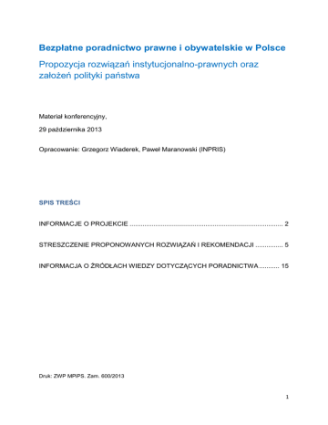 Bezpłatne poradnictwo prawne i obywatelskie w Polsce Propozycja rozwiązań instytucjonalno-prawnych oraz założeń polityki państwa Materiał konferencyjny, 29 października 2013 Opracowanie: Grzegorz Wiaderek, Paweł Maranowski (INPRIS) SPIS TREŚCI INFORMACJE O PROJEKCIE ................................................................................... 2 STRESZCZENIE PROPONOWANYCH ROZWIĄZAŃ I REKOMENDACJI ............... 5 INFORMACJA O ŹRÓDŁACH WIEDZY DOTYCZĄCYCH PORADNICTWA ........... 15 Druk: ZWP MPiPS. Zam. 600/2013 1 INFORMACJE O PROJEKCIE Projekt systemowy „Opracowanie kompleksowych i trwałych mechanizmów wsparcia dla poradnictwa prawnego i obywatelskiego w Polsce” jest realizowany od grudnia 2011 r. Liderem projektu jest Departament Pożytku Publicznego Ministerstwa Pracy i Polityki Społecznej, a partnerami: Fundacja Uniwersyteckich Poradni Prawnych, INPRIS - Instytut Prawa i Społeczeństwa, Instytut Spraw Publicznych oraz Związek Biur Porad Obywatelskich. Celem projektu jest wypracowanie i upowszechnienie rozwiązań modelowych oraz kierunków i zasad polityki państwa w zakresie wzmacniania i rozwoju poradnictwa prawnego i obywatelskiego w Polsce. Poradnictwo prawne i obywatelskie rozwija się w Polsce w sposób rozproszony od kilkunastu lat przede wszystkim w oparciu o aktywność organizacji pozarządowych i niektórych instytucji publicznych. Poradnictwo umożliwia obywatelom rozwiązywanie ich problemów życiowych oraz ułatwia powrót do aktywnego życia społecznego i zawodowego. Poradnictwo przyczynia się także do lepszego wykorzystywania przez obywateli możliwości oferowanych przez państwo, ułatwia dostęp obywateli do usług publicznych oraz wpływa na podniesienie jakości tych usług. Jest to również jedna z najskuteczniejszych form edukacji prawnej i obywatelskiej. Wagę poradnictwa dla budowy kapitału społecznego pokazują przykłady krajów takich jak Holandia czy Anglia, w których zbudowane zostały powszechne systemy poradnictwa prawnego i obywatelskiego. Działania projektowe zostały podzielone na trzy etapy: (1) część badawcza, (2) przygotowanie rozwiązań modelowych i propozycji dotyczących polityki państwa, (3) upowszechnianie wypracowanych efektów i rekomendacji. W pierwszym okresie realizacji projektu przeprowadzone zostały badania empiryczne (odpowiedzialny Instytut Spraw Publicznych) oraz pogłębiona analiza dostępnych danych, literatury i badań dotyczących poradnictwa (odpowiedzialny INPRIS). Celem badań empirycznych była ocena obecnego stanu poradnictwa prawnego i obywatelskiego w Polsce. 2 Badania empiryczne składały się z trzech uzupełniających się modułów: (1) badanie świadczeniodawców usług poradniczych, (2) badanie świadczeniobiorców i potencjalnych świadczeniobiorców usług poradniczych, (3) badanie otoczenia instytucjonalnego poradnictwa. Wyniki badań empirycznych zostały opracowane w postaci raportów cząstkowych oraz raportu końcowego. Badanie danych zastanych pozwoliło na zebranie wiedzy m.in.: o wnioskach wynikających z krajowych i zagranicznych badań i literatury dotyczących poradnictwa, standardach, próbach ustawowego uregulowania kwestii poradnictwa, możliwościach wykorzystania nowych technologii. Dokonano też analiz ekonomicznych zjawiska poradnictwa. Wszystkie raporty, analizy i opracowania dostępne są na stronach internetowych partnerów oraz stronie internetowej projektu (www.ppio.eu). Na drugim etapie projektu grupa robocza składająca się z ekspertów delegowanych przez wszystkich partnerów wypracowała propozycje modelowych rozwiązań oraz rekomendacje co do polityki państwa (za organizację prac grupy odpowiadał INPRIS). Propozycje wypracowane przez grupę zostały szeroko skonsultowane ze różnymi zainteresowanymi środowiskami (organizacje pozarządowe, środowisko prawnicze, samorząd lokalny, instytucje publiczne, uczelnie wyższe). Adresatami dokumentu są instytucje rządowe i samorządowe oraz instytucje poradnicze. W pracach nad rozwiązaniami modelowymi obecni byli też eksperci zagraniczni, mający doświadczenie we wdrażaniu i reformowaniu systemów poradnictwa w wielu krajach. Ostatnim etapem projektu są działania upowszechniające i promujące wypracowane rozwiązania i rekomendacje. Odpowiedzialne za nie są: Fundacja Uniwersyteckich Poradni Prawnych, Związek Biur Porad Obywatelskich oraz Departament Pożytku Publicznego. Działania upowszechniające obejmują m.in.: 3 informowanie o efektach projektu w mediach i Internecie, opracowanie poradnika dla organizacji i instytucji, które mają stosować modelowe rozwiązania w zakresie poradnictwa oraz podręcznika trenerskiego dotyczącego metodologii poradnictwa i szkoleń, organizację dwudziestu jeden seminariów szkoleniowych poświęconych upowszechnianiu wypracowanego modelu dla organizacji trzeciego sektora i innych instytucji udzielających porad, lokalnych liderów, wymiaru sprawiedliwości oraz środowisk prawniczych, organizację pięciu szkoleń dla urzędników samorządu terytorialnego dotyczących modelu poradnictwa, spotkania i prezentacje dla m.in. kierownictw instytucji publicznych, związków miast, gmin i powiatów, stowarzyszeń zawodowych, wydziałów prawa. 4 STRESZCZENIE PROPONOWANYCH ROZWIĄZAŃ I REKOMENDACJI Grupa robocza pracująca nad przygotowaniem modelu i wypracowaniem rekomendacji przyjęła, iż odpowiedzialność za stworzenie systemu spoczywa na państwie oraz na samorządzie terytorialnym, z tym że system powinien być budowany w oparciu o już istniejącą infrastrukturę, zaplecze i dorobek instytucji poradniczych. System powinien zapewniać równość dostępu do porad uprawnionym osobom przy zachowaniu odpowiednich standardów i jakości świadczonych porad. W ramach prowadzonych analiz grupa robocza opierała się na następujących kryteriach: użyteczność społeczna, skuteczność świadczonej pomocy, jakość poradnictwa, efektywność n