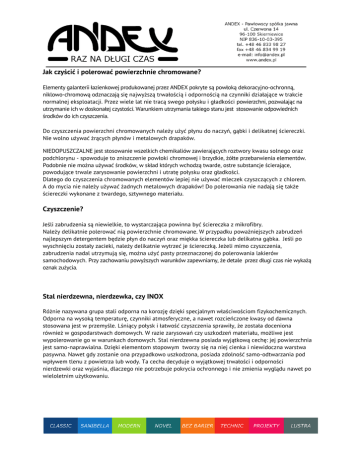 Jak czyścić i polerować powierzchnie chromowane? Elementy galanterii łazienkowej produkowanej przez ANDEX pokryte są powłoką dekoracyjno-ochronną, niklowo-chromową odznaczają się najwyższą trwałością i odpornością na czynniki działające w trakcie normalnej eksploatacji. Przez wiele lat nie tracą swego połysku i gładkości powierzchni, pozwalając na utrzymanie ich w doskonałej czystości. Warunkiem utrzymania takiego stanu jest stosowanie odpowiednich środków do ich czyszczenia. Do czyszczenia powierzchni chromowanych należy użyć płynu do naczyń, gąbki i delikatnej ściereczki. Nie wolno używać żrących płynów i metalowych drapaków. NIEDOPUSZCZALNE jest stosowanie wszelkich chemikaliów zawierających roztwory kwasu solnego oraz podchlorynu - spowoduje to zniszczenie powłoki chromowej i brzydkie, żółte przebarwienia elementów. Podobnie nie można używać środków, w skład których wchodzą twarde, ostre substancje ścierające, powodujące trwale zarysowanie powierzchni i utratę połysku oraz gładkości. Dlatego do czyszczenia chromowanych elementów lepiej nie używać mleczek czyszczących z chlorem. A do mycia nie należy używać żadnych metalowych drapaków! Do polerowania nie nadają się także ściereczki wykonane z twardego, sztywnego materiału. Czyszczenie? Jeśli zabrudzenia są niewielkie, to wystarczająca powinna być ściereczka z mikrofibry. Należy delikatnie polerować nią powierzchnie chromowane. W przypadku poważniejszych zabrudzeń najlepszym detergentem będzie płyn do naczyń oraz miękka ściereczka lub delikatna gąbka. Jeśli po wyschnięciu zostały zacieki, należy delikatnie wytrzeć je ściereczką. Jeżeli mimo czyszczenia, zabrudzenia nadal utrzymują się, można użyć pasty przeznaczonej do polerowania lakierów samochodowych. Przy zachowaniu powyższych warunków zapewniamy, że detale przez długi czas nie wykażą oznak zużycia. Stal nierdzewna, nierdzewka, czy INOX Różnie nazywana grupa stali odporna na korozję dzięki specjalnym właściwościom fizykochemicznych. Odporna na wysoką temperaturę, czynniki atmosferyczne, a nawet rozcieńczone kwasy od dawna stosowana jest w przemyśle. Lśniący połysk i łatwość czyszczenia sprawiły, że została doceniona również w gospodarstwach domowych. W razie zarysowań czy uszkodzeń materiału, możliwe jest wypolerowanie go w warunkach domowych. Stal nierdzewna posiada wyjątkową cechę: jej powierzchnia jest samo-naprawialna. Dzięki elementom stopowym tworzy się na niej cienka i niewidoczna warstwa pasywna. Nawet gdy zostanie ona przypadkowo uszkodzona, posiada zdolność samo-odtwarzania pod wpływem tlenu z powietrza lub wody. Ta cecha decyduje o wyjątkowej trwałości i odporności nierdzewki oraz wyjaśnia, dlaczego nie potrzebuje pokrycia ochronnego i nie zmienia wyglądu nawet po wieloletnim użytkowaniu. Czyszczenie Stal nierdzewna jest łatwa w czyszczeniu. Wystarczy miękka ściereczka lub gąbka zwilżona wodą z mydłem, albo użycie lekko wilgotnej szmatki z mikrofazy. W sprzedaży występuje szereg środków przeznaczonych do czyszczenia stali nierdzewnej. Należy je stosować zgodnie z instrukcją, przestrzegać zalecanego stężenia, czasu i temperatury działania. Podczas spłukiwania z powierzchni zadbać, aby nie pozostały osady lub środek nie zalegał w szczelinach. Powierzchnie „lustrzane”(stal wypolerowana) najlepiej czyścić zwykłymi środkami do mycia szyb (bez dodatków chlorków). Należy unikać środków szorstkich i trących, które mogą spowodować zarysowania. Powierzchnie „szlifowane” wycierać wzdłuż kierunku szlifu, nigdy w poprzek. Jakim sposobem można usunąć osady kamienia? Jeśli próba usunięcia za pomocą zwykłych środków do czyszczenia nie wystarczy, należy poddać je działaniu 25% roztworu octu i pozostawić aby się rozpuściły. Następnie spłukać wodą i wytrzeć do sucha. Alternatywnie, aby uniknąć zapachu octu można zastosować kwas cytrynowy. Jak usunąć pozostałości klejów? W zależności od rodzajów klejów ich pozostałości można usunąć za pomocą wody, rozpuszczalników na bazie alkoholu lub acetonu, które nie spowodują korozji stali nierdzewnej. Do czego służą ochronne pasty i płyny do metali? Większość płynnych środków czyszczących do powierzchni metalowych zawiera olej silikonowy, ułatwiający to czyszczenie. Ich efekt jest trwały od kilku dni (w miejscach wystawionych na działanie czynników atmosferycznych) do kilku tygodni. Olej silikonowy można całkowicie zmyć wodą z dodatkiem płynu do mycia naczyń lub mydła . Pasty do polerowania tworzą mikroskopijną, ale bardzo odporną woskową warstwę, która sprawia, że powierzchnie metalowe stają się szczególnie łatwe w czyszczeniu. Taka woskowa warstwa ochronna jest odporna na działanie detergentów i może utrzymywać się nawet przez kilka miesięcy. Usuwa się je środkami na bazie alkoholu. Wymienione wyżej sposoby zabezpieczenia stosuje się do powierzchni dekoracyjnych – nigdy do wyrobów stalowych mających kontakt z żywnością. Metody których się nie zaleca do czyszczenia stali nierdzewnej. Środki dezynfekujące zawierające wybielacze (podchloryn sodowy) mogą zaszkodzić powierzchni stali nierdzewnej , jeśli są w zbyt dużym stężeniu, pozostają w zbyt długim kontakcie z powierzchnią stalową lub nie zostały należycie z niej spłukane. Sól lub inne środki czyszczące zawierające chlorki mogą również spowodować uszkodzenia. Jeśli już je używamy , należy zawsze je wcześniej rozpuścić i ograniczyć czas ich oddziaływania do minimum, po czym obficie spłukać powierzchnię czystą wodą. Proszki lub inne środki o właściwościach trących będą pozostawiać rysy . Zmywaki z wełny metalowej wykonane ze „zwykłej” stali nie nadają się do czyszczenia stali nierdzewnej, ponieważ mogą uszkodzić materiał na dwa sposoby. Z jednej s