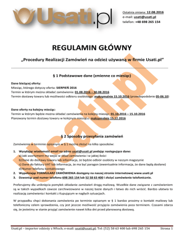 Ostatnia zmiana: 12.08.2016 e-mail: [email protected] telefon: +48 698 265 154 REGULAMIN GŁÓWNY „Procedury Realizacji Zamówień na odzież używaną w firmie Usati.pl” ------------------------------------------------------------------------------------------------------------------------------------------------------- § 1 Podstawowe dane (zmienne co miesiąc) Dane bieżącej oferty: Miesiąc, którego dotyczy oferta: SIERPIEŃ 2016 Termin w którym można składać zamówienia: 01.08.2016 – 30.08.2016 Termin dostawy towaru lub możliwości odbioru osobistego: maksymalnie 15.10.2016 (prawdopodobnie 05-06.10) Dane oferty na kolejny miesiąc: Termin w którym będzie można składać zamówienia na kolejny miesiąc: 01.10.2016 – 15.10.2016 Planowany termin dostawy towaru w kolejnym miesiącu: maksymalnie 15.12.2016 § 2 Sposoby przesyłania zamówień Zamówienie w terminie opisanym w § 1 można złożyć na kilka sposobów: 1. Wysyłając wiadomość email na adres [email protected] podając następujące dane: a) Jaki asortyment ma wejść w skład zamówienia i w jakiej ilości b) Dane do dostawy towaru lub informacja, że będzie odbiór osobisty w naszym magazynie c) Dane do faktury VAT lub informacja, że ma być paragon (ewentualnie informacja, że dane będą dosłane) d) Numer telefonu kontaktowego 2. Wypełniając FORMULARZ ZAMÓWIENIA dostępny na naszej stronie internetowej www.usati.pl 3. Dzwoniąc pod numer telefonu 698 265 154 lub 52 58 63 400 i złożyć zamówienie telefonicznie. Preferujemy dla uniknięcia pomyłek składanie zamówień drogą mailową. Wszelkie dane związane z zamówieniem są w takich wypadkach zawsze zarchiwizowane w naszej bazie danych i łatwo do nich wrócić. Bardzo ułatwia to realizację zamówienia i kontakt z Kupującym w nagłych sytuacjach. W przypadku chęci dokonania zamówienia po terminie opisanym w § 1 bardzo prosimy o kontakt mailowy lub telefoniczny celem sprawdzenia, czy jest jeszcze możliwość przyjęcia zamówienia poza terminem. Czasami zdarza się, że jesteśmy w stanie przyjąć zamówienie nawet kilka dni przed planowaną dostawą. Usati.pl – importer odzieży z Włoch; e-mail: [email protected]; Tel: (52) 58 63 400 lub 698 265 154 Strona 1 § 3 Procedura przyjęcia zamówienia od Kupującego 1. Kupujący ustala ze Sprzedawcą asortyment, który ma wejść w skład jego zamówienia. UWAGA! Sprzedający nie jest w stanie określić ostatecznej wagi zamówienia przy jego składaniu (dotyczy odzieży sortowanej), gdyż poszczególne asortymenty pakowane są w worki o różnych wagach. Podczas składania zamówienia przyjmujemy wstępnie najbardziej prawdopodobną wagę na podstawie § 12 gdzie opisaliśmy jak kształtują się ilości kilogramów w poszczególnych pozycjach asortymentowych. Ewentualne różnice (na plus lub na minus od pierwotnych założeń na fakturze proforma Klient powinien z góry uwzględnić). Przeważnie jest tak, że ilości ostateczne są zbliżone do pierwotnych założeń na fakturze proforma. 2. Kupujący przesyła swoje zamówienia jedną z preferowanych opcji opisanych w § 2. 3. Sprzedawca przesyła w ciągu 24h Kupującemu fakturę proforma drogą mailową (w formacie PDF), która uwzględnia wcześniejsze ustalenia co do asortymentu jaki ma wejść w skład realizowanego zamówienia. 4. Kupujący po otrzymaniu faktury proforma powinien sprawdzić jej zgodność ze wcześniejszymi ustaleniami. 5. Kupujący ma możliwość na tym etapie wprowadzić dowolne modyfikacje (zmniejszenie lub zwiększenie ilości zamawianego towaru itp.), które powinien przesłać do sprzedawcy w ciągu 24h. 6. Po ustaleniu ostatecznego kształtu zamówienia (lub zaakceptowaniu przez Kupującego pierwotnej wersji faktury proforma) Kupujący w ciągu 2 dni winien dokonać wpłaty zaliczki zgodnie z fakturą proforma, jednak nie później niż do ostatniego dnia w którym przyjmowane są zamówienia. 7. W przypadku nie otrzymania od Kupującego potwierdzenia dokonania wpłaty lub w przypadku braku kontaktu ze strony Kupującego, po otrzymaniu faktury proforma Sprzedawca po 2 dniach kontaktuje się z Kupującym próbując ustalić, czy zamówienie ma być dalej realizowane, czy anulowane. Brak kontaktu z Kupującym powoduje automatyczne anulowanie zamówienia. 8. Zamówienie zostaje ostatecznie przyjęte do realizacji w momencie wpłynięcia zaliczki na konto Sprzedawcy. 9. W momencie otrzymania wpłaty zaliczki Sprzedawca automatycznie przyjmuje zamówienie do realizacji. Sprzedawca kontaktuje się z Kupującym tylko w przypadku, gdyby zaliczka nie została zaksięgowana na jego rachunku bankowym. § 4 Sposoby płatności 1. Podstawowy sposób płatności (SORT i NIESORT): wpłata 30% zaliczki na podstawie faktury proforma przy składaniu zamówienia i płatność pozostałej kwoty przy odbiorze towaru naszemu kierowcy lub podczas odbioru osobistego. 2. Możliwy dodatkowy sposób płatności (NIESORT z dostawą firmą zewnętrzną): wpłata zaliczki 30% na podstawie faktury pro forma i dopłata pozostałej kwoty przelewem przed wysłaniem towaru do Klienta zewnętrzną firmą transportową (powoduje to ograniczenie kosztów transportu zgodnie z § 8). 3. Możliwy dodatkowy sposób płatności (SORT): wpłata 100% kwoty z góry na podstawie faktury proforma podczas składania zamówienia. Skorzystanie z tej opcji automatycznie obniża kwotę do zapłaty za towar przez Kupującego o 2% (liczone od wartości wystawionej faktury pro-forma). Każde zamówienie, które jest opłacone z góry honorowane jest 2% rabatem od całkowitej wartości. 4. Opcja dodatkowa – dla stałych Klientów (którzy dokonali co najmniej kilku pełnych zamówień) istnieje możliwość zmniejszenia kwoty wpłacanej zaliczki do 10%. 5. Opcja dodatkowa – dla stałych Klientów (którzy dokonali co najmniej kilkunastu pełnych zamówień) istnieje możliwość wystawienia faktury VAT z odroczonym 20-dniowym terminem płatności. Op