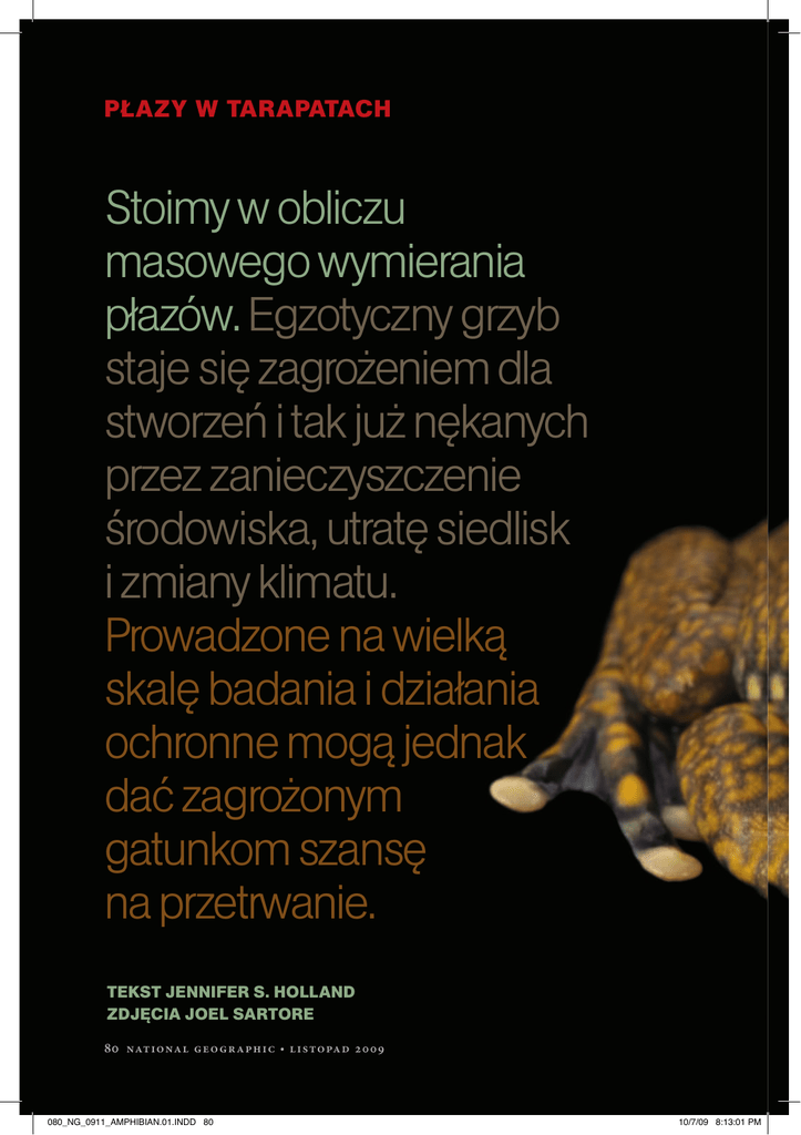 pŁAZy w tARApAtAcH Stoimy w obliczu masowego wymierania płazów. Egzotyczny grzyb staje się zagrożeniem dla stworzeń i tak już nękanych przez zanieczyszczenie środowiska, utratę siedlisk i zmiany klimatu. Prowadzone na wielką skalę badania i działania ochronne mogą jednak dać zagrożonym gatunkom szansę na przetrwanie. tekst JeNNIFeR s. HOLLAND ZDJęcIA JOeL sARtORe 80 nat ional ge o graphic 080_NG_0911_AMPHIBIAN.01.INDD 80 • listopad 2009 10/7/09 8:13:01 PM Hyloscirtus Pantostictus Ekwadorski Papieski Uniwersytet Katolicki długość do 64,1 mm • AmerykA PołudniowA • gAtunek zAgrożony wymArciem 080_NG_0911_AMPHIBIAN.01.INDD 81 10/7/09 8:13:11 PM Z dala od cywilizacji w kalifornijskich górach Sierra Nevada masowo giną żaby z gatunku Rana muscosa. Winowajcą jest grzyb powodujący chytridiomikozę, który pojawił się tu w 2004 r. 82 nat ional ge o graphic 080_NG_0911_AMPHIBIAN.01.INDD 82 • April 2009 10/7/09 8:13:24 PM A mphi bia n l oss 83 080_NG_0911_AMPHIBIAN.01.INDD 83 10/7/09 8:13:31 PM S amiec mocno ściska partnerkę przednimi łapami. Samica leży pod nim w płytkim strumyku, rozpłaszczona, z pełnym skrzeku brzuchem. To rzadkie ropuchy z rodzaju Atelopus. Gatunek nie ma jeszcze nawet nazwy. Występuje na niewielkim obszarze między szczytami Andów a przylegającymi do nich nizinami dorzecza Amazonki. Samica wygląda jak świeżo malowana: na grzbiecie czarny deseń na żółtym tle, brzuch w kolorze krzyczącej czerwieni. Niestety, jest martwa. U góry, nad krawędzią wąwozu, dudni spychacz. W pobliżu miasteczka Limón w południowo-wschodnim Ekwadorze trwa budowa drogi. Zepchnięta ze zbocza przez buldożer lawina kamieni, ziemi, gałęzi i gruzu zatarasowała płynący lasem strumień. Luis Coloma, 47-letni herpetolog, chodzi po chybotliwych kamieniach i ocenia rozmiar szkód. Zaabsorbowany, nawet nie podwinął nogawek jasnych spodni, które teraz są do kolan utytłane w błocie. Żaby, ropuchy, salamandry, traszki i mało znane płazy beznogie – wszystkie należą do gromady Amphibia: zmiennocieplnych, pełzających, skaczących i ryjących w ziemi stworzeń znanych z baśni, biblijnych plag, przysłów i opowieści o wiedźmach. W średniowiecznej Europie żaby uważano za wcielenie zła. U starożytnych Egipcjan symbolizowały życie i płodność. Dla dzieci od wieków stanowią śliskie wprowadzenie do świata przyrody. Natomiast dla naukowców płazy są gromadą, która przez ponad 300 mln lat wyewoluowała w ponad 6 tys. gatunków. AnAxyrus (Bufo) BoreAs Cheyenne Mountain Zoo, Wyoming, USA długoŚĆ do 125 mm • zachodnie rejony uSa • liczebnoŚĆ gatunku Spada 080_NG_0911_AMPHIBIAN.01.INDD 84 Płazy należą do zwierząt najbardziej dotkniętych współczesnymi niesprzyjającymi przyrodzie zmianami. Ponad połowa gatunków tej gromady jest zagrożona wyginięciem. Setki zmierzają ku zagładzie, dziesiątki już zniknęły. Wymieranie jest szybkie i powszechne. Ma złożone przyczyny – spychacz w jarze koło Limón to tylko jedno z niebezpieczeństw. Pojawił się jednak promyk nadziei. Podejmowane obecnie wysiłki pozwolą ochronić część zwierząt przed zabójczą falą wymierania. Poza tym naukowcom (przynajmniej w warunkach laboratoryjnych) udaje się już leczyć grzybicę, która sieje spustoszenie wśród płazich populacji. Coloma i jego współpracownik Santiago Ron uruchomili przy muzeum zoologicznym Ekwadorskiego Papieskiego Uniwersytetu Katolickiego w Quito ośrodek hodowli płazów. Przyznają, że to kropla w morzu potrzeb, ale chcą uratować przynajmniej nieliczne okazy. Na razie w ośrodku utrzymywanych jest 16 gatunków, choć płazia fauna Ekwadoru liczy ich 470, a do tego wiele jeszcze zapewne pozostaje nieodkrytych. Mimo intensywnego wycinania krajowych lasów co roku badacze znajdują nowe. W pracowni Colomy czeka ich na przypisanie do właściwych naukowych „przegródek” około 60. Coloma i Ron oprócz inicjatywy wykupu terenów pod ochronę płazich siedlisk mają też nadzieję na powiększenie ośrodka hodowlanego tak, by pomieścił dodatkowe sto gatunków. Tymczasem liczba płazów w naturze bardzo szybko spada. W miejscach, gdzie kiedyś Salamandra plamiSta salamandra salamandra St. louis zoo, missouri, uSa długoŚĆ do 250 mm • europa • liczebnoŚĆ gatunku Spada 10/7/09 8:13:41 PM w ekwadorskich Andach naukowcy badają ropuchę z rodzaju Atelopus na obecność grzyba wywołującego chytridiomikozę (wynik: dodatni). wycinanie drzew, osuszanie siedlisk i choroby zakaźne to śmiercionośna mieszanka dla większości gatunków płazów, w które obfituje półkula południowa. OOPHAGA SYLVATICA Ekwadorski Papieski Uniwersytet Katolicki długość do 38 mm • AmerykA PołudniowA • liczebność gAtunku sPAdA 080_NG_0911_AMPHIBIAN.01.INDD 85 PrISTImAnTIS sP. rezerwat las gralarias, ekwador długość do 54,6 mm • ekwAdor • liczebność nieznAnA liściołAz strAszliwy Phyllobates terribilis rolling Hills zoo, salina, kansas, usA długość do 47 mm • kolumbiA • gAtunek zAgrożony 10/7/09 8:13:58 PM Są miejsca, gdzie łączna biomasa płazów była kiedyś większa niż masa wszystkich pozostałych kręgowców razem wziętych. pracujący w terenie badacze musieli uważać, by nie nadepnąć na którąś z migrujących masowo żab, dzisiaj cieszą się, jeśli naliczą tuzin osobników. – Zamieniamy się w paleontologów, opisujemy zwierzęta, które już wymarły – mówi Ron. W ich pracowni w Quito dowodów na wymieranie jest pod dostatkiem. Coloma bierze z gabloty szklany pojemnik, w którym pływają dwa zakonserwowane w alkoholu eksponaty. – Ten gatunek wymarł na moich oczach – mówi. Nie widzę, jaką ma minę, bo patrzy na mnie przez zniekształcające szkło słoja. Chorobotwórczy grzyb rozkłada keratynę, białko skóry. Dorosłe płazy mają więcej keratyny niż kijanki, są więc bardziej podatne na zakażenie. o tym nie wiedział. Dopiero gdy w połowie la