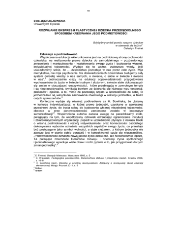 49 Ewa JĘDRZEJOWSKA Uniwersytet Opolski ROZWIJANIE EKSPRESJI PLASTYCZNEJ DZIECKA PRZEDSZKOLNEGO SPOSOBEM KREOWANIA JEGO PODMIOTOWOŚCI Gdybyśmy umieli pomóc naszym dzieciom 1 w stawaniu się ludźmi Celestyn Freinet Edukacja a podmiotowość Współczesna edukacja ukierunkowana jest na podmiotową stronę osobowości człowieka, na realizowanie prawa dziecka do samodzielnego – pozbawionego zniewolenia i manipulowania - kształtowania swego życia i budowania własnej, indywidualnej tożsamości. Wydaje się to ważne, zwłaszcza wtedy, jeśli uświadomimy sobie, że „…dzieciństwo pozostaje w nas przez całe życie. Mija metrykalnie, nie mija psychicznie. Na doświadczeniach dzieciństwa budujemy cały system dorosłej wiedzy o nas samych, o świecie, o sobie w świecie i świecie 2 w nas”. Jednocześnie ciąży na edukacji odpowiedzialność przygotowania wychowanków do życia w świecie trudnym i złożonym, świecie stale dokonujących się zmian w otaczającej rzeczywistości, które przebiegają w zawrotnym tempie i są nieprzewidywalne, wynikają bowiem ze ścierania się różnego typu tendencji, procesów i zjawisk, a te, mimo że pozostają często w sprzeczności ze sobą, to jednocześnie są warunkiem zachowania równowagi w rozwoju jednostek, a także całych społeczeństw.3 Konieczne wydaje się również podkreślenie za H. Sowińską, że „żyjemy w kulturze indywidualizacji, w której prawo jednostki, uzyskane w społecznej przestrzeni życia, do bycia sobą, do budowania własnej niezależnej tożsamości, obecnie w erze ponowoczesności zamienione zostało w imperatyw samorealizacji”4. Wspomniana autorka zwraca uwagę na paradoksalny efekt, polegający na tym, że współczesny człowiek odrzucając ograniczenia instytucji i zbiurokratyzowanych organizacji, popadł w uzależnienie płynące z nakazu troski o własną podmiotowość i rozwój indywidualności oraz konieczności osobistego dokonywania wyborów odnośnie wszystkich aspektów swego życia, co przestaje być postrzegane jako symbol wolności, a staje ciężarem, z którym jednostka nie zawsze jest w stanie sobie poradzić i w konsekwencji czuje się nieszczęśliwa. „Ponowoczesność oznacza nową jakość życia człowieka, ale niekoniecznie lepszą. Ta pulsująca zmienność kierunków rozwoju i orientacji życia społecznego i jednostkowego wywołuje wiele obaw i rodzi pytania o to, jak przygotować do tych zmian jednostkę”.5 1 C. Freinet, Gawędy Mateusza. Warszawa 1993, s. 5 D. Waloszek, Pedagogika przedszkolna. Metamorfoza statusu i przedmiotu badań. Kraków 2006, s. 10-11 3 H. Sowińska (red.), Dziecko w szkolnej rzeczywistości. Założony a rzeczywisty obraz edukacji elementarnej, Wstęp. Poznań 2011, s. 9 4 Ibidem 5 Ibidem 2 50 Dzieciństwo a podmiotowość Wpływy edukacyjne realizują się szczególnie silnie we wczesnych etapach życia jednostki. U podstaw ujęcia dzieciństwa, przyjmującego perspektywę horyzontalną (obok wertykalnego), leży idea podmiotowości, rozumiana z jednej strony w kategoriach rozwojowych (rozwój dziecka dokonuje się dzięki jego własnej aktywności w kontaktach z rzeczywistością), z drugiej zaś w kategoriach społeczno-kulturowych (jako społecznie zaakceptowane przeświadczenie o miejscu dziecka w strukturze społecznej). Dziecko postrzegane jest tu jako podmiot i twórca własnego rozwoju i jedynie z tej perspektywy dzieciństwo do niego należy – jest jego światem i indywidualnym doświadczeniem (które 6 urzeczywistnia się i rozwija poprzez kontakt z innymi, również z dorosłym). Podmiot, rozumiany jest jako „jednostka ludzka mająca poczucie własnej odrębności wobec innych osób i otaczającego ją świata, poznająca ten świat i nań oddziałująca, kierująca własnym postępowaniem i odpowiedzialna za własne decyzje oraz za przestrzeganie norm moralnych i prawnych ustalonych przez społeczeństwo”. 7 Określenie podmiotowość oznaczać więc będzie „moc sprawczą 8 lub potencjalną zdolność człowieka (zbiorowości) do samoprzekształcania się”. Podmiotowość a tożsamość Wychowanie w ujęciu podmiotowym „nie zdąża do kształtowania czegoś 9 w wychowanku, lecz kształtowania wychowanka (podmiotu, osoby)”. Podmiotowość rozumiana w kontekście rozwoju tożsamości (jako istotnego celu wychowania), to dążenie do zmiany rozwojowej, która pod jakimś względem przewyższa stan wyjściowy. Warto zaznaczyć, że w tradycji humanistycznej posługiwano się kategorią samorealizacji, rozumianej jako urzeczywistnianie potencjalności i zdolności jednostki, pewien rodzaj interakcji pedagogicznej mającej zapewnić warunki potrzebne do rozwijania się zadatków tkwiących w jednostce. W amerykańskiej radykalnej teorii edukacji operowano natomiast kategorią podmiotowości, rozumianej jako „płynny” ciągle przekształcający się stan doświadczenia jednostki w ramach relacji społecznych, jako działalność pedagogiczną polegającą na dostarczaniu wychowankom możliwie szerokiego spektrum umiejętności i wzorców tożsamości pojawiających się w świecie społecznym tak, aby mogli oni porównywać do nich fragmenty własnego doświadczenia.10 Oba nakreślone stanowiska wydają się ważne w szeroko rozumianym procesie wychowania dziecka. Trudno nie zgodzić się ze stwierdzeniem, że każde dziecko ma prawo do „bycia podmiotem”, do własnego widzenia świata i układania z nim swoich relacji, do wyrażania własnego zdania, do widzenia i rozumienia świata poprzez pryzmat swoich doświadczeń, odczuć, emocji a także osobistych pragnień, do 6 M. Szczepska-Pustkowska, Kategorie dziecka i dzieciństwa w nowożytnej myśli pedagogicznej. (w:) D. Klus-Stańska, M. Szczepska-Pustkowska, Pedagogika wczesnoszkolna-dyskursy, problemy, rozwiązania. Warszawa 2009, s. 107 7 W. Okoń, Nowy słownik pedagogiczny. Warszawa 1996, s. 215 8 T. Hejnicka-Bezwińska, Pedagogika ogólna. Warszawa 2008,