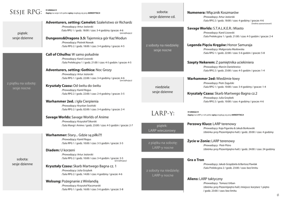 Sesje RPG: !!! UWAGA !!! Zapisy na sesje i ich pełne opisy znajdują się przy AKREDYTACJI sobota: sesje dzienne cd. Adventurers, setting: Camelot: Szaleństwo sir Richarda piątek: sesje dzienne Savage Worlds: S.T.A.L.K.E.R.: Miasto /Prowadzący: Karol Lisowski /Sala Prelekcyjna 1 / godz. 21:00 / czas: 4-5 godzin / gracze: 2-4 (początkujący) Dungeons&Dragons 3.5: Tajemnica gór Kaz’Modun z soboty na niedzielę: sesje nocne Call of Cthulhu: W samo południe /Prowadzący: Karol Lisowski /Sala Prelekcyjna 1 / godz. 21:00 / czas: 4-5 godzin / gracze: 4-5 /Prowadzący: Małgorzata Masłowska /Sala RPG 1 / godz. 22:00 / czas: 5-6 godzin / gracze: 5-8 /Prowadzący: Marcin Danielewicz /Sala RPG 2 / godz. 23:00 / czas: 4-5 godzin / gracze: 1-4 /Prowadzący: Artur Jeziorski /Sala RPG 1 / godz. 22:00 / czas: 3-4 godziny / gracze: 4-6 Warhammer 2ed: Wiedźmie łowy (początkujący) Kryształy Czasu: Od świtu do świtu /Prowadzący: Kamil Rogus /Sala RPG 2 / godz. 22:00 / czas: 2-4 godziny / gracze: 3-5 niedziela: sesje dzienne /Prowadzący: Piotr Zagulski /Sala RPG 1 / godz. 10:00 / czas: 3-4 godziny / gracze: 1-4 Kryształy Czasu: Skarb Martwego Bagna cz.2 /Prowadzący: Julia Grzybek /Sala RPG 2 / godz. 10:00 / czas: 4 godziny / gracze: 4-6 Warhammer 2ed. : Igła Cierpienia /Prowadzący: Krystian Sosiński /Sala RPG 2 / godz. 02:00 / czas: 3-4 godziny / gracze: 2-4 Savage Worlds: Savage Worlds of Anime /Prowadzący: Krzysztof Sikorski /Sala Mangi i Anime / godz. 23:00 / czas: 4-5 godzin / gracze: 2-7 LARP-y: /Prowadzący: Kamil Rogus /Sala RPG 1 / godz. 10:00 / czas: 3-5 godzin / gracze: 3-5 Diadem: U korzeni Perzowy Klucz: LARP terenowy z piątku na sobotę: LARP-y nocne Życie w Zonie: LARP terenowy /Prowadzący: Artur Jeziorski /Sala RPG 2 / godz. 10:00 / czas: 3-4 godzin / gracze: 3-5 Kryształy Czasu: Skarb Martwego Bagna cz. 1 Wolsung: Pożegnanie z Winlandią /Prowadzący: Krzysztof Kaczmarski /Sala RPG 1 / godz. 16:00 / czas: 5-6 godzin / gracze: 5-8 /Prowadzący: Kaja Figarska & Jakub Borkowski /zbiórka: przy Pizzerii(piętro hali) / godz. 20:00 / czas: 4 godziny /Prowadzący: Piotr Pióro /zbiórka: przy Pizzerii(piętro hali) / godz. 24:00 / czas: 24 godziny Gra o Tron (początkujący) /Prowadzący: Julia Grzybek /Sala RPG 2 / godz. 14:00 / czas: 4 godziny / gracze: 4-6 !!! UWAGA !!! Zapisy na LARP-y i ich pełne opisy znajdują się przy AKREDYTACJI piątek: LARP wieczorowy Warhammer: Stary... Gdzie są piłki?!! sobota: sesje dzienne Legenda Pięciu Kręgów: Honor Samuraja Szepty Nekerem: Z pamiętnika uciekiniera Adventurers, setting: Gothica: Noc Grozy z piątku na sobotę: sesje nocne /Prowadzący: Artur Jeziorski /Sala RPG 2 / godz. 18:00 / czas: 4 godziny / gracze: 4-6 (średnio zaawansowani) /Prowadzący: Artur Jeziorski /Sala RPG 1 / godz. 18:00 / czas: 3-4 godziny /gracze: 4-6 /Prowadzący: Piotrek Nowak /Sala RPG 2 / godz. 18:00 / czas: 3-4 godziny / gracze: 4-5 Numenera: Włącznik Koszmarów z soboty na niedzielę: LARP-y nocne /Prowadzący: Jakub Grządziela & Bartosz Pawlak /Sala Prelekcyjna 2 / godz. 23:00 / czas: bez limitu Aliens: LARP taktyczny /Prowadzący: Tomasz Urban /zbiórka: przy Pizzerii(piętro hali) /miejsce: korytarz 1 piętro / godz. 23:00 / czas: bez limitu 6