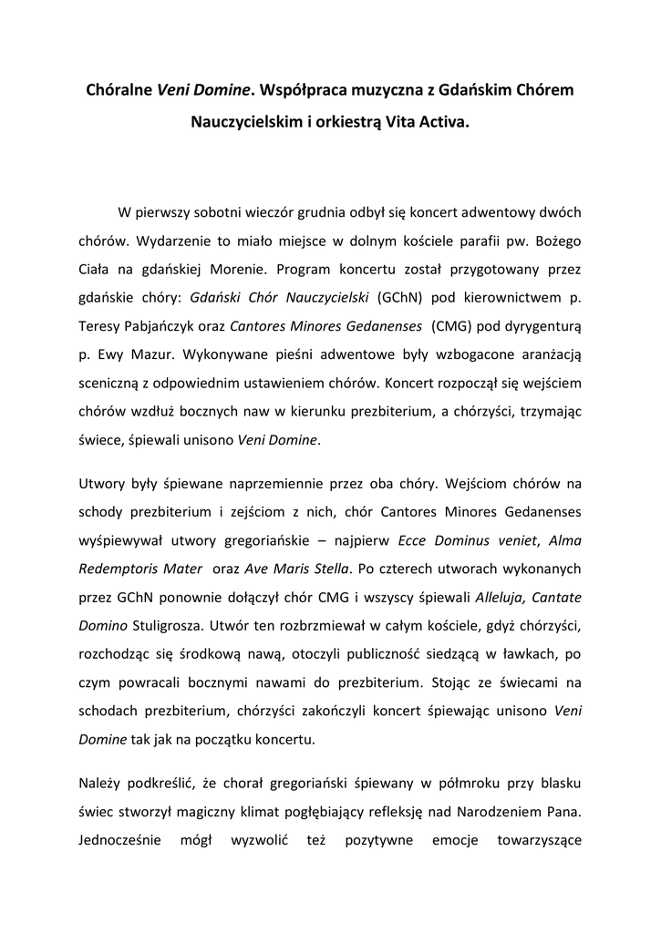 Chóralne Veni Domine. Współpraca muzyczna z Gdaoskim Chórem Nauczycielskim i orkiestrą Vita Activa. W pierwszy sobotni wieczór grudnia odbył się koncert adwentowy dwóch chórów. Wydarzenie to miało miejsce w dolnym kościele parafii pw. Bożego Ciała na gdaoskiej Morenie. Program koncertu został przygotowany przez gdaoskie chóry: Gdański Chór Nauczycielski (GChN) pod kierownictwem p. Teresy Pabjaoczyk oraz Cantores Minores Gedanenses (CMG) pod dyrygenturą p. Ewy Mazur. Wykonywane pieśni adwentowe były wzbogacone aranżacją sceniczną z odpowiednim ustawieniem chórów. Koncert rozpoczął się wejściem chórów wzdłuż bocznych naw w kierunku prezbiterium, a chórzyści, trzymając świece, śpiewali unisono Veni Domine. Utwory były śpiewane naprzemiennie przez oba chóry. Wejściom chórów na schody prezbiterium i zejściom z nich, chór Cantores Minores Gedanenses wyśpiewywał utwory gregoriaoskie – najpierw Ecce Dominus veniet, Alma Redemptoris Mater oraz Ave Maris Stella. Po czterech utworach wykonanych przez GChN ponownie dołączył chór CMG i wszyscy śpiewali Alleluja, Cantate Domino Stuligrosza. Utwór ten rozbrzmiewał w całym kościele, gdyż chórzyści, rozchodząc się środkową nawą, otoczyli publicznośd siedzącą w ławkach, po czym powracali bocznymi nawami do prezbiterium. Stojąc ze świecami na schodach prezbiterium, chórzyści zakooczyli koncert śpiewając unisono Veni Domine tak jak na początku koncertu. Należy podkreślid, że chorał gregoriaoski śpiewany w półmroku przy blasku świec stworzył magiczny klimat pogłębiający refleksję nad Narodzeniem Pana. Jednocześnie mógł wyzwolid też pozytywne emocje towarzyszące adwentowemu oczekiwaniu. Sprzyjają temu też poranne msze roratnie ze świecami, zakorzenione w tradycji kościoła katolickiego, a odprawiane ku czci Maryi w dniach powszednich do świąt Bożego Narodzenia. W okresie tym obchodzona jest też uroczystośd Niepokalanego Poczęcia NMP, tj. 8 grudnia. Stąd częśd utworów poświęcona była Maryi, a były to: Alma Redemptoris Mater, Ave Maris Stella, Zdrowaś bądź Maryja H.M. Góreckiego, czy Po upadku człowieka grzesznego opracowanego przez S. Kwiatkowskiego. Koncert zakooczył się owacjami na stojąco i był bardzo urokliwym wydarzeniem potęgującym modlitewny nastrój Adwentu, wprowadzającym subtelnie w święty czas oczekiwania. Pieśo Veni, Domine – Przybądź, Panie stała się mottem tegorocznego koncertu adwentowego1. Koncert pieśni adwentowych był drugim wspólnym projektem muzycznym chóru Cantores Minores Gedanenses z Gdaoskim Chórem Nauczycielskim. Kilka lat temu chór GChN mogliśmy podziwiad podczas jednego ze spotkao kolędowych w Domu Kultury LWSM "Morena", gdzie wystąpił z repertuarem kolędowym. Natomiast oba chóry GChN i CMG wykonały wspólnie w maju 2015 częśd kantaty Carmina Burana Carl Orff’a - ‘O Fortuna’ podczas koncertu inaugurującego III Festiwal Kultury Białoruskiej na Pomorzu2 , który odbył się w Centrum Św. Jana w Gdaosku. Przeżycie było niesamowite, gdyż akompaniowała nam orkiestra bałałajek z Paostwowego Uniwersytetu Kultury i Sztuki z Mioska. Pieśo ‘O Fortuna’ wieoczyła to wydarzenie i była wykonywana na bis na zakooczenie koncertu z owacjami na stojąco. Sam koncert składał się z występów wokalno-instrumentalnych z utworami dedykowanymi dla poszczególnych instrumentów, składających się na orkiestrę. Niezapomniane chwile i przeżycia muzyczne w przepięknych, a zarazem tajemniczych wnętrzach kościoła św. Jana w Gdaosku na długo zagoszczą w naszej pamięci. Warto zauważyd, że nasze występy zawsze były poprzedzone wspólnymi próbami w sali konferencyjnej parafii pw. Bożego Ciała lub w kościele już na próbie generalnej. Obie dyrygentki wykazywały się dużą dozą cierpliwości, wyrozumiałości i pasją, by przygotowad oba chóry, każdy składający się z 30-35 głosów. Żywimy nadzieję na dalszą współpracę z Gdaoskim Chórem Nauczycielskim przy kolejnych projektach muzycznych. Wszystkich melomanów muzyki zapraszamy na nasze koncerty kolęd, pierwszy już w najbliższą sobotę, tj. 9 stycznia br. w Garnizonie Kultury STARY MANEŻ we Wrzeszczu. Odbędzie się tam koncert noworoczny w wykonaniu orkiestry Vita Activa3 działającej przy Polskim Stowarzyszeniu Na Rzecz Osób z Upośledzeniem Umysłowym w Gdaosku z gościnnym udziałem naszego chóru. To jest również nasz drugi projekt muzyczny z orkiestrą. Wcześniej przygotowaliśmy wspólny koncert, który odbył się 19 grudnia 2015 w górnym kościele pw. Bożego Ciała na gdaoskiej Morenie. Stał się wyjątkowym i wzruszającym wydarzeniem, gdyż orkiestrę tworzą osoby z upośledzeniem umysłowym, wspierane podczas występów przez ich rodziny oraz muzyków-wolontariuszy. Pełne zaangażowanie Rodziców i ich pociech w przygotowanie utworów muzycznych pod dyrekcją pani Mirosławy Lipioskiej i ich precyzyjne wykonanie, stworzyło magiczny klimat wprowadzający nas w okres świąteczno-noworoczny. Wspólnie wykonaliśmy Jam jest Dudka i White Christmas w wersji anglojęzycznej i polskiej. W naszych przedsięwzięciach wspierają nas organizacyjnie: Rada Dzielnicy Piecki-Migowo i parafia pw. Bożego Ciała, a medialnie Dobre Wiadomości 4 i firma EDU-GLOB, za co serdecznie dziękujemy. więcej info: 1 http://chorcmg.pl/chor/aktualnosci/ 2 http://www.nck.org.pl/pl/wydarzenie/2388/iii-festiwal-kultury-bialoruskiej- na-pomorzu-inauguracja 2’ 3 http://pomorskie.eu/-/inauguracja-iii-festiwalu-kultury-bialoruskiej http://orkiestra-vita-activa.pl/ 4 https://pl-pl.facebook.com/Dobre-Wiadomo%C5%9Bci-135959456434552/ Opracowała: Aleksandra Kowalewska-Wójcik, rzecznik CMG Koncert chóru CMG z orkiestrą Vita Activa – 19.12.2015