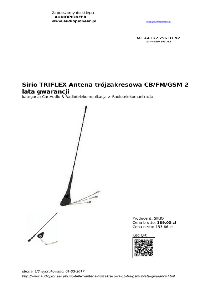 Zapraszamy do sklepu AUDIOPIONEER www.audiopioneer.pl [email protected] tel. +48 22 256 87 97 tel. +48 697 865 383 Sirio TRIFLEX Antena trójzakresowa CB/FM/GSM 2 lata gwarancji kategoria: Car Audio & Radiotelekomunikacja > Radiotelekomunikacja Producent: SIRIO Cena brutto: 189,00 zł Cena netto: 153,66 zł Kod QR: strona: 1/3 wydrukowano: 01-03-2017 http://www.audiopioneer.pl/sirio-triflex-antena-trojzakresowa-cb-fm-gsm-2-lata-gwarancji.html Historia przedsi?biorstwa Sirio Antenne si?ga lat 70-tych ubieg?ego wieku. Jej za?o?ycielem jest Giuseppe Grazioli. Pocz?tkowo oferta produktowa Sirio obejmowa?a najwy?szej klasy anteny do ??czno?ci radiowej skierowane na rynek niemiecki oraz w?oski. Przez blisko 40-lat firma zdoby?a zaufanie klientów z ca?ego ?wiata oraz pot??ne do?wiadczenie, które zaprocentowa?o szerok? ofert? wysokiej jako?ci sprz?tu. Montowana w miejsce fabrycznej anteny radiowej. Trzysystemowa wielozadaniowa jedna antena do wszystkiego. Wygl?dem przypomina fabryczn? anten? do radia samochodowego. Antena dla mniej wymagaj?cych, ale ceni?cych wygod? kierowców. W zale?no?ci od terenu antena daje zasi?g 4-6 kilometrów. Natomiast idealnie wtapia si? w otoczenie - nie przyci?ga z?odziei i wandali. Laik nie odró?ni, ?e samochód posiada zamontowane CD radio. Antena idealna dla tych, którzy nie lubi? afiszowa? z radyjkiem. Krótki bat nie wygina dachu, nigdy nie grozi odpadni?cie przy du?ych pr?dko?ciach. Antena CB SIRIO TRIFLEX CB / FM / GSM 900 zapewnia niski poziom szumów. Do jednej anteny mo?na pod??czy? CB RADIO, radio samochodowe i telefon GSM (zestawy g?o?nomówi?ce). Cechy: - CB Mobile antenna, Multi-band - CB cz?stotliwo?? dostrajalna poprzez obracanie tuleji stroj?cej - Gi?tki bat, zdejmowalny do myjni samochodowych - Dla CB 27 MHz, AM-FM radio oraz GSM 900 MHz Parametry elektryczne: Typ: CB 27 MHz band: 1/4 ? central loaded FM band: 1/4 ? helical loaded GSM 900 MHz band: 1/4 ? Zakres cz?stotliwo?ci: CB 27 MHz band: dostrajalna od 26.8 do 27.6 MHz poprzez obracanie nakr?tki AM-FM band: AM 0.15-1.6 MHz, FM 87.5-108 MHz GSM 900 MHz band: TX-band 880-915 MHz, RX-band 935-960 MHz Impedancja: AM-FM band: 150? niezbalansowana CB and GSM bands: 50? niezbalansowana Promieniowanie (H-plane): 360° wielokierunkowe Polaryzacja: strona: 2/3 wydrukowano: 01-03-2017 http://www.audiopioneer.pl/sirio-triflex-antena-trojzakresowa-cb-fm-gsm-2-lata-gwarancji.html pionowa Pasmo @ SWR ? 2: CB 27 MHz band: ? 440 KHz GSM 900 MHz band: ? 100 MHz SWR @ res. freq.: ? 1.2 Max. moc: CB 27 MHz band: 10 Watts GSM 900 MHz band: 20 Watts D?ugo?? kabla/Typ/Z??cze: CB 27 MHz band: 215 mm / RG316 / FME-wtyk m?ski FM band: 165 mm / RG316 / M10x0.75-wtyk m?ski GSM 900 MHz band: 120 mm / RG316 / FME-wtyk m?ski Parametry mechaniczne: Materia?y: nylon, chromowany mosi?dz, mied?, aluminium Wysoko?? (oko?o): 500 mm Waga (oko?o): 120 gr Rozmiar otworu mocuj?cego: Ø 18 mm or square 15mm G??boko?? mocowania: 12 mm strona: 3/3 wydrukowano: 01-03-2017 http://www.audiopioneer.pl/sirio-triflex-antena-trojzakresowa-cb-fm-gsm-2-lata-gwarancji.html