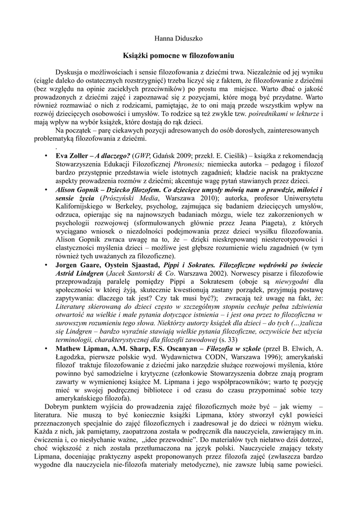 Hanna Diduszko Książki pomocne w filozofowaniu Dyskusja o możliwościach i sensie filozofowania z dziećmi trwa. Niezależnie od jej wyniku (ciągle daleko do ostatecznych rozstrzygnięć) trzeba liczyć się z faktem, że filozofowanie z dziećmi (bez względu na opinie zaciekłych przeciwników) po prostu ma miejsce. Warto dbać o jakość prowadzonych z dziećmi zajęć i zapoznawać się z pozycjami, które mogą być przydatne. Warto również rozmawiać o nich z rodzicami, pamiętając, że to oni mają przede wszystkim wpływ na rozwój dziecięcych osobowości i umysłów. To rodzice są też zwykle tzw. pośrednikami w lekturze i mają wpływ na wybór książek, które dostają do rąk dzieci. Na początek – parę ciekawych pozycji adresowanych do osób dorosłych, zainteresowanych problematyką filozofowania z dziećmi. . • Eva Zoller – A dlaczego? (GWP, Gdańsk 2009; przekł. E. Cieślik) – książka z rekomendacją Stowarzyszenia Edukacji Filozoficznej Phronesis; niemiecka autorka – pedagog i filozof bardzo przystępnie przedstawia wiele istotnych zagadnień; kładzie nacisk na praktyczne aspekty prowadzenia rozmów z dziećmi; akcentuje wagę pytań stawianych przez dzieci. • Alison Gopnik – Dziecko filozofem. Co dziecięce umysły mówią nam o prawdzie, miłości i sensie życia (Prószyński Media, Warszawa 2010); autorka, profesor Uniwersytetu Kalifornijskiego w Berkeley, psycholog, zajmująca się badaniem dziecięcych umysłów, odrzuca, opierając się na najnowszych badaniach mózgu, wiele tez zakorzenionych w psychologii rozwojowej (sformułowanych głównie przez Jeana Piageta), z których wyciągano wniosek o niezdolności podejmowania przez dzieci wysiłku filozofowania. Alison Gopnik zwraca uwagę na to, że – dzięki nieskrępowanej niestereotypowości i elastyczności myślenia dzieci – możliwe jest głębsze rozumienie wielu zagadnień (w tym również tych uważanych za filozoficzne). • Jorgen Gaare, Oystein Sjaastad, Pippi i Sokrates. Filozoficzne wędrówki po świecie Astrid Lindgren (Jacek Santorski & Co. Warszawa 2002). Norwescy pisarze i filozofowie przeprowadzają paralelę pomiędzy Pippi a Sokratesem (oboje są niewygodni dla społeczności w której żyją, skutecznie kwestionują zastany porządek, przyjmują postawę zapytywania: dlaczego tak jest? Czy tak musi być?); zwracają też uwagę na fakt, że: Literaturę skierowaną do dzieci często w szczególnym stopniu cechuje pełna zdziwienia otwartość na wielkie i małe pytania dotyczące istnienia – i jest ona przez to filozoficzna w surowszym rozumieniu tego słowa. Niektórzy autorzy książek dla dzieci – do tych (…)zalicza się Lindgren – bardzo wyraźnie stawiają wielkie pytania filozoficzne, oczywiście bez użycia terminologii, charakterystycznej dla filozofii zawodowej (s. 33) • Mathew Lipman, A.M. Sharp, F.S. Oscanyan – Filozofia w szkole (przeł B. Elwich, A. Łagodzka, pierwsze polskie wyd. Wydawnictwa CODN, Warszawa 1996); amerykański filozof traktuje filozofowanie z dziećmi jako narzędzie służące rozwojowi myślenia, które powinno być samodzielne i krytyczne (członkowie Stowarzyszenia dobrze znają program zawarty w wymienionej książce M. Lipmana i jego współpracowników; warto tę pozycję mieć w swojej podręcznej bibliotece i od czasu do czasu przypominać sobie tezy amerykańskiego filozofa). Dobrym punktem wyjścia do prowadzenia zajęć filozoficznych może być – jak wiemy – literatura. Nie muszą to być koniecznie książki Lipmana, który stworzył cykl powieści przeznaczonych specjalnie do zajęć filozoficznych i zaadresował je do dzieci w różnym wieku. Każda z nich, jak pamiętamy, zaopatrzona została w podręcznik dla nauczyciela, zawierający m.in. ćwiczenia i, co niesłychanie ważne, „idee przewodnie”. Do materiałów tych niełatwo dziś dotrzeć, choć większość z nich została przetłumaczona na język polski. Nauczyciele znający teksty Lipmana, doceniając praktyczny aspekt proponowanych przez filozofa zajęć (zwłaszcza bardzo wygodne dla nauczyciela nie-filozofa materiały metodyczne), nie zawsze lubią same powieści. Czują, że zostały ułożone przez filozofa, a nie napisane przez pisarza. Brak im wdzięku, literackiej urody. Co zatem mamy do wyboru na rynku książki, gdybyśmy chcieli wskazać pozycje przydatne w prowadzeniu zajęć filozoficznych? Na szczęście do wyboru mamy bardzo wiele. Takie pozycje przydatne można podzielić na trzy grupy: 1. książki mające z założenia ułatwić młodemu czytelnikowi podjęcie trudu refleksyjnego myślenia 2. książki dla dzieci, będące znakomicie napisana literaturą (te, warto mieć tu w pamięci tezę Gaarego i Sjaastada, są ze swej istoty filozoficzne). 3. książki znakomicie napisane, w których mamy do czynienia ze szczególną wrażliwością na tematykę zakorzenioną w tradycji filozoficznej. Oczywiście żadna książka (niezależnie od grupy, do której ją zaliczymy) nie jest gotowym materiałem w sensie Lipmanowskim. Osoba prowadząca zajęcia filozofowania (filozoficznych dociekań) musi wykonać pracę myślową, która dopiero uczyni z niej taki materiał. Praca ta może niekiedy polegać na wyborze najbardziej odpowiedniego fragmentu, ale (chyba częściej) wymaga głębszego wejścia w materię i znalezienia indywidualnego klucza, umożliwiającego otwarcie filozoficznych sensów obecnych, choć nie zawsze od razu zauważalnych. Ad.1. Spośród książek mających z założenia ułatwić młodemu czytelnikowi podjęcie trudu refleksyjnego myślenia warto wiedzieć o istnieniu następujących pozycji. • Michel Piquemal, Bajki filozoficzne (pierwsze polskie wydanie: Muchomor, Warszawa 2004; przeł. H. Sobieraj, il. A. Malmon); książka zawiera sześćdziesiąt bajek, pochodzących z różnych kręgów kulturowych; teksty są krótkie, niezwykle ciekawe, inspirują do myślenia. Wadą książki jako ewentualne
