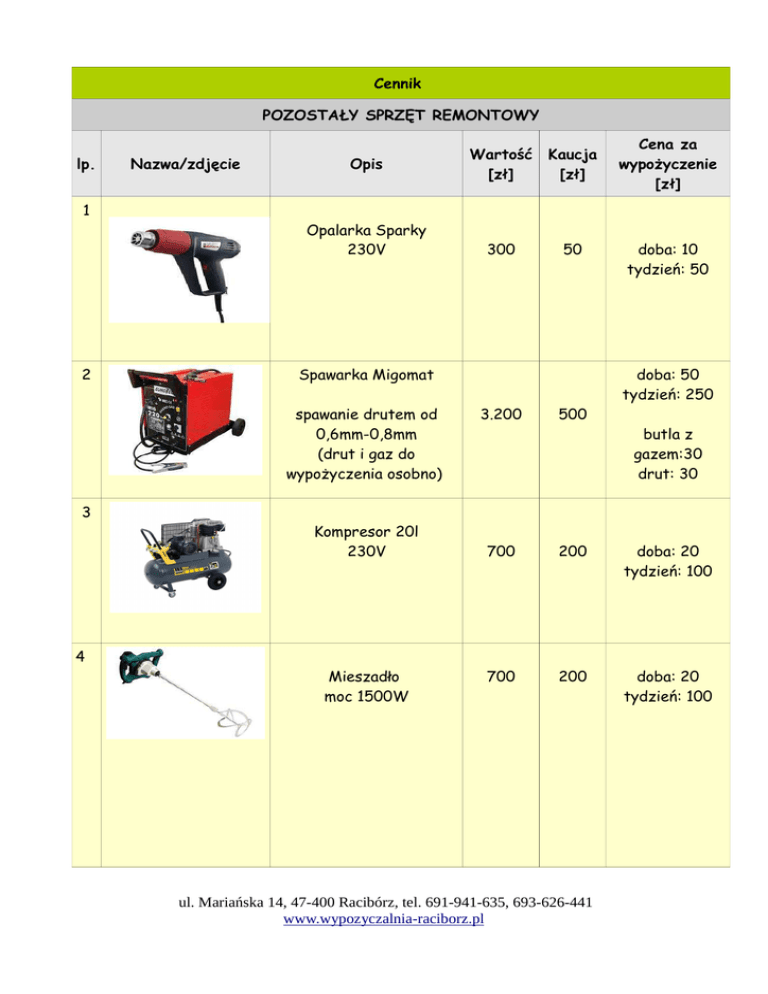 Cennik POZOSTAŁY SPRZĘT REMONTOWY lp. 1 2 Nazwa/zdjęcie Opis Opalarka Sparky 230V Kaucja [zł] 300 50 Spawarka Migomat spawanie drutem od 0,6mm-0,8mm (drut i gaz do wypożyczenia osobno) 3 Wartość [zł] Kompresor 20l 230V 3.200 500 Cena za wypożyczenie [zł] doba: 10 tydzień: 50 doba: 50 tydzień: 250 butla z gazem:30 drut: 30 700 200 doba: 20 tydzień: 100 700 200 doba: 20 tydzień: 100 4 Mieszadło moc 1500W ul. Mariańska 14, 47-400 Racibórz, tel. 691-941-635, 693-626-441 www.wypozyczalnia-raciborz.pl ZOSTAŁY SPRZĘT REMONTOWY lp. 5 6 Nazwa/zdjęcie Opis Niwelator laserowy NL 300 Odkurzacz do wody NILFISK Profesjonalny odkurzacz do zbierania wody i pracy na sucho o dużej sile ssania Moc 3000 W, zasilanie Wartość [zł] Kaucja [zł] 5000 800 5000 400 Cena za wypożyczenie [zł] doba: 70 tydzień: 350 doba: 70 tydzień: 350 220 - 240 V, pojemność 80 l 7 8 Palnik gazowy na propanbutan, Podłączenie pod butlę 11 kg Wózek paletowy Paleciak o udźwigu Q=2000kg Długość wideł L= 150 cm 200 50 doba: 10 tydzień: 50 bulta 70 900 200 ul. Mariańska 14, 47-400 Racibórz, tel. 691-941-635, 693-626-441 www.wypozyczalnia-raciborz.pl doba: 20 tydzień: 100 POZOSTAŁY SPRZĘT REMONTOWY lp. 9 10 Nazwa/zdjęcie Opis Podnośnik do płyt kartonowo-gipsowych Betoniarka Defro poj. całkowita 120l poj. robocza 80l przechył bębna kołem 230V Wartość [zł] 1000 1100 Kaucja [zł] Cena za wypożyczenie [zł] 100 doba: 25 tydzień: 125 100 Doba: 25 tydzień: 125 ul. Mariańska 14, 47-400 Racibórz, tel. 691-941-635, 693-626-441 www.wypozyczalnia-raciborz.pl