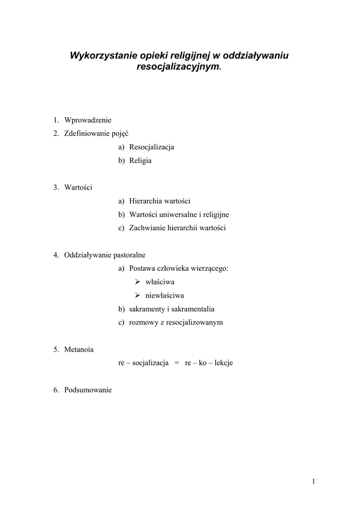 Wykorzystanie opieki religijnej w oddziaływaniu resocjalizacyjnym. 1. Wprowadzenie 2. Zdefiniowanie pojęć a) Resocjalizacja b) Religia 3. Wartości a) Hierarchia wartości b) Wartości uniwersalne i religijne c) Zachwianie hierarchii wartości 4. Oddziaływanie pastoralne a) Postawa człowieka wierzącego: właściwa niewłaściwa b) sakramenty i sakramentalia c) rozmowy z resocjalizowanym 5. Metanoia re – socjalizacja = re – ko – lekcje 6. Podsumowanie 1 1. Wprowadzenie. Dzisiejsze nasze spotkanie ma na celu ukazać, czy istnieje jakiś związek między religią, a resocjalizacją, dokładniej jednak precyzując temat dzisiejszego wykładu, chcemy się zastanowić, czy można wykorzystać opiekę religijną w oddziaływaniu resocjalizacyjnym. By pełniej rozważyć to zagadnienie warto zastanowić się nad definicją zarówno resocjalizacji jak również religii. Po czym nasze spojrzenie skierujemy ku wartościom, jakie towarzyszą ludzkiemu życiu na różnych jego etapach i odkrywaniu wartości przez człowieka. Następnie przejdziemy do posługi religijnej w stosunku do osób poddanych procesowi resocjalizacji, aby później zastanowić się nad skutkami takiego działania. 2. Zdefiniowanie pojęć. Poruszając każde zagadnienie, na początku należy ustalić, co rozumiemy pod danym słowem. a) Resocjalizacja. Bez wątpienia znacie Państwo podstawy i różne definicje resocjalizacji lecz na użytek naszego wykładu niech posłuży nam zdefiniowanie resocjalizacji przez Władysława Kopalińskiego w słowniku wyrazów obcych i zwrotów obcojęzycznych: „resocjalizacja przystosowanie (się) do życia społ. jednostki źle współżyjącej ze środowiskiem społecznym albo pozbawionej dotychczas możliwości współżycia z nim (np. przez długotrwałe uwięzienie albo chorobę). Etym. - zob. re-; socjalizacja - RE- w złożeniach: znów, na nowo, powtórnie; cofnięcie (w miejscu; w czasie; do poprzedniej sytuacji); w tył; w przeciwnym kierunku. b) Religia Kolejnym pojęciem, którym będziemy się posługiwać podczas tego wykładu, jest religia. Za „Katolicyzm A – Z” można powiedzieć, że religia to: „realna i dynamiczna relacja osobowa człowieka do rzeczywistości transcendentnej, w naszej kulturze – do osobowo rozumianego Absolutu (Boga), od którego człowiek czuje się zależny w istnieniu oraz działaniu i który jest ostatecznym celem nadającym sens życiu ludzkiemu. Religia stanowi dział kultury (obok nauki, sztuki i moralności) obejmujący: a) dziedzinę poznania, opartego najczęściej o wiarę nadprzyrodzoną (doktryna religijna, wierzenie i normy); b) działania (kult, obrzędy i postępowania moralne); c) instytucje, które pomagają członkom wspólnoty religijnej (Kościół) w życiu religijnym. Religia to system wierzeń i praktyk, określający relację jednostki do różnie pojmowanej sfery sacrum, czyli świętości i sfery boskiej. Manifestuje się ona w wymiarze doktrynalnym (doktryna, wiara), w czynnościach religijnych 2 (kult), w sferze społeczno-organizacyjnej (Kościół, wspólnota religijna) i w sferze duchowości indywidualnej (m.in. mistyka).(Wolna Encyklopedia) Religia [łac.], zjawisko określane najczęściej jako relacja człowieka do sacrum. W starożytności i średniowieczu zwykle formułowano definicje nominalne, będące przekładem terminu religia, np. wg Cycerona pojęcie religia pochodzi z łac. relegare [‘odczytywać ponownie’] i oznacza zdolność odczytywania tego, co jest związane z Bogiem, wg Laktancjusza — z łac. religare [‘wiązać ponownie’] i oznacza związanie człowieka z Bogiem, natomiast wg św. Augustyna z łac. reeligare [‘wybierać ponownie’] w znaczeniu obierać sobie Boga za przedmiot czci. Odpowiednikiem pojęcia religia w tradycjach nieeuropejskich jest zazwyczaj nienaruszalne i święte prawo obowiązujące wyznawców, którego nadprzyrodzony charakter wymaga od nich przyjęcia odpowiedniej postawy duchowej (np. sanatana dharma w hinduizmie). Najogólniej można za religię uznać relację człowieka do różnie pojmowanej świętości (sacrum) i sfery boskiej, manifestującą się w wymiarze doktrynalnym (wiara), w czynnościach religijnych (kult), w sferze społecznoorganizacyjnej (Kościół, wspólnota religijna) i w sferze religijności indywidualnej (np. mistyka). To, co społeczne w religii, jest wzorcem dla rozwijania religijności indywidualnej, która z kolei — przez dokonania jednostek (święty) — powiększa zasób wzorców religijnych dla całej wspólnoty. Relacja między człowiekiem a sacrum zakłada aktywność osoby ludzkiej doświadczającej poczucia świętości, którego zaistnienie świadczy o religijnym charakterze danego zjawiska. Poczucie to manifestuje się w przeżywaniu pragnienia zbliżenia się do sacrum, zjednoczenia z nim, a zarazem w postawie czci, dystansu, a nawet lęku przed nim (tabu). Dzięki doświadczeniu religijnemu sfera sacrum „włamuje się” w świat codzienności i objawia człowiekowi w konkretnym miejscu i czasie (hierofania). Doświadczenie religijne człowieka, od objawienia i ekstazy mistycznej czy transu szamańskiego po przelotne poczucie obecności bóstwa w życiu, jest podstawowym fenomenem podtrzymującym istnienie religii. (Encyklopedia PWN) Według Wielkiej Encyklopedii Radzieckiej, cytującej Engelsa: „ Wszelka religia jawi się jako nic innego, jak fantastyczne wyobrażenie – odczucie, w głowach ludzi wyższych sił, które panują nad nimi w ich codziennym życiu – wyobrażenie – odczucie, w którym ziemskie siły przyjmują formy nieziemskich sił.” We wszystkich tych definicjach religii możemy znaleźć wspólną cechę – relację człowieka do pewnego Absolutu, „Czegoś – Kogoś „ ponad nim, ale to również sacrum, kult i doktryna czyli pewne zasady kierujące życiem człowieka uważającego się za religijnego. Ten fakt pozwala nam przejść do kolejnego punktu jakim są WARTOŚCI. 