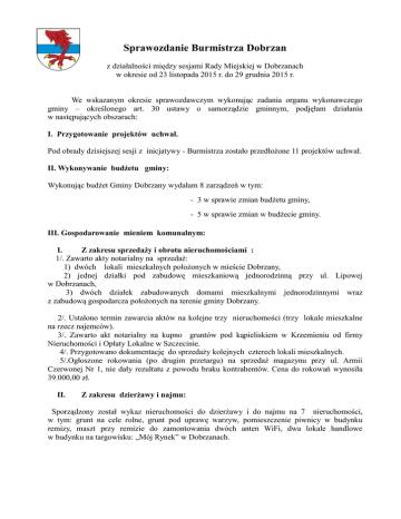 Sprawozdanie Burmistrza Dobrzan z działalności między sesjami Rady Miejskiej w Dobrzanach w okresie od 23 listopada 2015 r. do 29 grudnia 2015 r. We wskazanym okresie sprawozdawczym wykonując zadania organu wykonawczego gminy – określonego art. 30 ustawy o samorządzie gminnym, podjęłam działania w następujących obszarach: I. Przygotowanie projektów uchwał. Pod obrady dzisiejszej sesji z inicjatywy - Burmistrza zostało przedłożone 11 projektów uchwał. II. Wykonywanie budżetu gminy: Wykonując budżet Gminy Dobrzany wydałam 8 zarządzeń w tym: - 3 w sprawie zmian budżetu gminy, - 5 w sprawie zmian w budżecie gminy. III. Gospodarowanie mieniem komunalnym: I. Z zakresu sprzedaży i obrotu nieruchomościami : 1/. Zawarto akty notarialny na sprzedaż: 1) dwóch lokali mieszkalnych położonych w mieście Dobrzany, 2) jednej działki pod zabudowę mieszkaniową jednorodzinną przy ul. Lipowej w Dobrzanach, 3) dwóch działek zabudowanych domami mieszkalnymi jednorodzinnymi wraz z zabudową gospodarcza położonych na terenie gminy Dobrzany. 2/. Ustalono termin zawarcia aktów na kolejne trzy nieruchomości (trzy lokale mieszkalne na rzecz najemców). 3/. Zawarto akt notarialny na kupno gruntów pod kąpieliskiem w Krzemieniu od firmy Nieruchomości i Opłaty Lokalne w Szczecinie. 4/. Przygotowano dokumentację do sprzedaży kolejnych czterech lokali mieszkalnych. 5/.Ogłoszone rokowania (po drugim przetargu) na sprzedaż magazynu przy ul. Armii Czerwonej Nr 1, nie dały rezultatu z powodu braku kontrahentów. Cena do rokowań wynosiła 39.000,00 zł. II. Z zakresu dzierżawy i najmu: Sporządzony został wykaz nieruchomości do dzierżawy i do najmu na 7 nieruchomości, w tym: grunt na cele rolne, grunt pod uprawę warzyw, pomieszczenie piwnicy w budynku remizy, maszt przy remizie do zamontowania dwóch anten WiFi, dwa lokale handlowe w budynku na targowisku: „Mój Rynek” w Dobrzanach. IV. Straż miejska 1. Podjęto 3 interwencje na prośbę mieszkańców oraz instytucji dotyczących zakłócania spokoju i porządku w gminie, oraz nieprzestrzegania regulaminu utrzymania czystości i porządku w gminie, oraz innych przepisów. 2. Prowadzono 1 postępowanie oraz dokonywano czynności wyjaśniających w sprawie popełnionych wykroczeń, w ramach pomocy prawnej z innymi jednostkami Straży Miejskiej. 3. Otrzymano 1 zgłoszenie od Towarzystwa Przyjaciół nad Zwierzętami w Szczecinie dotyczące zaniedbanych zwierząt. 4. W ramach czynności profilaktycznych pouczono 3 osoby. V. Zamówienia publiczne Zostały przeprowadzone następujące postępowania o udzielenie zamówienia: 1. z zastosowaniem przepisów Ustawy Prawo zamówień publicznych: 1) postępowanie o udzielenie zamówienia publicznego w trybie przetargu nieograniczonego pn: „Obsługa i utrzymanie cmentarzy komunalnych w Dobrzanach i Lutkowie w Gminie Dobrzany w latach 2016-2019”. Postępowanie zostało unieważnione, ponieważ oferta z najniższą ceną przewyższa kwotę, jaką Zamawiający zamierzał przeznaczyć na sfinansowanie zamówienia, 2) postępowanie o udzielenie zamówienia publicznego w trybie przetargu nieograniczonego pn: „Sprzątanie miasta Dobrzany i utrzymanie zieleni miejskiej w latach 2016 - 2019”. Postępowanie zostało unieważnione, ponieważ oferta z najniższą ceną przewyższa kwotę, jaką Zamawiający zamierzał przeznaczyć na sfinansowanie zamówienia, 3) II postępowanie o udzielenie zamówienia publicznego w trybie przetargu nieograniczonego pn: „Obsługa i utrzymanie cmentarzy komunalnych w Dobrzanach i Lutkowie w Gminie Dobrzany w latach 2016-2019”. Wybrano ofertę najkorzystniejszą Wykonawcy Zakład Pogrzebowy Czesław Bylewski z siedzibą w Dobrzanach. Z Wykonawcą zostanie zawarta umowa na wykonanie zamówienia, 4) postępowanie o udzielenie zamówienia publicznego w trybie przetargu nieograniczonego pn: „Sprzątanie miasta Dobrzany i utrzymanie zieleni miejskiej w latach 2016 - 2019”. Wybrano ofertę najkorzystniejszą Wykonawcy Zakład Ochrony Środowiska Zbigniew Daniłowicz z siedzibą w Dobrzanach. Z Wykonawcą zostanie zawarta umowa na wykonanie zamówienia, 2. bez zastosowania przepisów Ustawy Prawo zamówień publicznych, zgodnie z Zarządzeniem Burmistrza Dobrzan nr 43/2015 z dnia 14 maja 2015r.: 1) postępowanie o udzielenie zamówienia publicznego na wymianę drzwi zewnętrznych oraz remont schodów przyległych do budynków Zespołu Szkół Publicznych w Dobrzanach. Umowa została zawarta 4.12.2015r. z ALANCO Spółka z ograniczoną odpowiedzialnością z siedzibą w Stargardzie Szczecińskim. Ponadto Gmina Dobrzany we wskazanym okresie zawarła następujące umowy: 1) umowa nr 65/2015 z dnia 26.11.2015 r. na wykonanie dokumentacji budowlano – wykonawczej dla inwestycji „Przebudowa drogi w miejscowości Krzemień w Gminie Dobrzany” z Anetą Bączkowską prowadzącą działalność gospodarczą pod nazwą „Usługi Budowlano – Rachunkowe Aneta Bączkowska” z siedzibą w Stargardzie Szczecińskim, 2) umowa nr 66/2015 z dnia 26.11.2015 r. na wykonanie dokumentacji budowlano – wykonawczej dla inwestycji „Przebudowa ulicy Parkowej i przechodniej w Dobrzanach” z Anetą Bączkowską prowadzącą działalność gospodarczą pod nazwą „Usługi Budowlano – Rachunkowe Aneta Bączkowska” z siedzibą w Stargardzie Szczecińskim, 3) umowa nr 67/2015 z dnia 26.11.2015 r. na wykonanie dokumentacji budowlano – wykonawczej dla inwestycji „Przebudowa drogi w miejscowości Biała w Gminie Dobrzany” z Anetą Bączkowską prowadzącą działalność gospodarczą pod nazwą „Usługi Budowlano – Rachunkowe Aneta Bączkowska” z siedzibą w Stargardzie Szczecińskim, 4) umowa nr 68/2015 z dnia 01.12.2015 r. na dostawę sygnału internetowego dla 60 punktów odbioru w ramach trwałości projektu pn. „Dostęp do Internetu szansą na rozwój dla „wykluczonych cyfrowo” mieszkańców Gminy Dobrzany” z Tomaszem Borys prowadzącym d