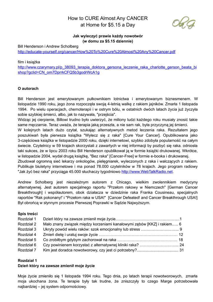 How to CURE Almost Any CANCER at Home for $5.15 a Day Jak wyleczyć prawie każdy nowotwór (w domu za $5.15 dziennie) Bill Henderson i Andrew Scholberg http://educate-yourself.org/cancer/How%20To%20Cure%20Almost%20Any%20Cancer.pdf film i książka http://www.czarymary.pl/p_38093_terapia_doktora_gersona_leczenie_raka_charlotte_gerson_beata_bi shop?gclid=CN_om7DprrkCFQ5b3godrWcA1g O autorach Bill Henderson jest emerytowanym pułkownikiem lotnictwa i emerytowanym biznesmenem. W listopadzie 1990 roku, jego żona rozpoczęła swoją 4-letnią walkę z rakiem jajników. Zmarła 1 listopada 1994. Po wielu operacjach, chemoterapii i w ostrym bólu, w ostatnich dwóch latach życia już życzyła sobie szybkiej śmierci, albo, jak to nazywała, "przejścia". Widząc jej cierpienie, Billowi trudno było uwierzyć, że miliony ludzi każdego roku musiały znosić takie same męczarnie. Teraz uważa, że terapia jaką przeszła, a nie sam rak, była przyczyną jej śmierci. W kolejnych latach dużo czytał, szukając alternatywnych metod leczenia raka. Rezultatem jego poszukiwań była pierwsza książka "Wylecz się z raka" [Cure Your Cancer]. Opublikowana jako 3-częściowa książka w listopadzie 2000 roku, dzięki internetowi, szybko zdobyła popularność na całym świecie. Czytelnicy w 59 krajach skorzystali z zawartych w niej informacji by pozbyć się raka. odniosła taki sukces, że w lipcu 2003 roku Bill Henderson opublikował ją w formie książki drukowanej. Wkrótce, w listopadzie 2004, wydał drugą książkę, "Bez raka" [Cancer-Free] w formie e-booka i drukowanej. Zbudował ogromną sieć lekarzy onkologów, pielęgniarek, wyleczonych z raka i walczących z rakiem. Publikuje biuletyny internetowe i ma ponad 78.000 czytelników w 78 krajach. Jego program radiowy "Jak żyć bez raka" przyciąga 45.000 słuchaczy tygodniowo http://www.WebTalkRadio.net. Andrew Scholberg jest niezależnym autorem z Chicago, wielkim zwolennikiem medycyny alternatywnej. Jest autorem specjalnego raportu "Przełom rakowy w Niemczech" [German Cancer Breakthrough] i współautorem, obok działacza w dziedzinie raka Franka Cousineau, specjalnych raportów "Rak pokonany!' i "Przełom raka w USA!" [Cancer Defeated! and Cancer Breakthrough USA!] Był obrońcą w słynnym procesie Pierwszej Poprawki w Sądzie Najwyższym. Spis treści Rozdział 1 Rozdział 2 Rozdział 3 Rozdział 4 Rozdział 5 Rozdział 6 Rozdział 7 Dzień który na zawsze zmienił moje życie………………………………………….1 Mało znany związek między korzeniami kanałowymi zębów [KKZ] i rakiem….. 6 Ukryty powód wielu raków: szok emocjonalny lub stress ……………………….. 9 Zmień dietę i uratuj swoje życie …………………………………………………… 12 Co zrobiłbym gdybym zachorował na raka ………………………………………. 18 Czy powinienem korzystać z alternatywnej kliniki raka? ………………………... 24 Kim jest doradca nowotworowy, czy jest ci potrzebny?...................................... 31 Rozdział 1 Dzień który na zawsze zmienił moje życie Moje życie zmieniło się 1 listopada 1994 roku. Tego dnia, po latach terapii nowotworowych, zmarła moja ukochana żona. Te terapie były tak trudne, że zniszczyły to czego Marge potrzebowała najbardziej – jej system odpornościowy. To leczenie było dla niej męczarnią. Przechodziła jedną operację po drugiej – na próżno. A radiacja i niekończąca się chemoterapia uczyniły ją bardzo chorą. Cierpiała ból, tęskniła za "przejściem", chciała umrzeć, i umarła. Po jej śmierci długo się zastanawiałem nad mękami jakim poddał ją amerykański przemysł leczenia raka. Nie mogłem pozbyć się myśli, że musi być jakiś inny sposób – delikatniejszy i skuteczniejszy pozbycia się raka. Coś mi mówiło, że to nie rak ją zabił. Podejrzewałem, że zabiła ją terapia rakowa – metody jakie większość Amerykanów bierze za pewnik: operacja, radio i chemoterapia. Teraz nazywam je "tnij, pal, truj". I poszedłem śladem tego podejrzenia i zacząłem badać by dowiedzieć się prawdy. Stałem się pełnoetatowym poszukiwaczem lepszego sposobu leczenia raka, co absorbuje mnie do dnia dzisiejszego – 15 lat później. A teraz, po zbadaniu wszystkiego co mogłem znaleźć na temat raka, jestem w 100% pewien, że 'miałem nosa': to nie rak a ostre "medyczne" terapie zabiły moją żonę. Przez ostatnie 10 lat nie było dnia żebym nie pracował nad alternatywną terapią nowotworową: badanie, czytanie, szukanie i udzielanie pomocy pacjentom w pozbyciu się raka delikatnymi, skutecznymi i nie trującymi metodami. W tym czasie odkryłem kilka skutecznych sposobów pozbycia się raka. I pomogłem setkom zwykłych Amerykanów pokonać wyroki śmierci wydane na nich przez lekarzy. Typowo, amerykański lekarz pacjentowi na II czy IV etapie powie coś w rodzaju: "Masz 3 do 6 miesięcy życia". Ale to nic nie znaczy, chyba że pacjent w to uwierzy. Moją bestsellerową książką "Bez raka: przewodnik po delikatnej, nie trującej terapii" [Cancer-Free: Your Guide to Gentle, Non-toxic Healing] pomogłem niezliczonym "nieuleczalnie" i "beznadziejnie" chorym pacjentom udowodnić, że ci lekarze nie mieli racji. Na przykład: jednym z moich klientów jest wspaniała młoda kobieta z San Diego walcząca z rakiem piersi. Powiedziała mi, że jej onkolog był bardziej agresywny niż sprzedawca samochodów, nieustannie naciskał na nią by poddała się strasznej konwencjonalnej terapii. Ale ona pozbyła się raka stosując mój plan naturalnej terapii. Jako doradca nowotworowy, pracowałem z setkami pacjentów, pomagając im pokonać nawet najtrudniejsze przypadki "nieuleczalnych" nowotworów. W rzeczywistości normalne jest rozpuszczenie raka w czasie kilku tygodni, jeśli zastosuje się moją metodę. I nie jest kosztowna. Amerykański przemysł nowotworowy wystawi ci rachunek na $800.000 za śmierć z p