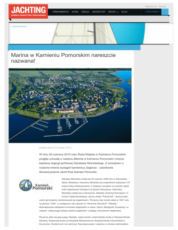 Rejestracja Zaloguj PRENUMERATA KIOSK GIEŁDA NAWIGATOR NEWSY BLOG KONTAKT ‹ POPRZEDNI NEWS Delphia 16 - jacht szkoleniowy Marina w Kamieniu Pomorskim nareszcie nazwana! W dniu 29 czerwca 2015 roku Rada Miejska w Kamieniu Pomorskim podjęła uchwałę o nadaniu Marinie w Kamieniu Pomorskim imienia kapitana żeglugi jachtowej Zdzisława Michalskiego. Z wnioskiem o nadanie imienia wystąpili kamieńscy żeglarze - członkowie Stowarzyszenia Jacht Klub Kamień Pomorski. Zdzisław Michalski urodził się 22 czerwca 1929 roku w Warszawie. Ojciec Zdzisława, Kazimierz Michalski był urzędnikiem kolejowym. Po wojnie kolej zmilitaryzowano, a kolejarzy wysyłano na zachód, gdzie mieli organizować transport na Ziemie Odzyskane. Kazimierz Michalski znalazł się w Szczecinie. Zdzisław ukończył Gimnazjum i II Liceum Ogólnokształcące, słynny wtedy "Pobożniak". Jeszcze jako uczeń gimnazjalny zainteresował się żeglarstwem. Pierwszy rejs morski odbył w 1947 roku na jachcie "Orlik", w następnym roku pływał na "Generale Zaruskim". Wiedzę i doświadczenie zdobywał na kursach żeglarskich w Ustce, Gdyni, Mrzeżynie, Kruszwicy i w Jastarni, zdobywając kolejne stopnie żeglarskie i zostając instruktorem żeglarstwa. Pływanie stało się jego pasją. Niestety, wada wzroku uniemożliwiła studia w Wyższej Szkole Morskiej. Rozpoczął studia na Wydziale Mechanicznym Wyższej Szkoły Inżynierskiej w Szczecinie. Studiów tych nie ukończył. Represjonowany i więziony w okresie stalinowskim, TWÓJ KOSZYK wyrokiem Sądu Pomorskiego Okręgu Wojskowego w Bydgoszczy został skazany na podstawie art.15 pkt.2 z KKWP i art.87 KKWP na karę dwunastu lat więzienia z utratą praw publicznych i obywatelskich, oraz utratą mienia. Wyrok dotyczył skazania z przyczyn politycznych. Karę więzienia odbywał w Bydgoszczy i w Koronowie, w okresie od 21 lutego 1953 do 21 marca 1955 roku. W dniu 20 lipca 1953 roku, w więzieniu w Bydgoszczy, zawarł małżeństwo z Marią Aliną Towiańską. Na wolność wyszedł w ramach amnestii związanej z "odwilżą". W dniu 15 września 1957 roku urodziła im się córka, Lidia. W związku z pobytem w więzieniu, jako osoby politycznie podejrzane, Zdzisław Michalski i jego żona borykali się z trudnościami w znalezieniu pracy. Po znalezieniu pracy, w latach 1956-1966, kolejno pracował jako kierownik przygotowania produkcji w Stoczni Jachtowej w Szczecinie, w Przedsiębiorstwie Połowów Dalekomorskich i Usług Rybackich "Gryf" oraz w Polskim Rejestrze Statków. W latach 1973-1974 Zdzisław Michalski dowodził szkunerem "Zew Morza" (Kadłub zbudowany w 1943 w stoczni w Dziwnowie, porzucony w 1945, odbudowany, wykończony i ponownie wodowany w 1949 w Stoczni Północnej w Gdańsku), w trwającym 388 dni rejsie dookoła świata. W rejsie tym uczestniczył mieszkaniec Kamienia Pomorskiego Ryszard Krawczyk. W czasie tego rejsu żeglarze przebyli ponad 34 tysiące mil morskich, odwiedzili 32 porty dwudziestu państw. Jedna czwarta pobytu w morzu przypadła na dni sztormowe. Rejs dookoła świata został wyróżniony nagrodą, Rejs Roku 1974. Transatlantycka wyprawa, związana z udziałem w Operacji Żagiel 1976, została wyróżniona nagrodą Rejs Roku 1976. Był to znaczący i pełen sukcesów okres w życiu Zdzisława Michalskiego. Zew Morza zatonął na Morzu Śródziemnym w przeddzień wprowadzenia stanu wojennego w dniu 12 grudnia 1981 roku. Zdzisław Michalski zmarł nagle 15 lutego 1986 roku, w wieku lat 56, w miejscu swego zamieszkania na ul. Elizy Orzeszkowej w Szczecinie. Został pochowany na Cmentarzu Centralnym. Uroczystości związane z nadaniem imienia odbędą się 21 lipca 2015 roku. Wszyscy żeglarze chcący odwiedzić w tych dniach Marinę Kamień Pomorski będą zwolnieni z opłat portowych od 20 do 22 lipca. Swój udział w uroczystościach zapowiedziały wdowa o kapitanie Michalski Pani Maria Towiańska-Michalska oraz mieszkająca na co dzień w Stanach Zjednoczonych córka, Pani Lidia Epp. Obie Panie zapowiedziały przekazanie pamiątek po kapitanie Michalskim do powstającej w kamieńskiej marinie izby pamięci. fot. Kamil Czech Tagi: #Drogi wodne #Marina Autor Marek Świderski Podobne Nowa marina, nowa jakość Rozbitek - 16 miesięcy na Pacyfiku Popłyń po trawie - trasa Ostróda - Elbląg już czynna! Nagroda Przyjaznego Brzegu 2014 Podziel się tym wpisem: + Komentarz PREZENT ŻEGLARSKI Szukasz pomysłu na prezet dla bliskiego? Spraw mu żeglarski upominek. Przejdź do zamawiania BLOG - CO LUDZIE PISZĄ? Ile kosztuje ubezpieczenie jachtu (i dlaczego tak drogo)? Żagle na zatoce Jachty nie tylko dla wytrawnych morskich wilków, czyli wygoda i luksus na pełnym morzu All risk VS ryzyka nazwane, czyli jak ubezpieczyć się od walenia. BIZNES CUP w Pucku Ubezpieczenie na rejs: 7 rzeczy, których nie da Ci karta EKUZ. OnkoRejs na Zjawie WIĘCEJ KUP KATALOG JACHTY Nowość na rynku! Jedyny taki katalog z łodziami, jachtami motorowymi oraz żaglowymi, z którego można korzystać także w wersji on-line na komputerach. Publikacja zawiera opisy oraz piękne zdjęcia ponad 400 jednostek. Dzięki sortowaniu łodzi wg ceny, oferty są przejrzyste i czytelne. WIZYTÓWKI W NAWIGATORZE FIRM www.szkutnia.com Kadłuby i remonty jachtów Sklep Żeglarski Hobby Speedyacht Czartery jachtów żaglowych Sierra Leone International Ship Registry OGŁOSZENIA W GIEŁDZIE Chorwacja - czarter jachtów, Last Minute Jacht morski Beneteau 10,5 m PROMOCJA!! Sprzedam jacht typu "Venus" 1996 r. Stalowy Van de Stadt, jacht morski 100 000.00 zł 15 000.00 zł 70 000.00 zł (c) MarineConsulting 2010-2015 kadłub jachtu pasja 800 24 000.00 zł